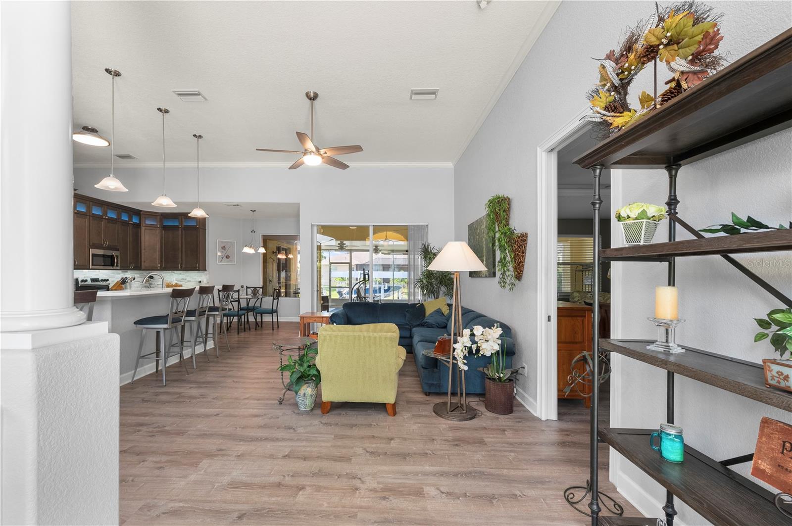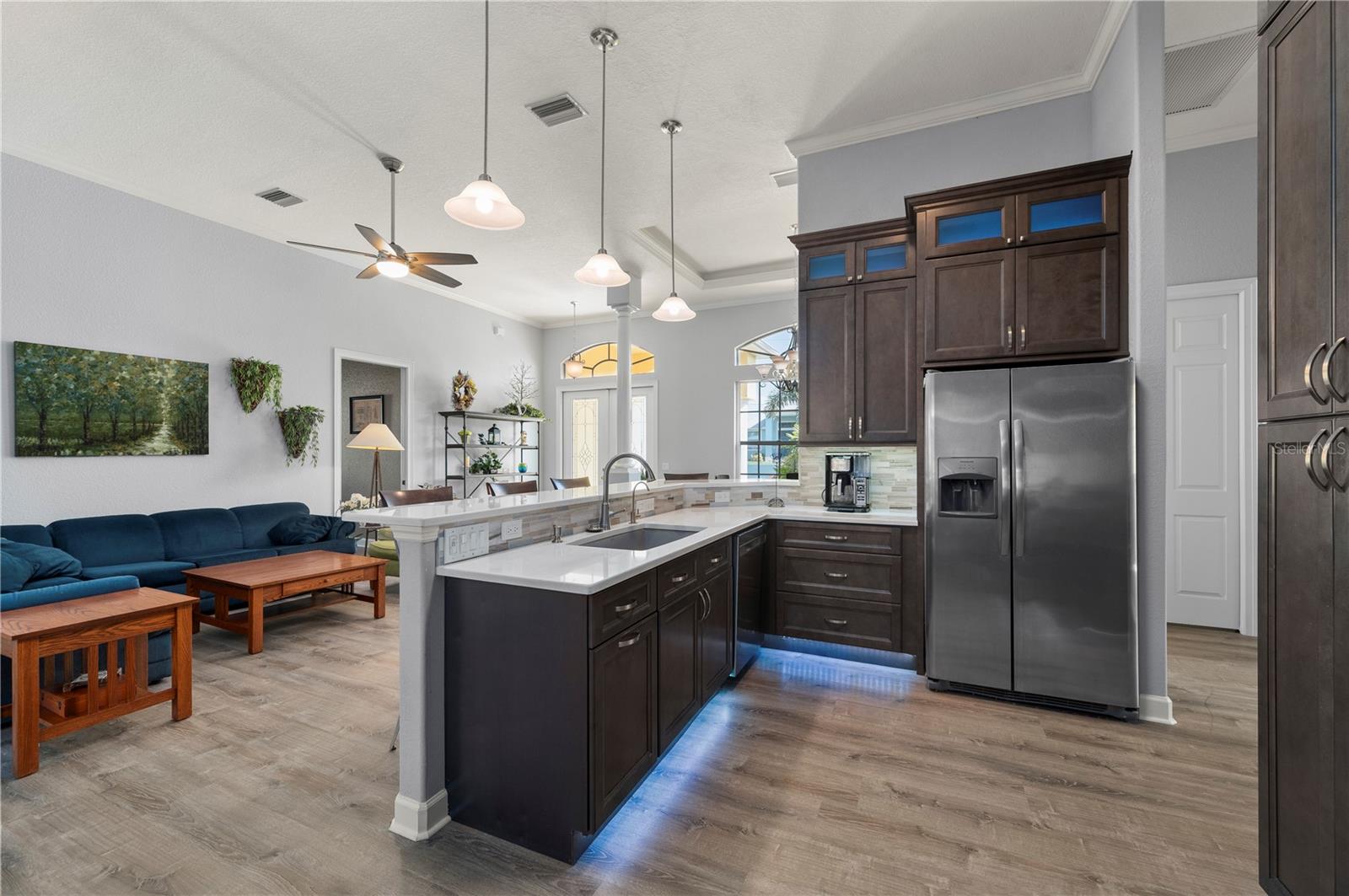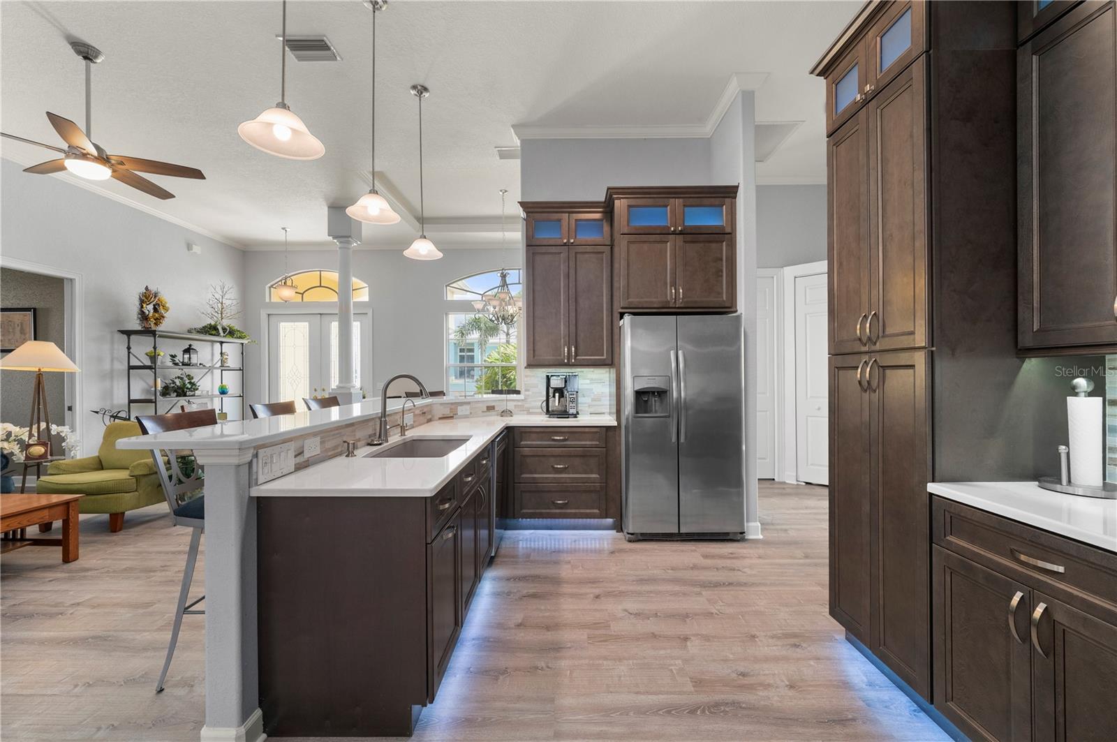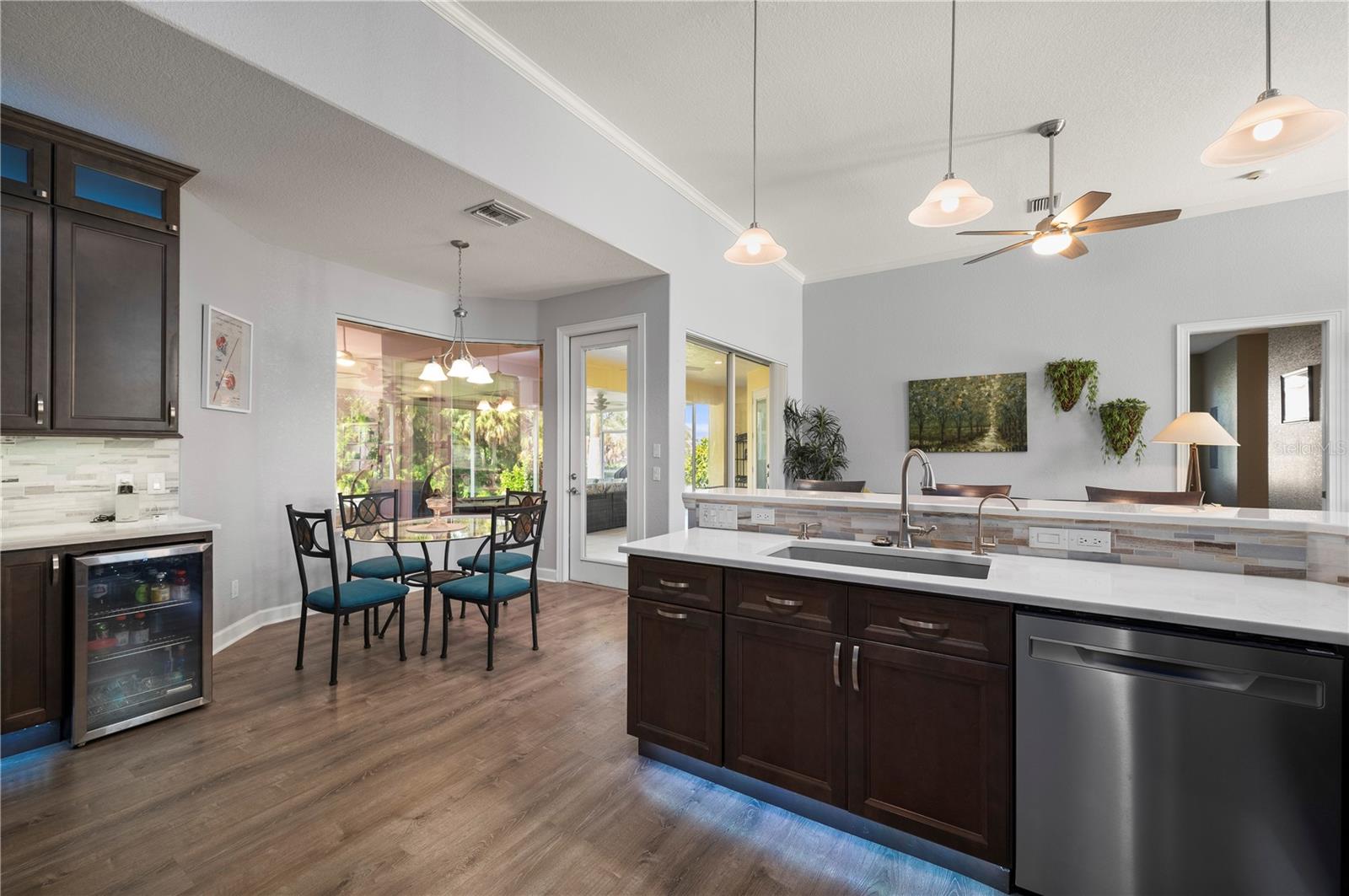 Palm trees sway gently along the canal's edge, where 160 feet of pristine waterfront set the stage for the ultimate coastal lifestyle- all from this move-in ready 3 bedroom, 3 bath home with detached 3 car garage and a private in-law suite on nearly half an acre. From your private dock-complete with a boat lift-you're just moments from the open waters of Peace River and onto Charlotte Harbor, a paradise for boaters and anglers alike. This custom-designed home unfolds with thoughtful grandeur. Beautiful wood-look plank tile stretches throughout a bright, open layout tailored for gathering and entertaining. Volume ceilings and crown molding add elegance, while the spacious kitchen commands attention with stone counters, a wine refrigerator, 2020 stainless appliances, a tile backsplash, under-cabinet accent lighting, and ceiling-height cabinetry for extra storage. A breakfast bar and a panoramic-windowed nook offer perfect spaces to start the day-all overlooking serene water views. The main living space flows effortlessly into a cozy family room/den complete with a full bathroom. Down the hall, a large bonus room-currently used as an office-adds flexibility with custom cabinetry down the hall to adapt to your lifestyle. Two additional bedrooms provide comfort for guests or family-one with direct access to the lanai and backyard. Privately tucked away, the primary suite is a retreat in every sense, with a tray ceiling, sitting area, and sliding glass doors that open directly to the lanai. The ensuite bath offers dual walk-in closets, a soaking tub, and a walk-in shower. Step outside to the oversized, tiled screened lanai, a true extension of your living space with screen/projector- ideal for quiet mornings or evening cocktails, all with peaceful water views as your backdrop. Just across the breezeway, a detached three-car garage includes a converted workshop in the third bay- and a private-entry one-bedroom, one-bath apartment with kitchenette, perfect for in-laws, guests, or long-term stays. This home offers more than space- it offers lifestyle. Recent upgrades include a 2025 dishwasher, 2023 AC condenser, 2022 whole-home generator, 2021 well pump, and 2020 roof. Located in Palm Shores, a peaceful, non-HOA community with no deed restrictions, you'll enjoy rare freedom with a prime location just minutes to Punta Gorda, I-75, and Punta Gorda Airport. For the boater, entertainer, multi-generational household, or anyone seeking privacy and elegance by the water -this home is ready to elevate every day.