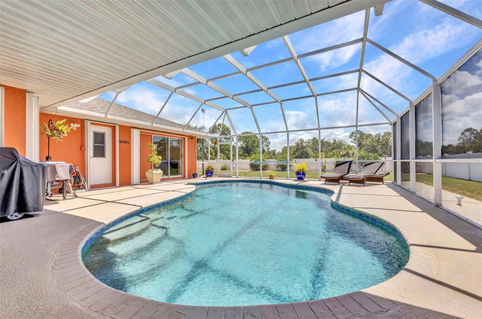 **Discover Your Slice of Paradise in Punta Gorda!** Welcome to this fabulous heated POOL home nestled on a private greenbelt in the popular golf community of Deep Creek! As you approach the home, you'll be greeted by a charming circular driveway that provides ample parking for guests and sets the stage for your first impression including fresh landscaping and St. Augustine grass with a new sprinkler system added in 2022. Step through the double door entrance of this 4 bed, 3 full bath home boasting an expansive layout of almost 2400 sq. ft. with soaring vaulted ceilings filling the home with natural light. The heart of this home is undoubtedly its FULLY RENOVATED KITCHEN, featuring sleek quartz countertops, high-end stainless-steel appliances, and ample custom cabinetry--ideal for culinary enthusiasts or family gatherings. The bedrooms are split with the primary owner's suite on one side providing access to the lanai through sliding glass doors, WALK IN CLOSET with ADDITIONAL LINEN CLOSET, ensuite RENOVATED BATHROOM with new floors and tiled shower. Back on the guest side there's plenty of space with one of the guest rooms featuring a full ensuite bathroom with walk in shower. Your other guest bathroom doubles as a POOL BATH! All bedrooms are spacious with HUGE CLOSETS! Step outside and immerse yourself in your own backyard oasis complete with a huge saltwater, heated pool that invites you to take a dip on sunny days or hold evening soirees under the stars. Surrounded by a FULLY FENCED YARD, privacy is paramount as you enjoy tranquil moments or lively celebrations with loved ones. This exceptional residence goes above and beyond with SO MANY UPGRADES YOU'LL NEED TO ASK FOR THE FULL FEATURE SHEET. Total hurricane protection and a new generator plug offers peace of mind! HVAC SYSTEM with complete duct cleaning, new vent covers and additional air return or better circulation was added in 2021. Halo WHOLE HOUSE WATER FILTRATION SYSTEM for crisp filtered water added in 2022. Roof 2018! Everything is done and this home is MOVE IN READY! Call today for a private showing. ASK FOR FULL FEATURE SHEET FOR MORE INFO ON ADDITIONAL UPGRADES.