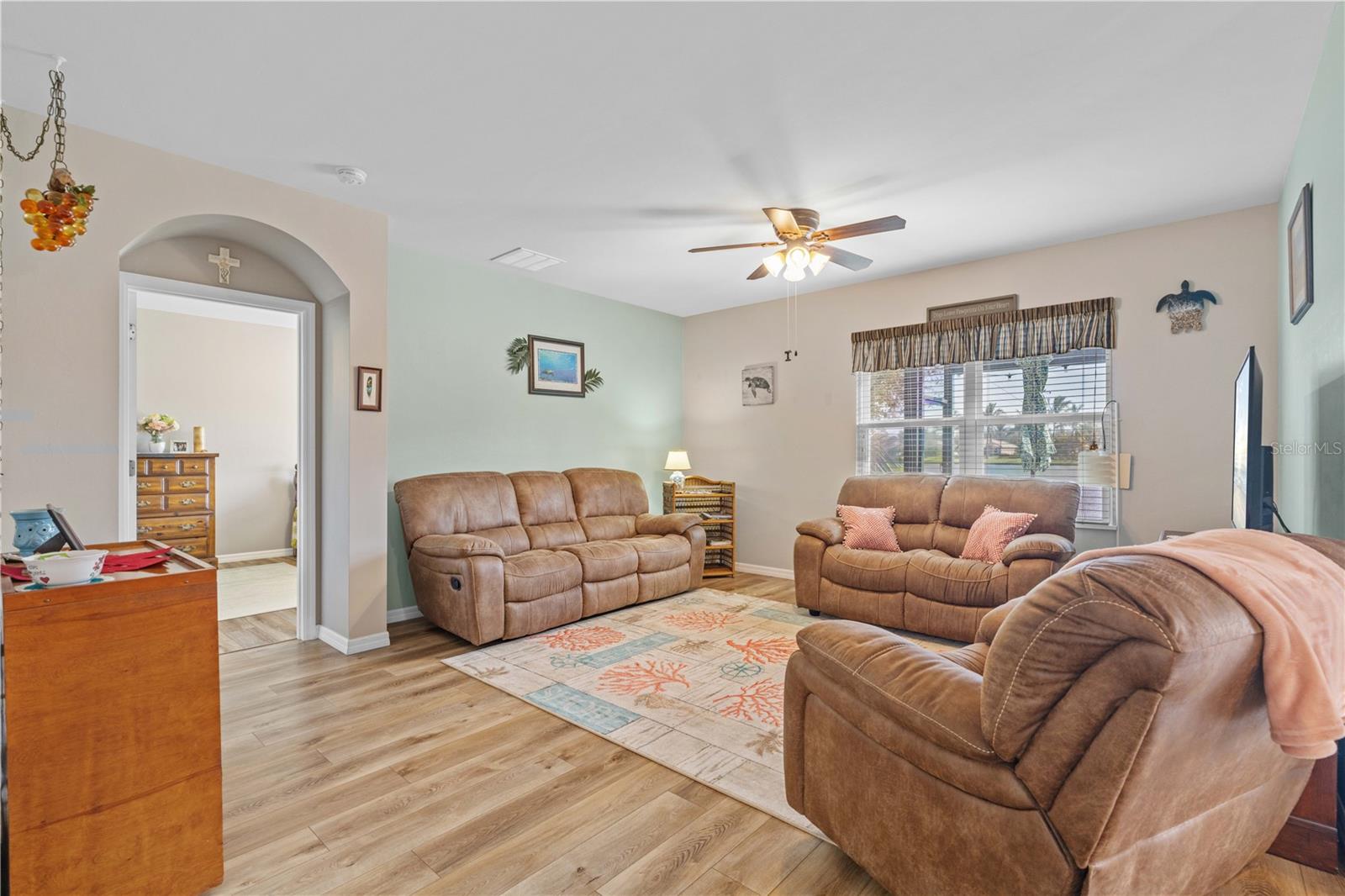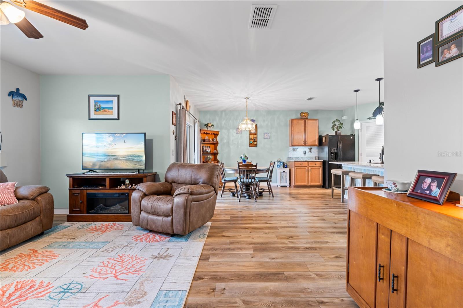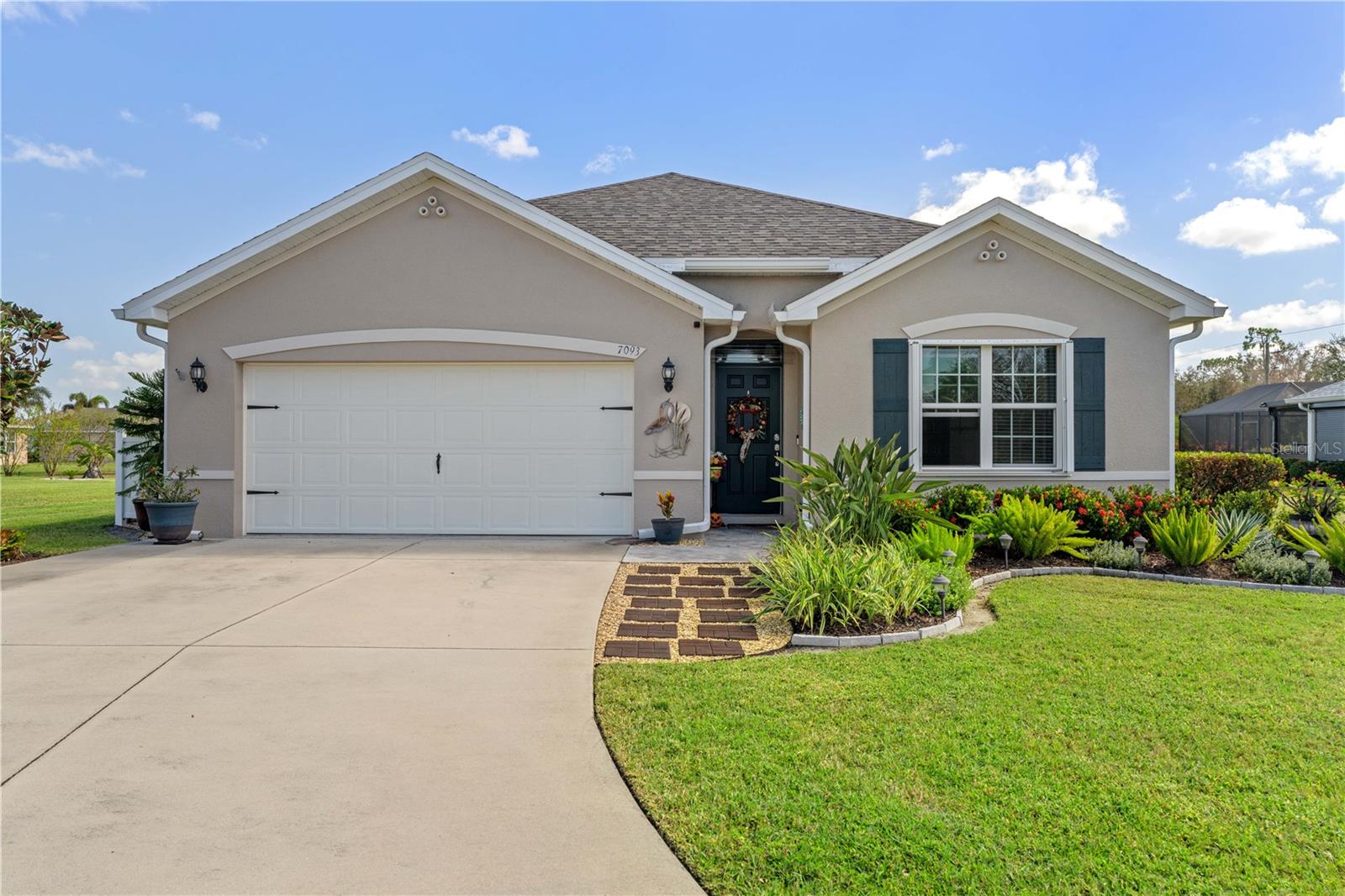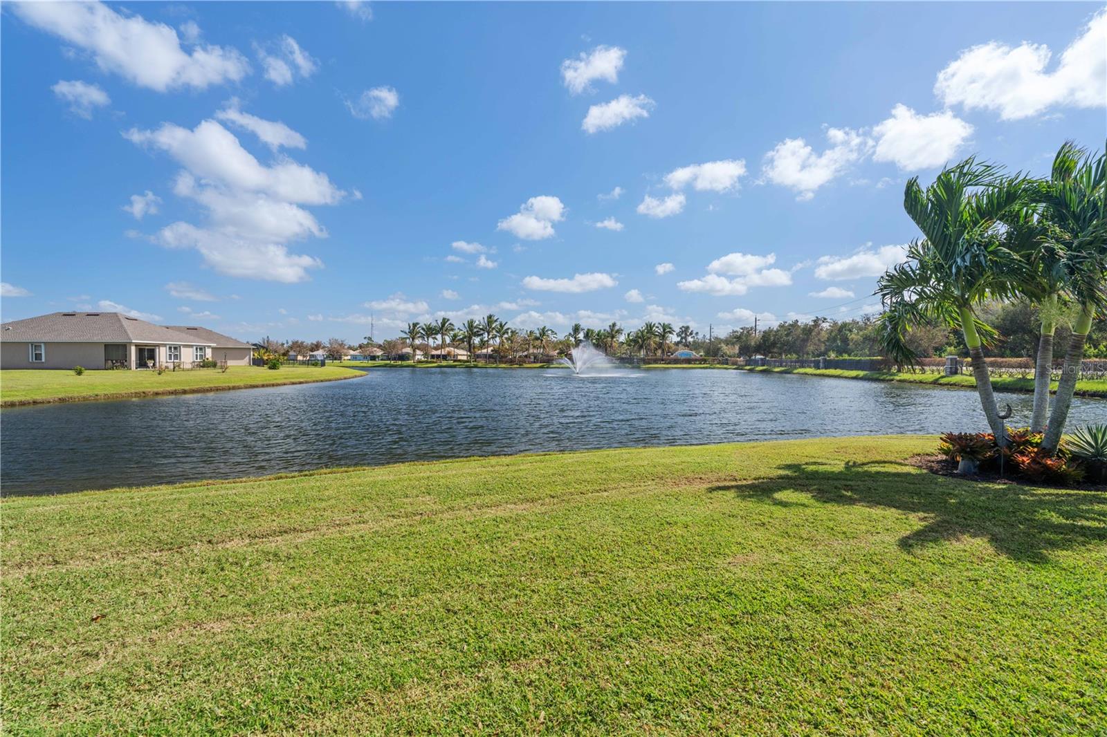 LAKEFRONT HOME ON OVERSIZED LOT IN WATERFORD ESTATES This **FOUR** bed/TWO bath home, located in the gated community of Waterford Estates, commands one of the neighborhood's most desirable oversized lots with an extra-wide footprint and an unforgettable lake view. From your lanai, watch the water shimmer with a central fountain framed by lush landscaping and wide open skies. The community offers two pools, a clubhouse with fitness, billiards, and cards, plus pickleball and bocce courts -- all just minutes from historic downtown Punta Gorda, Fishermen's Village, US41, I-75, and PGD airport. Lawn care, trimming, irrigation, and recreation facilities are covered by low quarterly HOA fees. Inside, the open-concept layout is anchored by a coastal-inspired chef's kitchen featuring brand-new counters, a striking center island with pendant lighting, rustic paneling detail, a breakfast bar, and a walk-in corner pantry. The kitchen flows into the spacious dining area and great room, where UV-protected windows and sliding glass doors bring in the lake view and natural light. Warm-toned luxury vinyl plank flooring runs throughout the main living areas, creating a seamless sense of space and style. The master retreat offers an en-suite, private bath with dual sinks, a large linen closet, and shower with adjustable shower head plus an oversized walk-in closet. Three guest bedrooms share a bright guest bath with combination tub/shower. Outdoor living takes center stage with an L-shaped, picture-frame-screened lanai finished in stamped concrete, creating a breezy extension of the home's living space. The backyard unfolds to a manicured lawn that meets the water's edge, providing unobstructed views and a serene setting for morning coffee. With a widened driveway, whole-house hurricane protection, gas generator hookup, new roof (2022), and fresh exterior paint (2024), this lakefront beauty is truly move-in ready. Low-voltage lighting brightens up the home at night for a beautiful look. A privacy fence at the side of the home covers trash bins while providing additional storage for bikes or other items. Waterford Estates is a growing community w/two gated entrances, two pools, a community center w/catering kitchen, billiards & card rooms plus a fitness center, four pickleball & three bocce courts. Miles of sidewalks in Waterford's park-like setting provide a scenic backdrop to your evening stroll. Enjoy the tranquility of passing by lakes and manicured, tropical landscaping. Schedule your appointment today and experience the Waterford Estates lifestyle for yourself. Home has a transferrable flood policy w/$1,080 premium ($4,454 discount).