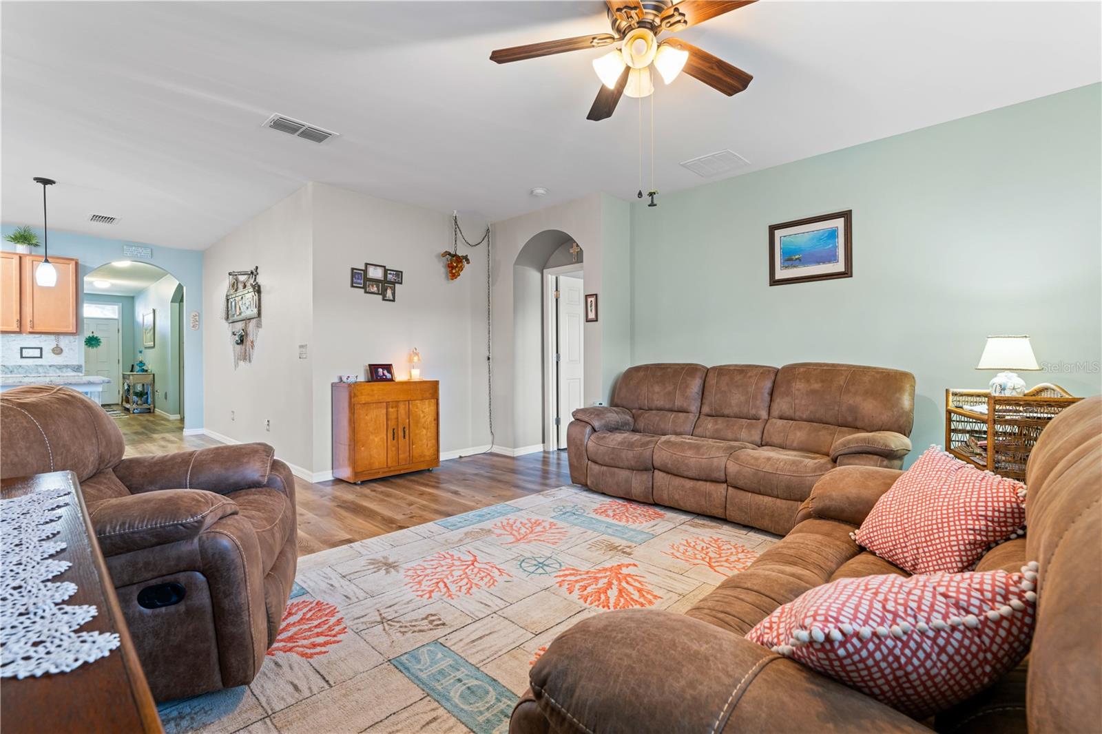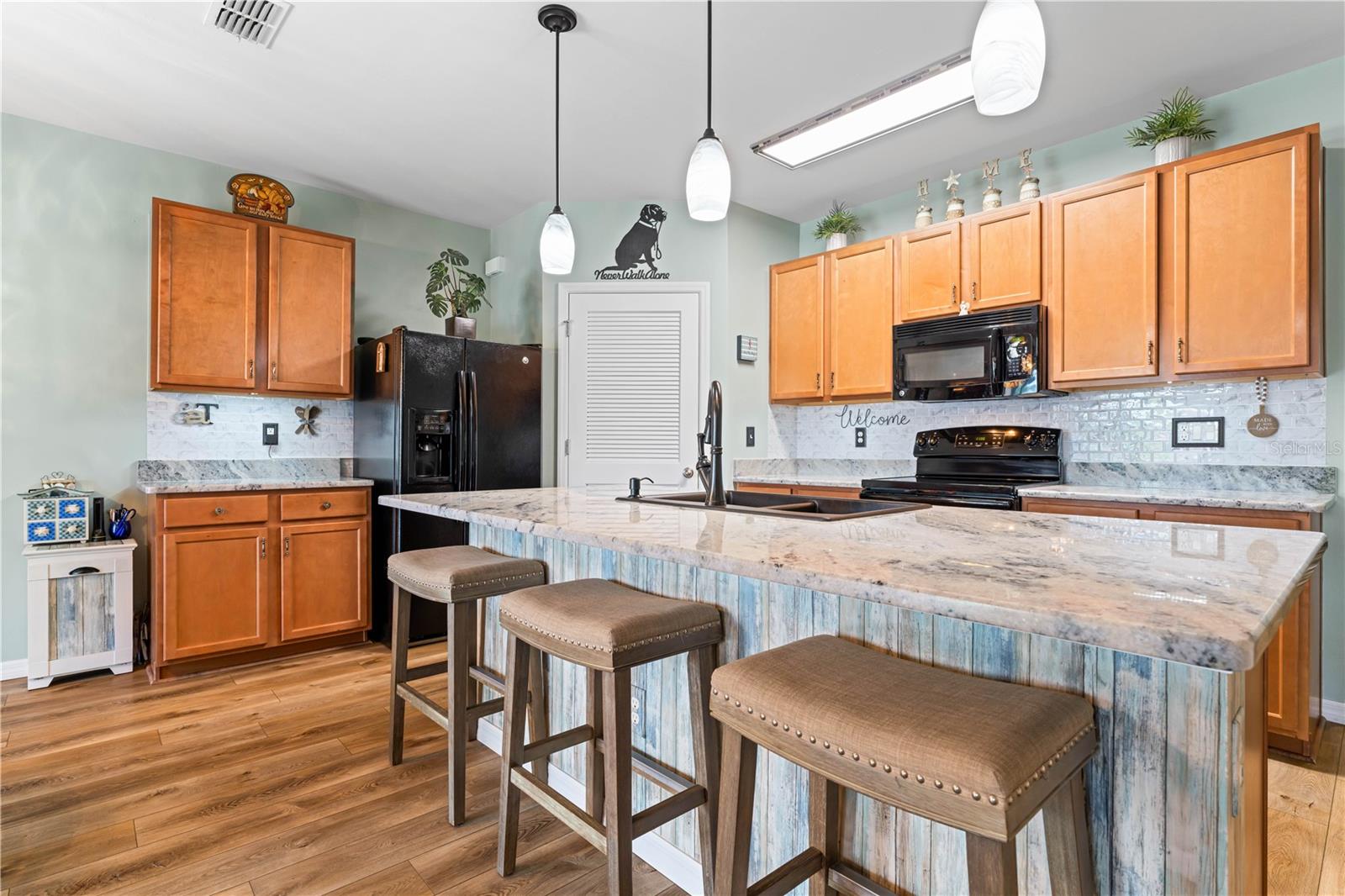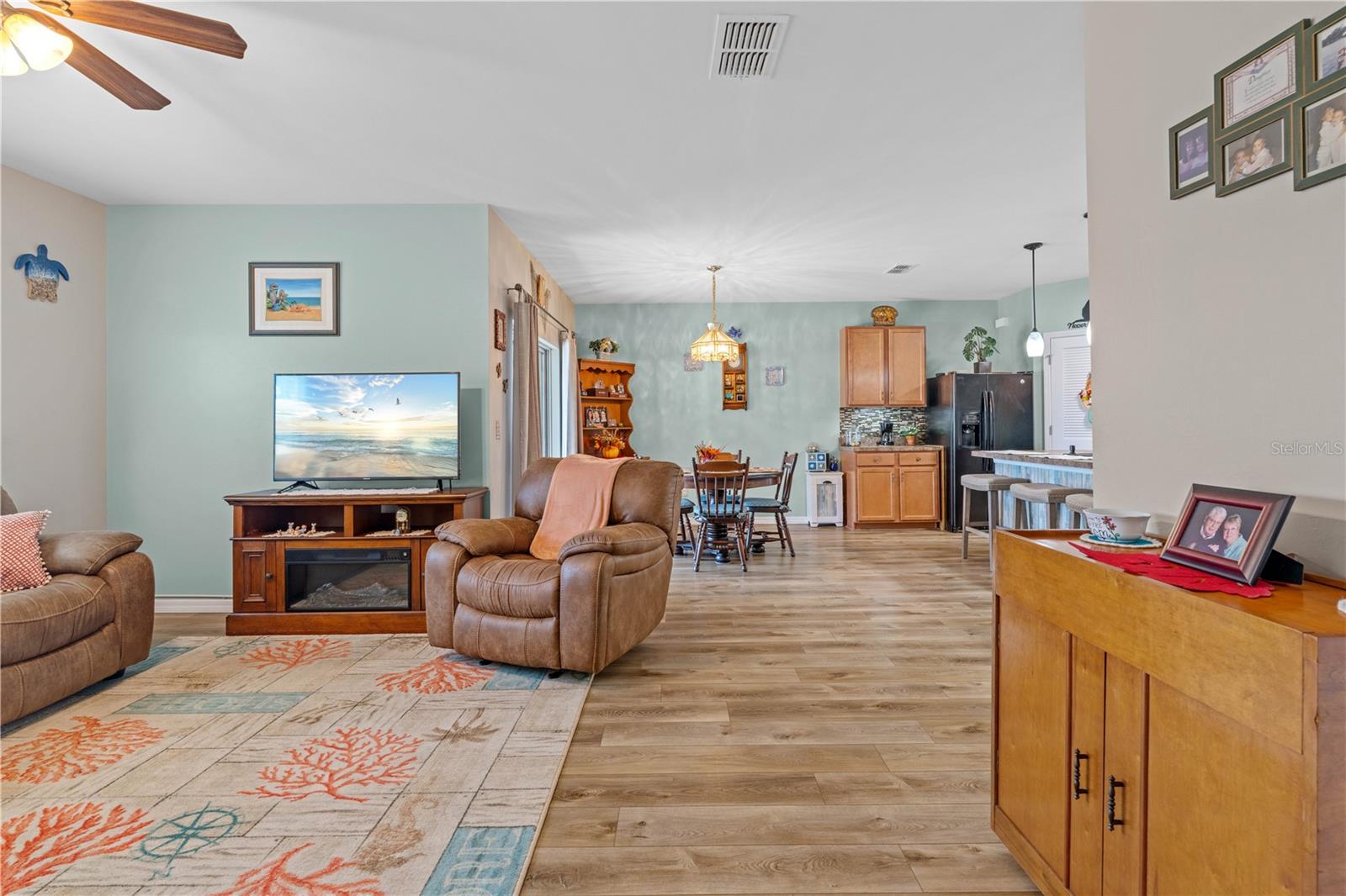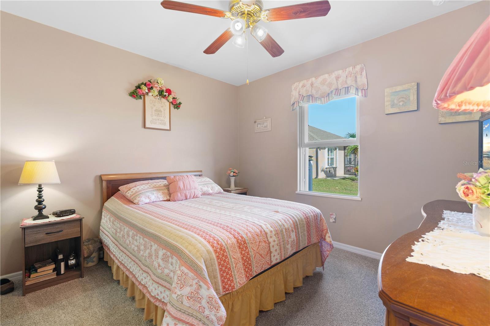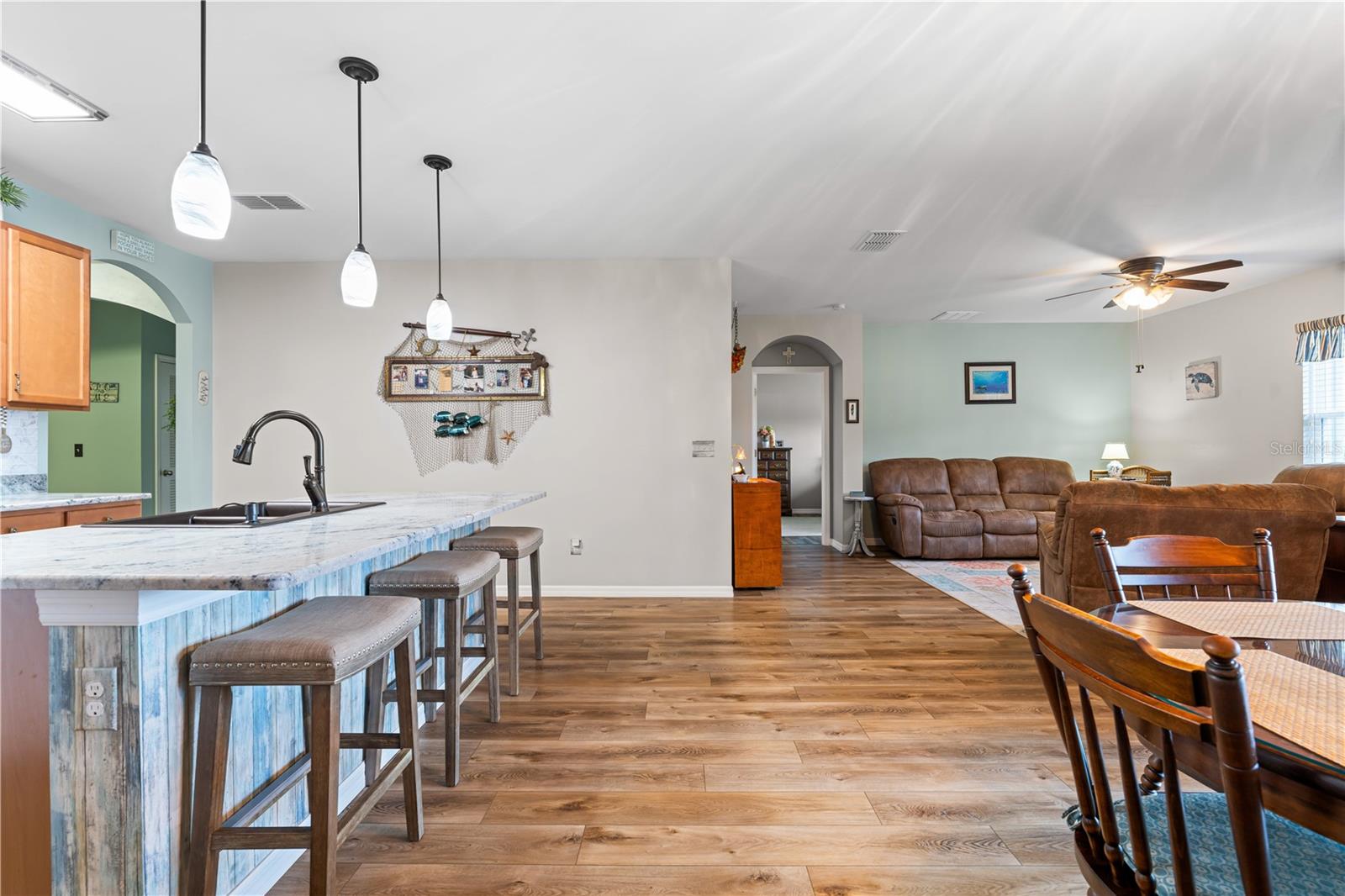 LAKEFRONT HOME ON OVERSIZED LOT IN WATERFORD ESTATES This **FOUR** bed/TWO bath home, located in the gated community of Waterford Estates, commands one of the neighborhood's most desirable oversized lots with an extra-wide footprint and an unforgettable lake view. From your lanai, watch the water shimmer with a central fountain framed by lush landscaping and wide open skies. The community offers two pools, a clubhouse with fitness, billiards, and cards, plus pickleball and bocce courts -- all just minutes from historic downtown Punta Gorda, Fishermen's Village, US41, I-75, and PGD airport. Lawn care, trimming, irrigation, and recreation facilities are covered by low quarterly HOA fees. Inside, the open-concept layout is anchored by a coastal-inspired chef's kitchen featuring brand-new counters, a striking center island with pendant lighting, rustic paneling detail, a breakfast bar, and a walk-in corner pantry. The kitchen flows into the spacious dining area and great room, where UV-protected windows and sliding glass doors bring in the lake view and natural light. Warm-toned luxury vinyl plank flooring runs throughout the main living areas, creating a seamless sense of space and style. The master retreat offers an en-suite, private bath with dual sinks, a large linen closet, and shower with adjustable shower head plus an oversized walk-in closet. Three guest bedrooms share a bright guest bath with combination tub/shower. Outdoor living takes center stage with an L-shaped, picture-frame-screened lanai finished in stamped concrete, creating a breezy extension of the home's living space. The backyard unfolds to a manicured lawn that meets the water's edge, providing unobstructed views and a serene setting for morning coffee. With a widened driveway, whole-house hurricane protection, gas generator hookup, new roof (2022), and fresh exterior paint (2024), this lakefront beauty is truly move-in ready. Low-voltage lighting brightens up the home at night for a beautiful look. A privacy fence at the side of the home covers trash bins while providing additional storage for bikes or other items. Waterford Estates is a growing community w/two gated entrances, two pools, a community center w/catering kitchen, billiards & card rooms plus a fitness center, four pickleball & three bocce courts. Miles of sidewalks in Waterford's park-like setting provide a scenic backdrop to your evening stroll. Enjoy the tranquility of passing by lakes and manicured, tropical landscaping. Schedule your appointment today and experience the Waterford Estates lifestyle for yourself. Home has a transferrable flood policy w/$1,080 premium ($4,454 discount).
