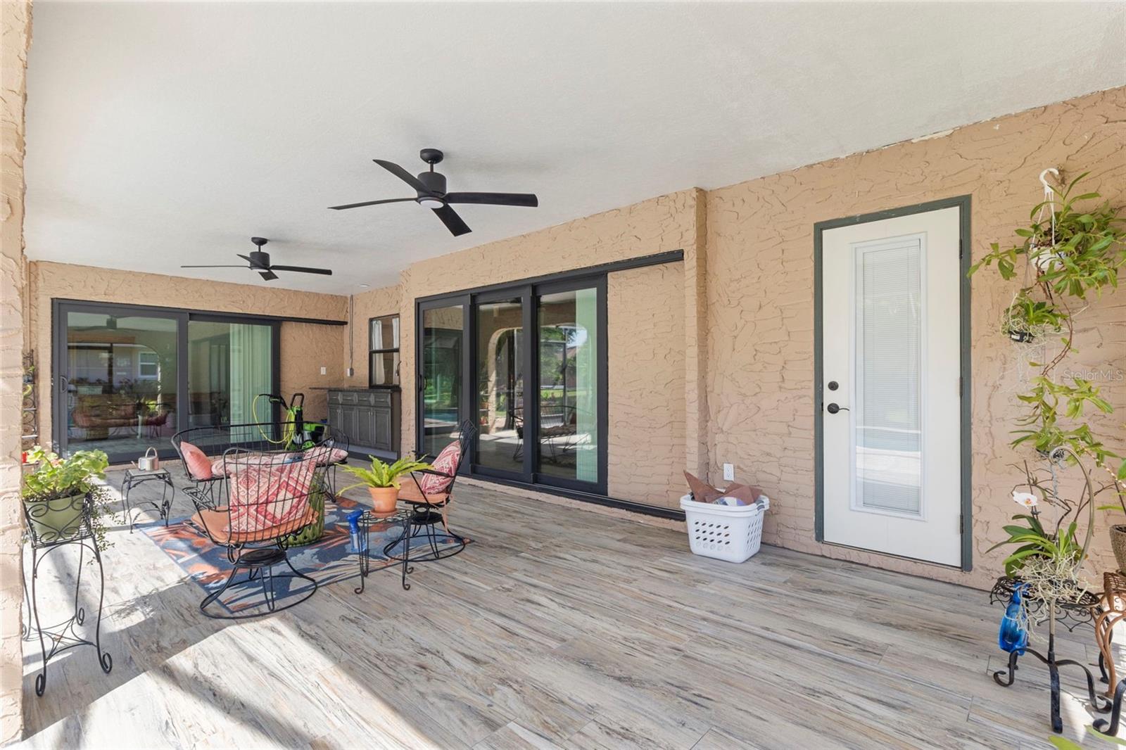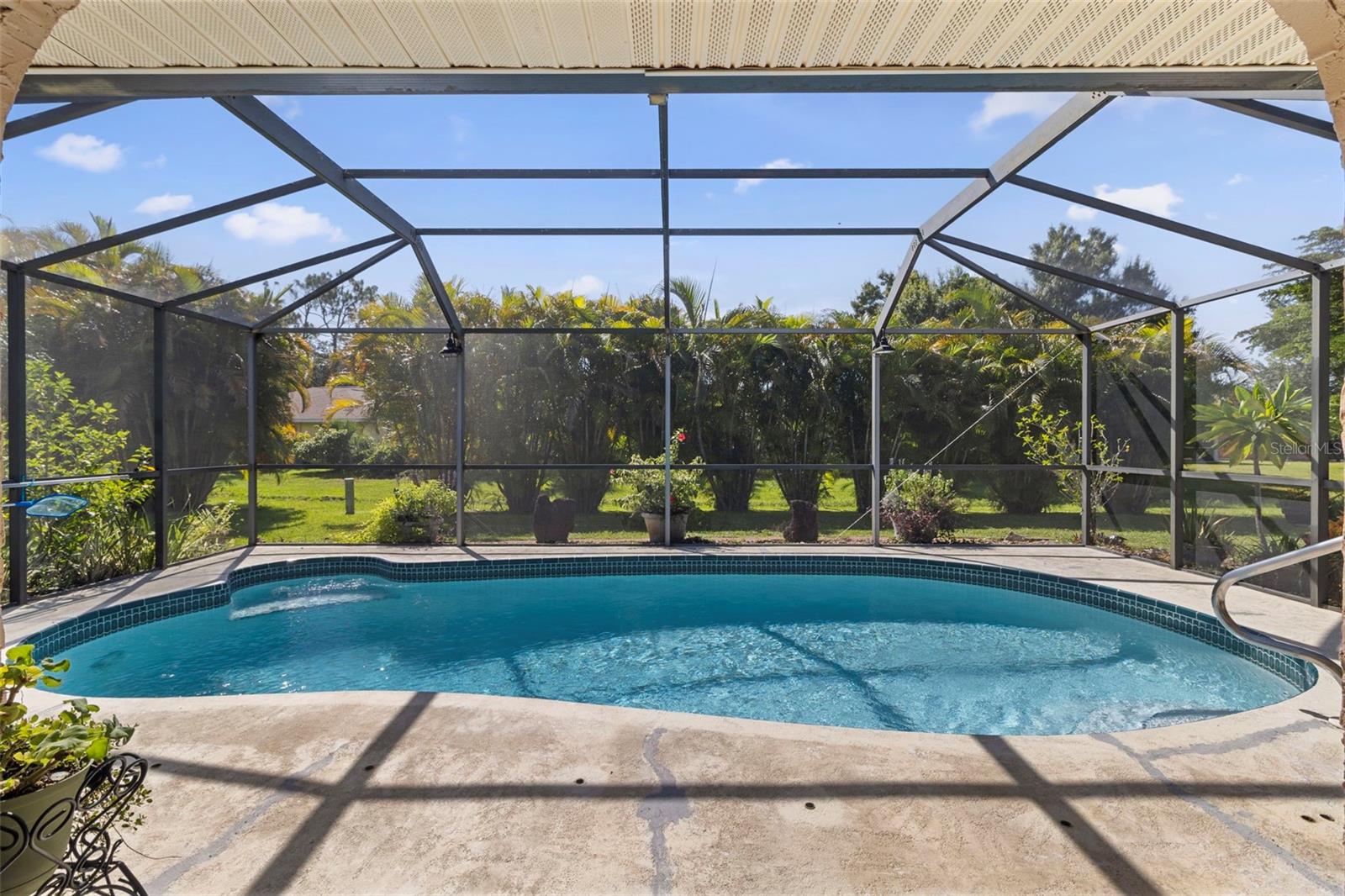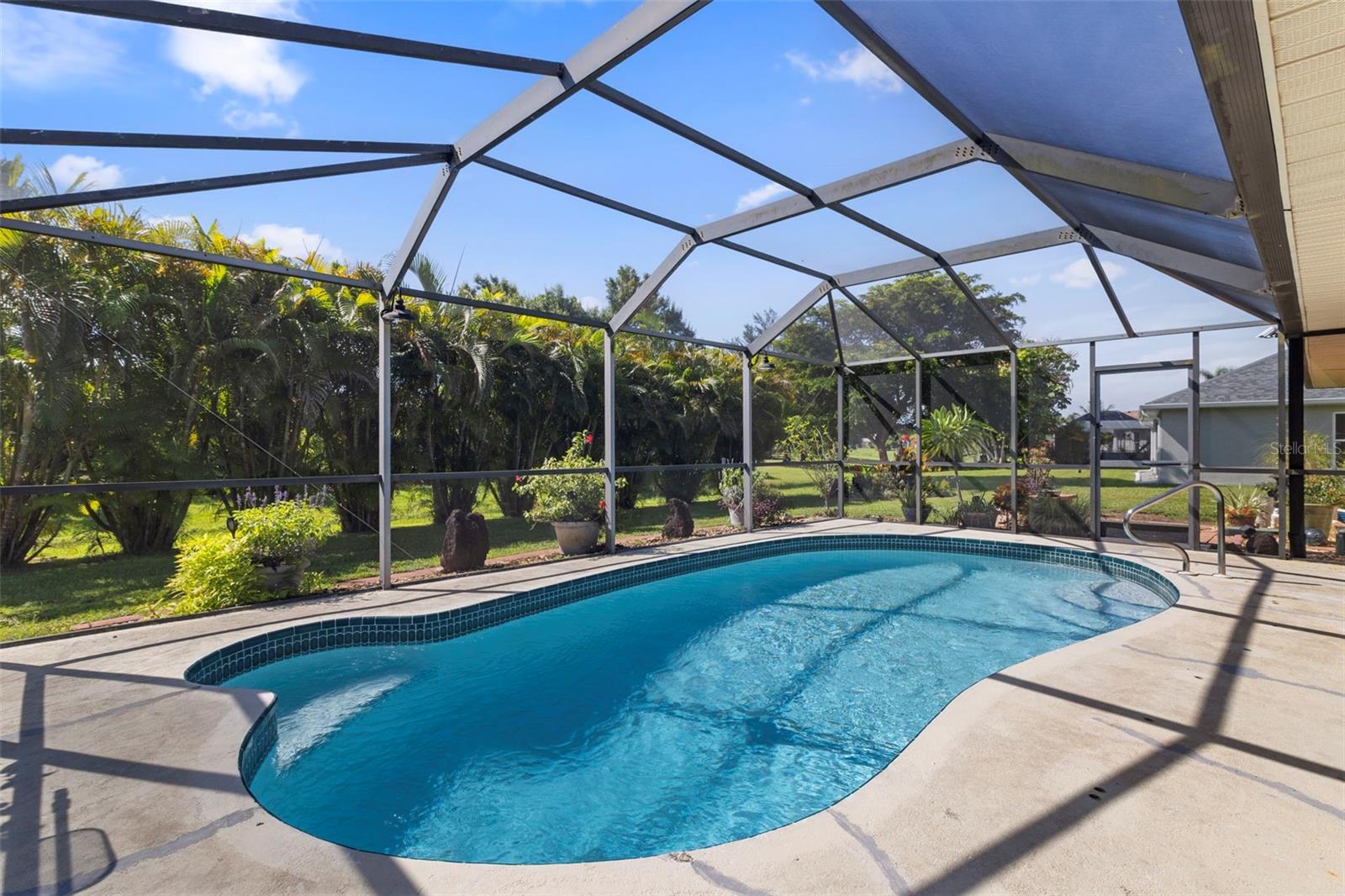 Don't miss this large update pool home in Deep Creek. This home has a split floor plan with many updates. The master bedroom/bath is out of a designer's book. The master has an electric fireplace with stacked stone. The master bath has a double vanity, large shower and a beautiful separate tub. Porcelain Tile has been installed in the main house and bathrooms, with beautiful wood flooring in the bedrooms and main living area. Both vanities have beautiful cabinetry. Primary bedroom has a large walk-in closet. The Kitchen has been updated with beautiful cabinets and stone counters as well as newer stainless-steel appliances. The guest bathroom has also been updated. The windows and patio doors have all been upgraded to impact doors and windows in 2019, new roof in 2022 and new hot water heater in 2024. The lanai is very nice and large. The pool has been resurfaced in 2025. This beauty is move in ready.