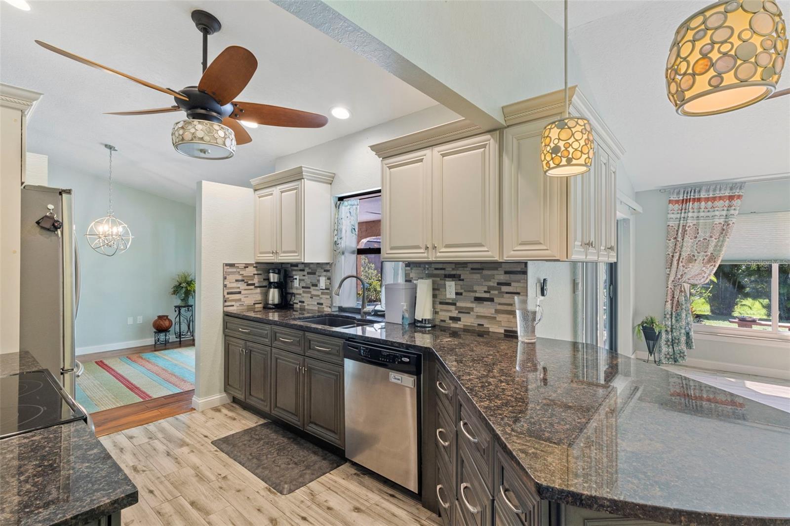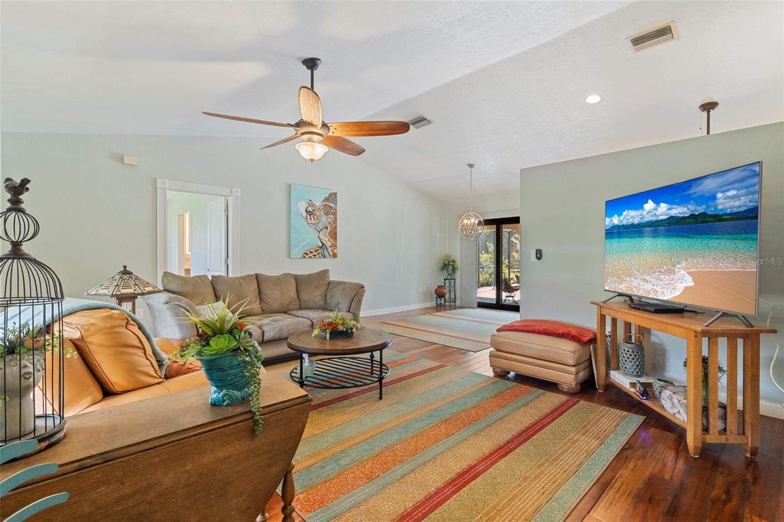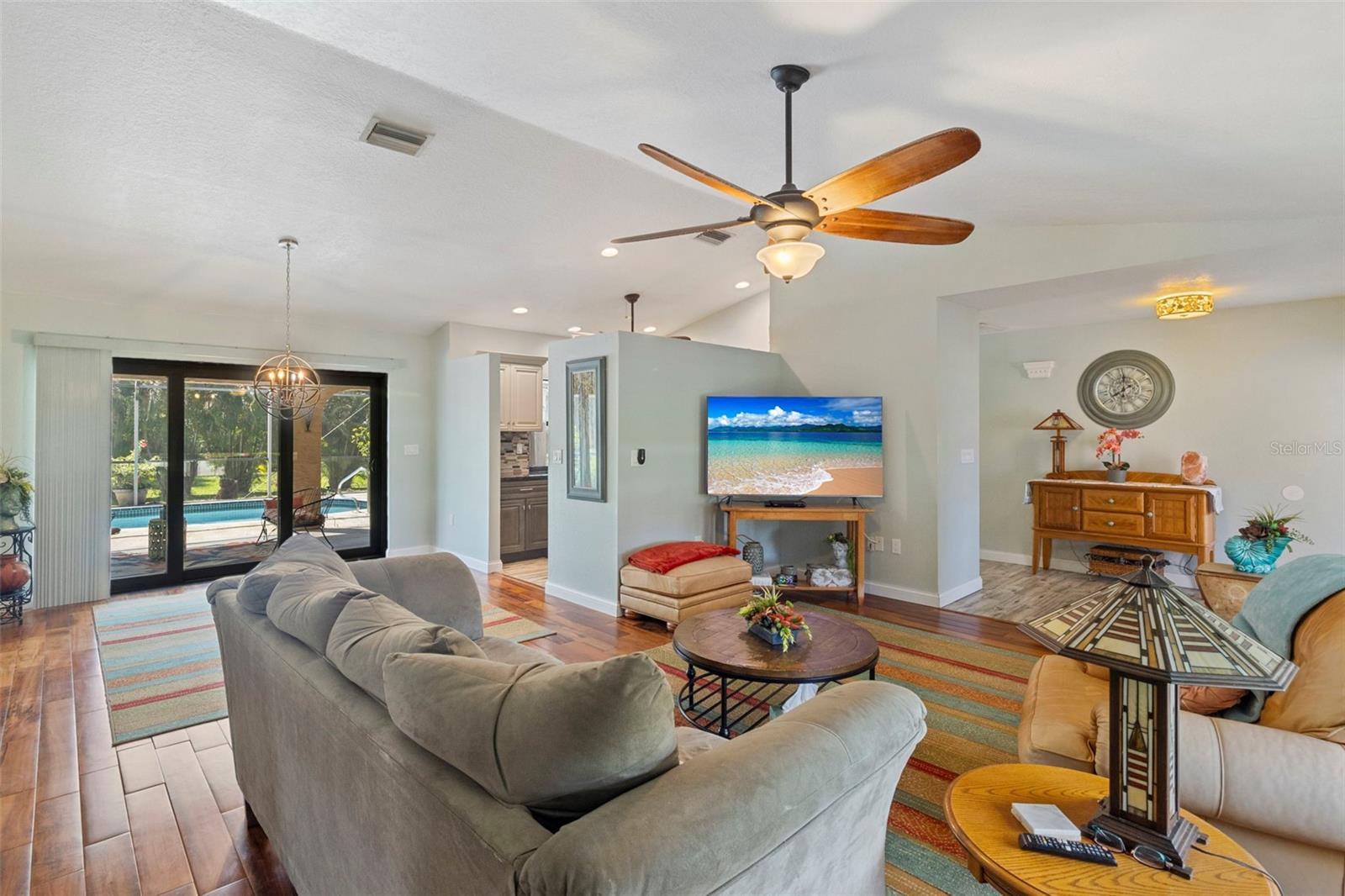 Don't miss this large update pool home in Deep Creek. This home has a split floor plan with many updates. The master bedroom/bath is out of a designer's book. The master has an electric fireplace with stacked stone. The master bath has a double vanity, large shower and a beautiful separate tub. Porcelain Tile has been installed in the main house and bathrooms, with beautiful wood flooring in the bedrooms and main living area. Both vanities have beautiful cabinetry. Primary bedroom has a large walk-in closet. The Kitchen has been updated with beautiful cabinets and stone counters as well as newer stainless-steel appliances. The guest bathroom has also been updated. The windows and patio doors have all been upgraded to impact doors and windows in 2019, new roof in 2022 and new hot water heater in 2024. The lanai is very nice and large. The pool has been resurfaced in 2025. This beauty is move in ready.
