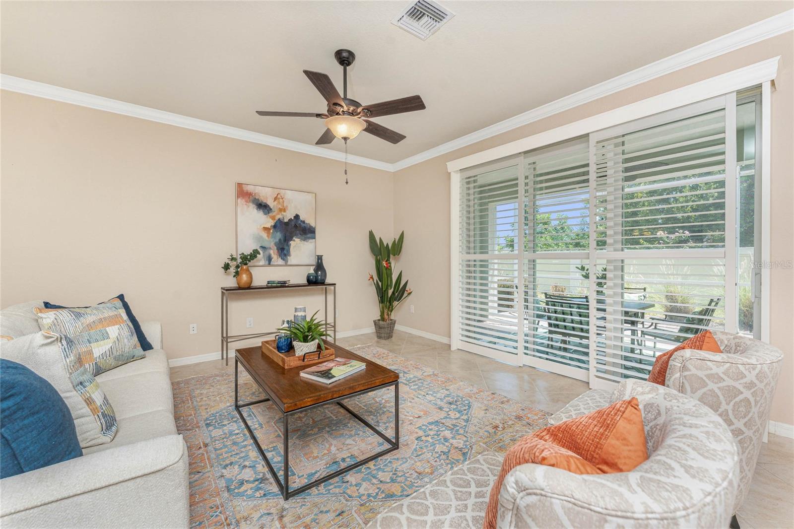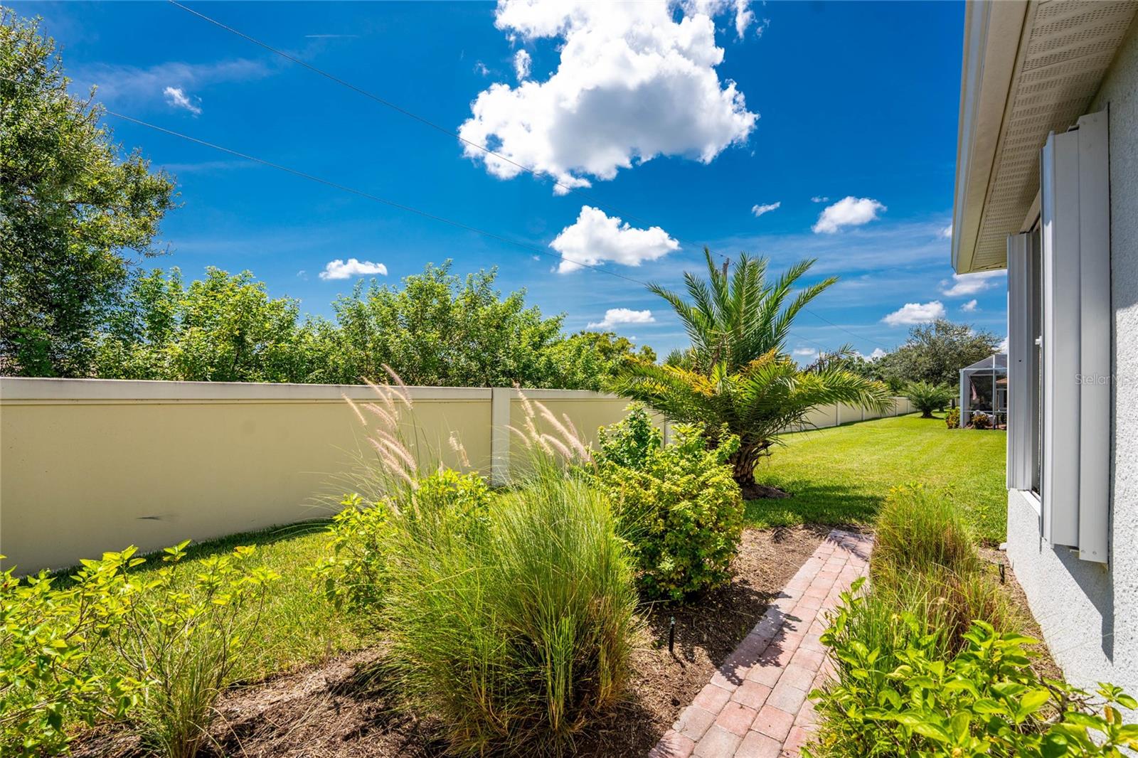 Exterior: Hurricane Shutters, Private Mailbox, Rain Gutters, Sidewalk, Sliding Doors