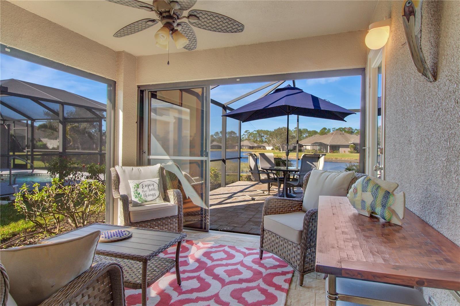 *3D INTERACTIVE VIRTUAL TOUR* Welcome to the Villas of Sabal Trace, one of the most desirable maintenance-free, gated, and pet-friendly communities. *TURN-KEY FURNISHED* This picturesque lakefront villa offering a relaxed and convenient lifestyle has 2 spacious bedrooms, 2 bathrooms, and a versatile BONUS room (w/closet) that can easily be transformed into a true 3rd bedroom, den, or office--perfect for whatever suits your needs. 2023 ROOF, A/C & Water Heater! Pull into the driveway and be met with lush, tropical landscaping from front to back including green grass, palm trees, curbing and the scent of flowers in bloom as you make your way down the walkway to be welcomed into your screened in front entryway. Open the front door to be greeted with an open and spacious Great Room that boasts high, vaulted ceilings, recessed lights, wood laminate floors, plant shelves, wood blinds and sliding glass doors to your backyard oasis. The open-concept design creates a bright, welcoming atmosphere, enhanced by cathedral ceilings and neutral tones throughout. The kitchen and dining area combo is the perfect spot for entertaining family and friends. The gourmet kitchen houses a breakfast bar, closet pantry, plant shelves, solid wood cabinets with decorative molding, Stainless Steel appliances (brand NEW fridge) and a built-in, in-lay, a nice spot for a hutch or coffee bar. The owner's suite is a true retreat, featuring direct access to the private EXTENDED PAVER LANAI, built-in closets (one walk-in) and an en-suite master bath complete with dual sinks and a walk-in-shower, combining both style and functionality. The split floor plan ensures the ultimate privacy for both you and your guests. The guest bedroom is filled with natural sunlight, ceiling fan, private closet and carpet. The well-appointed guest bath is right outside the bedroom, and includes a vanity, mirror, shower/tub combo and toilet. Convenience is key with a well-designed interior laundry room that comes with extra storage space, plus washer and dryer. Love the outdoors? There is not 1 but 2 outdoor areas this villa offers! Eat out in your enclosed Florida room that has screens plus vinyl inserts that serve as extra room...or unwind with a drink while catching the gorgeous sunset, grill or entertain in the oversized screened in lanai w/gorgeous LAKE VIEW that will make you feel like you're on vacation everyday! The Villas of Sabal Trace is a gated, pet-friendly community with no age restrictions, offering a safe and peaceful environment to call home. The community amenities are outstanding, with a heated pool, a clubhouse, a fitness room, and a variety of social activities to enjoy. With low HOA fees and no CDD fees, you can truly have it all--an exceptional home in an exceptional location. Conveniently located in the heart of North Port, this villa is close to everything you could need. You'll find shopping, dining, golfing, and medical facilities just minutes away, as well as a dog park, aquatic park, and the vibrant Downtown Wellen Park. The area also offers easy access to our beautiful Gulf Coast Beaches, making it the ideal location for those seeking both convenience and a relaxed, coastal lifestyle. This villa home is the perfect place to entertain and create lasting memories, don't miss the opportunity to make it yours! Put this on your MUST SEE list and make an appointment today!!