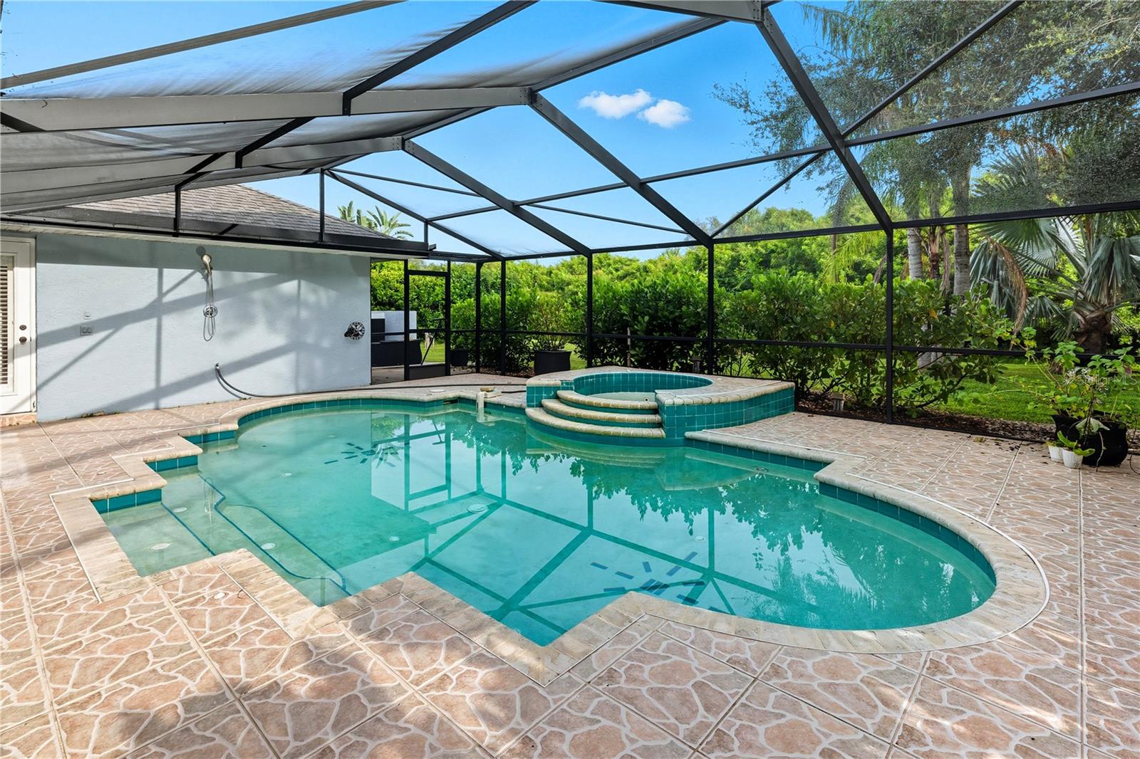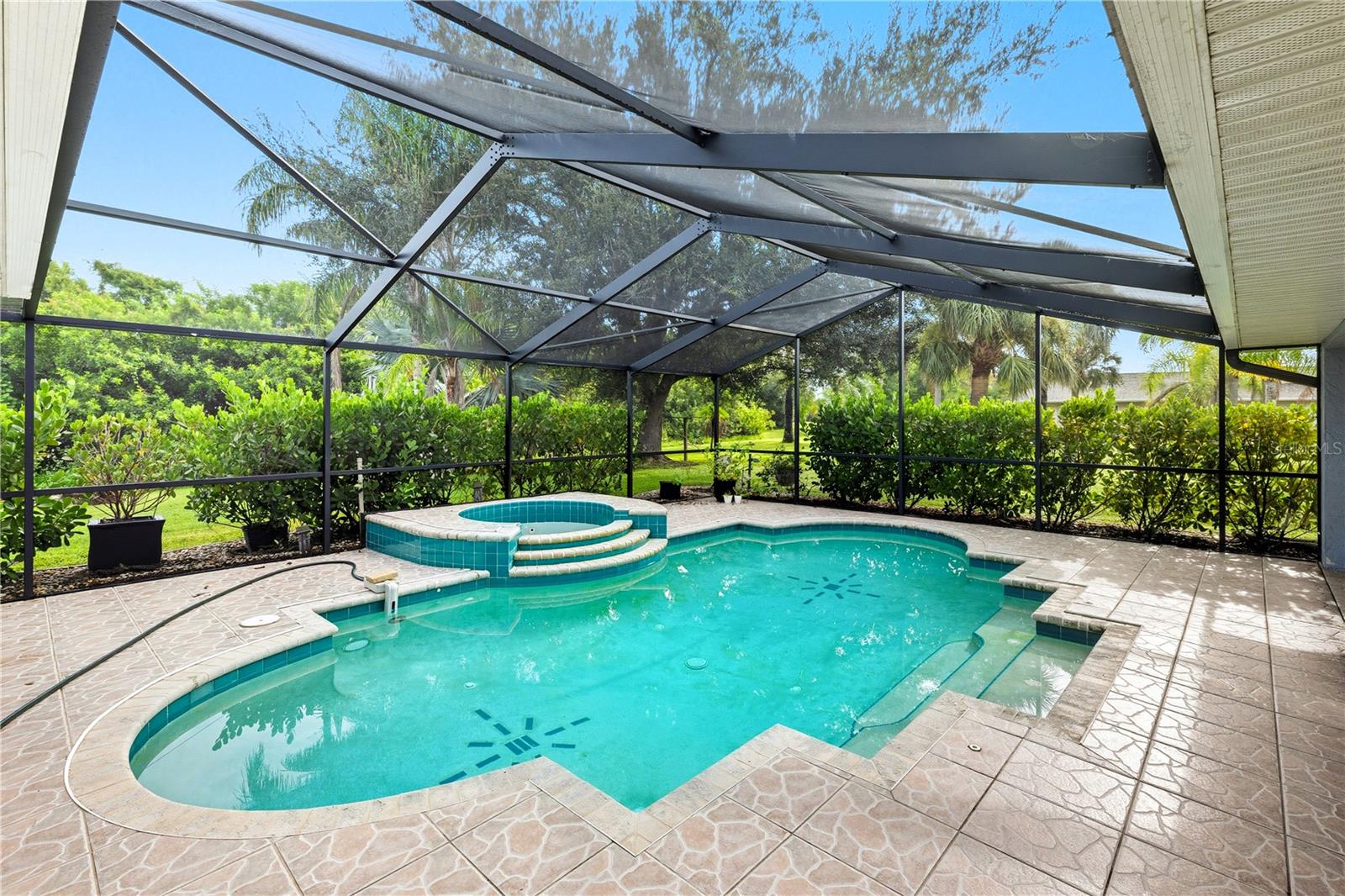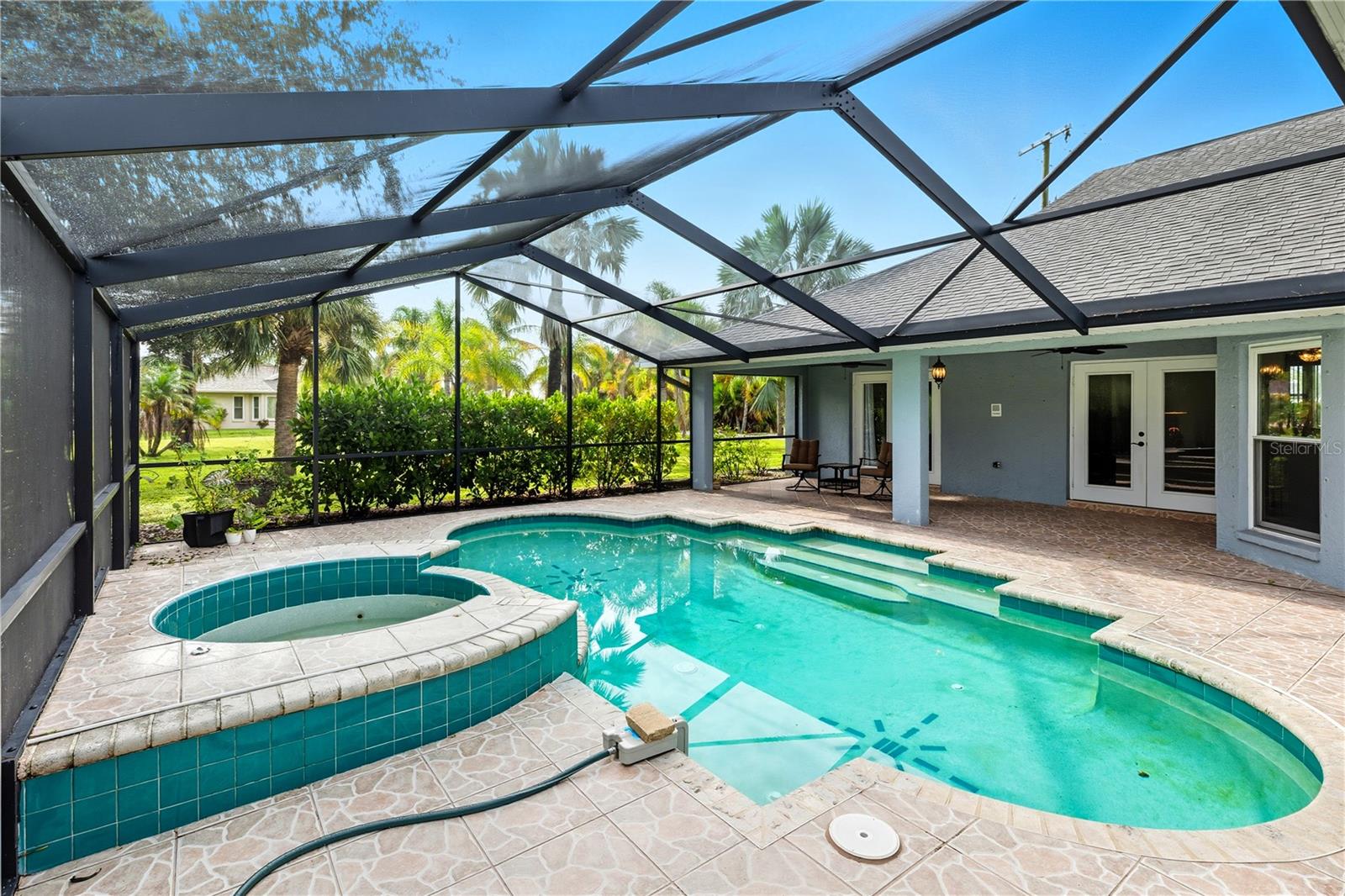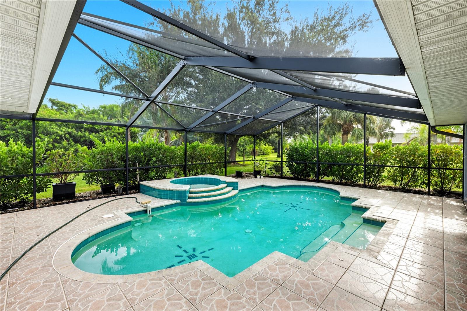 Welcome to this BEAUTIFUL 3-bedroom, 2-bathroom, 2-car garage, pool home located in the desirable Deep Creek community of Punta Gorda. CLICK ON THE VIRTUAL TOUR LINK 1 FOR THE VIDEO AND VIRTUAL LINK 2 FOR THE 3D TOUR. The French door entry opens to a welcoming foyer and a bright floor plan with high vaulted ceilings, and plenty of natural light, creating a spacious and airy feel. The living and dining room flow seamlessly to the kitchen, perfect for entertaining. The eat-in kitchen features granite countertops, stainless steel appliances, including a double oven, a built-in desk, and an abundance of cabinet and counter space. Just off the kitchen, the family room provides additional living space to relax or host guests. The expansive master suite is a true retreat with French doors leading to the lanai, a walk-in closet, and a spa-like private bathroom offering a dual sink vanity with makeup space, a jetted jacuzzi tub, and a walk-in shower with dual shower heads. Guest bedrooms are on a split floor plan, providing plenty of privacy, each with walk-in closets and easy access to the shared guest bath, complete with a dual sink vanity, walk-in shower, and convenient pool access. Step outside to your private oasis featuring a spacious screened lanai, heated pool and spa, outdoor shower, and plenty of room for lounging or entertaining. Surrounded by lush landscaping, this backyard is designed for both privacy and relaxation. Deep Creek is a deed-restricted neighborhood with amenities including Deep Creek Social Club, Deep Creek Park, featuring a playground, tennis courts, basketball courts, and Deep Creek Golf Course, just a couple of miles down the road --perfect for staying active or spending time outdoors. Easy access to local favorites such as Fishermen's Village, Ponce De Leon Park, shopping & boutiques, fine & casual dining, LIVE entertainment, and a short drive to local beaches.*Adjacent lot is available for purchase, Taxes reflect both properties, will be split and reassessed after closing*