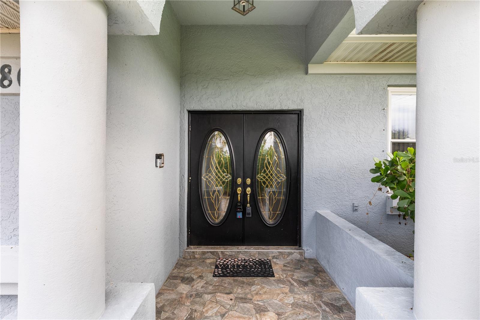 Exterior: French Doors, Lighting, Private Mailbox, Rain Gutters