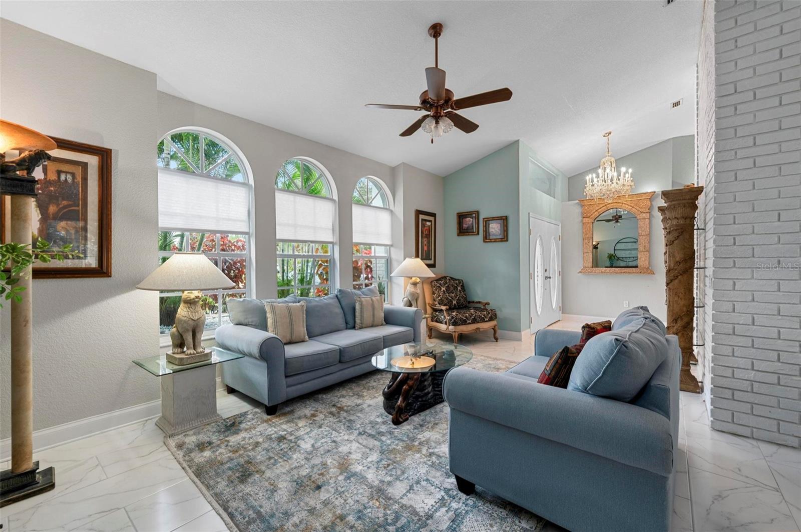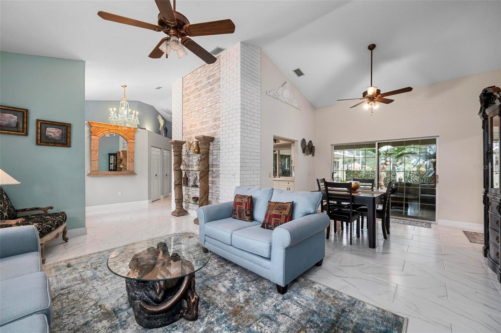 This turnkey 3-bedroom, 2-bath home in Deep Creek, Punta Gorda, offers a combination of elegant craftsmanship, modern updates, and an extraordinary outdoor living experience. Professionally landscaped with lush palms, natural stone retaining walls, and pavers wrapping around the home, the property creates a polished, resort-like ambiance from the moment you arrive.Step through the double front doors into soaring ceilings and an open, bright floor plan. The large great room features a stunning wood-burning fireplace as its centerpiece and flows seamlessly into the family room, providing plenty of space for relaxation, entertainment, and family gatherings. All new marble-like ceramic tile extends throughout the main living areas, enhancing the home's clean and contemporary feel.The spacious walkthrough kitchen is a chef's delight, with Corian countertops, stainless steel appliances, ample cabinet space, and a convenient window to the outdoor kitchen. The kitchen opens to the family room, making it perfect for entertaining or everyday living. Each bedroom is generously sized with large closets providing abundant storage. The primary suite is a private retreat, boasting porcelain floors, a Jacuzzi tub, a luxurious walk-in shower with multiple shower heads, and direct views of the breathtaking 12-foot waterfall cascading into the custom heated pool.Outdoor living is where this home truly shines. The custom pool features dramatic stonework, a tropical landscaped island with rebar-reinforced palm trees, and a 12-foot waterfall that provides both beauty and privacy. Surrounding the pool, pavers and patios gives multiple seating areas for entertaining or relaxing, and an outdoor shower adds convenience for post-swim clean-ups. The full outdoor kitchen includes ample counter space and seating, making it an entertainer's dream.Recent updates provide peace of mind, including a complete HVAC system installed in May 2025, a roof replaced in 2022, and numerous interior and exterior improvements completed between 2024-2025. With its spacious interior, luxurious primary suite, breathtaking outdoor oasis, and meticulous attention to detail, this home is move-in ready and perfect for embracing the Florida lifestyle in comfort, style, and privacy.