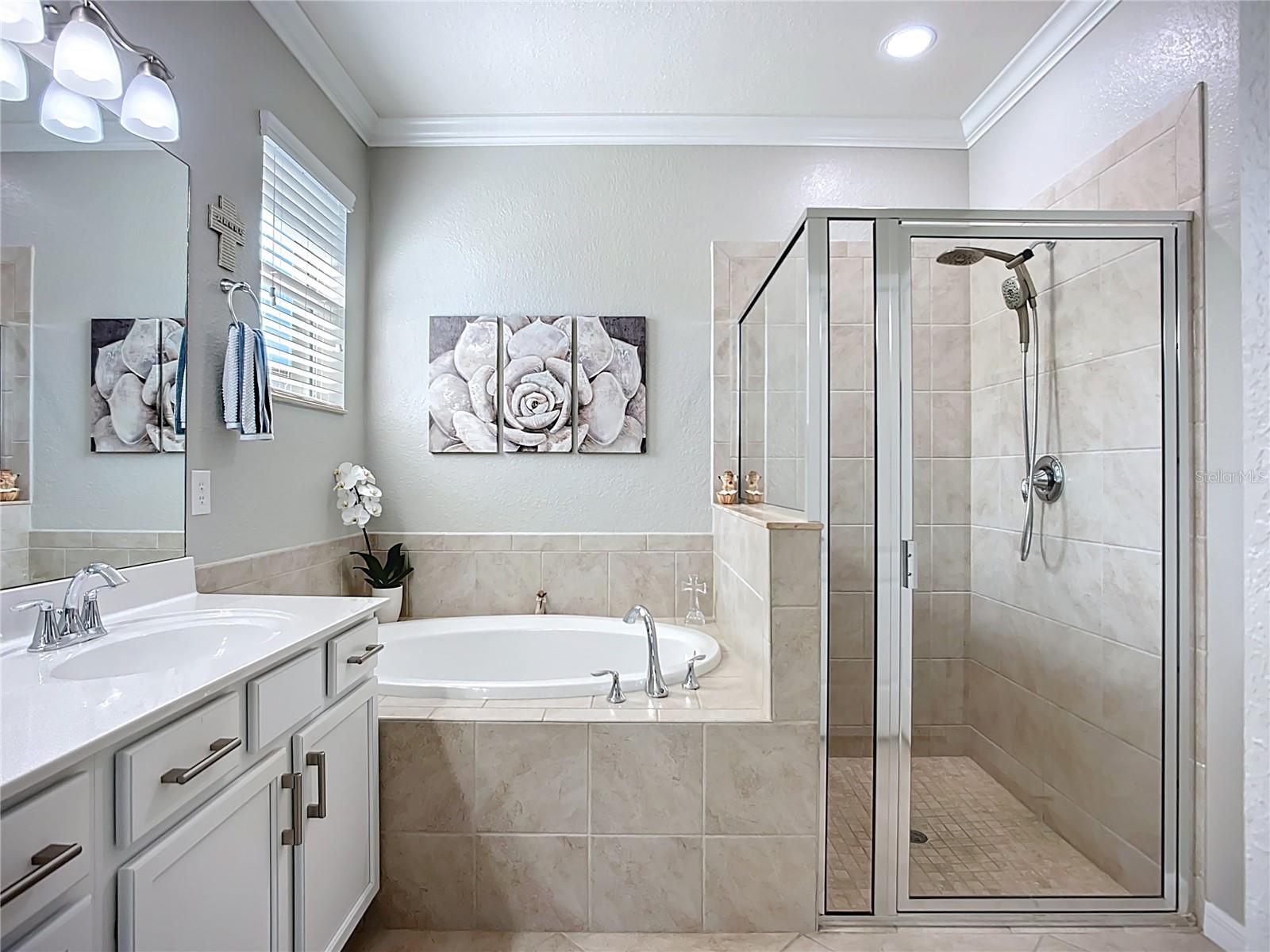 This home combines modern comfort with timeless elegance, offering an inviting retreat in the heart of North Port. From the moment you step into the welcoming foyer, you'll appreciate the thoughtful design, functionality, and charm throughout. Curb appeal abounds with mature landscaping, a tile roof, and a brick paver walkway and driveway. Inside, you'll find updated flooring, fresh interior paint, plantation shutters, and crown molding. The large extended screened lanai (19' x 16') with pavers enhances your outdoor living overlooking a tranquil pond--perfect for morning coffee, evening relaxation, or entertaining friends. The kitchen is designed for both style and function, featuring quartz countertops, a tile backsplash, updated stainless steel appliances, generous cabinet space, a walk-in pantry, and a large food-prep island with seating and an oversized quartz sink. The split-bedroom layout ensures privacy for all. The primary suite includes two walk-in closets, a ceiling fan, and a spa-like en suite bath with dual vanities, a walk-in shower, and a soaking tub. For added guest comfort, the second bedroom offers its own private bath--ideal for visitors or in-laws. With three full bathrooms in total, the home provides both convenience and versatility. Located in The Villas at Charleston Park, this meticulously maintained gated community features single-family homes surrounded by lush landscaping, sidewalks, ponds with lighted fountains, and lantern-lit streetlamps. Residents enjoy resort-style amenities including a tropical pool with sundeck, a clubhouse with fitness center, library, billiards room, and a calendar of community activities. The community's peaceful setting is just minutes from Wellen Park, biking and walking trails, golf courses, beaches, a boat launch, spring training facilities, shopping, dining, and medical centers. With no CDD fees, Flood Zone X, New roof in July of 2025, new AC in 2023, this home offers both peace of mind and an exceptional lifestyle. THIS HOME IS TRULY MOVE IN READY FOR THE MOST DESCERNING BUYER.