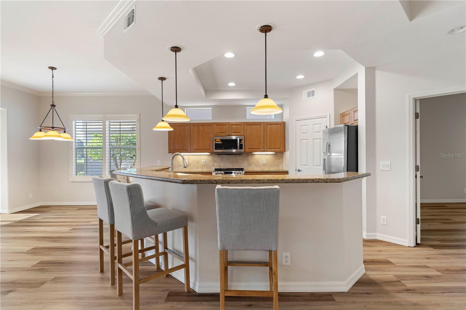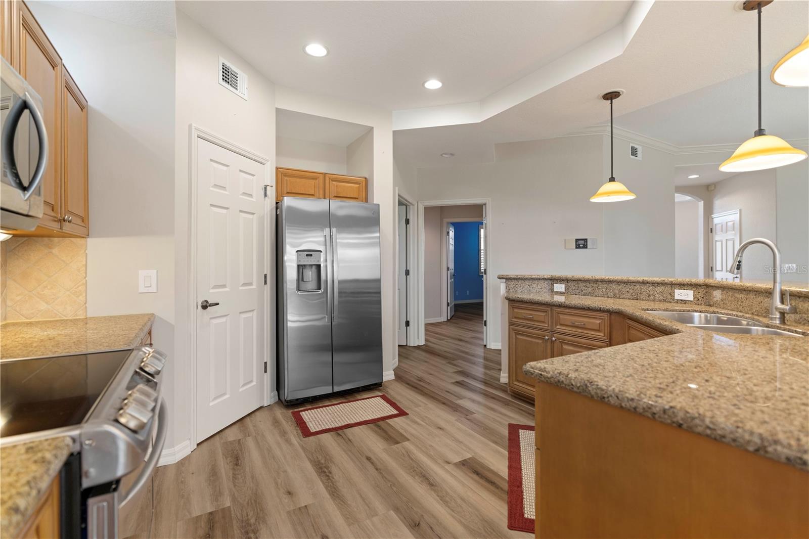 **SPACIOUS VIZCAYA CONDO W/PRIVATE 2-CAR GARAGE & GOLF COURSE VIEW** ALL CONDO BUILDINGS HAVE NEW ROOFS IN 2025! Enjoy relaxed living in this beautifully maintained 3 bed/2 bath condo with an attached 2-car garage & nearly 1,900 sq ft of living space, located in Vizcaya at Burnt Store Isles. Situated along the 8th fairway of Twin Isles Golf Course, this first-floor residence offers panoramic views of the greenway and adjacent lake. Inside, the open floor plan features a welcoming great room, defined formal dining area, and a gourmet kitchen designed with entertaining in mind. High ceilings with crown molding, luxury vinyl plank flooring throughout, and disappearing sliding glass doors offer seamless flow to the screened lanai. Vinyl sliders on the lanai allow year-round enjoyment, rain or shine. Sit back and take in the tranquil golf course views while watching golfers pass by throughout the day. The chef's kitchen is equipped with raised-panel cabinetry, granite counters, stainless steel appliances, corner walk-in pantry, and a wraparound breakfast bar ideal for casual dining or conversation while cooking. The private master suite has direct access to the lanai and includes serene golf course views, a large walk-in closet, and a spacious en-suite bath with dual sinks, tiled walk-in shower, and private water closet. The split-bedroom layout ensures privacy for guests, with two additional well-sized bedrooms -- one featuring a large, walk-in closet. Additional conveniences include an interior laundry room with room for full-sized washer/dryer, built-in cabinetry and mudroom-style access to the garage, which also offers a dedicated storage room. Storm protection is in place with electric roll-down shutters on the lanai and accordion shutters at the entry. Vizcaya is a well-run, pet-friendly association w/healthy reserves and all new roofs in 2025. Optional membership at Twin Isles Country Club provides access to championship golf, tennis, a heated pool, clubhouse dining, and a calendar full of social events. The location places you within walking distance to Burnt Store Marketplace, where Publix, Home Depot, several restaurants, and daily essentials are all just a short stroll away. This meticulously cared-for property offers a low-maintenance lifestyle with upscale comforts. Whether you're a seasonal visitor or a full-time resident, this condo delivers the perfect blend of convenience, space, and charm. Schedule your showing today!