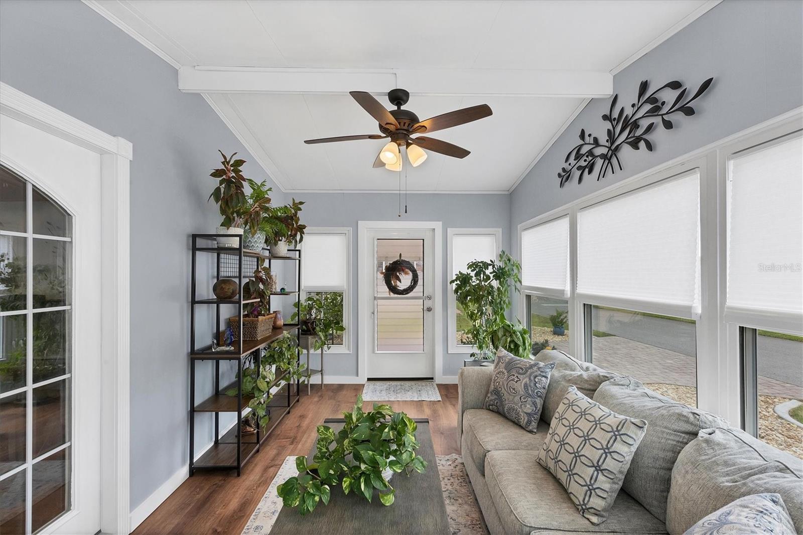 Exterior: Awning(s), Hurricane Shutters, Rain Gutters, Sliding Doors, Storage