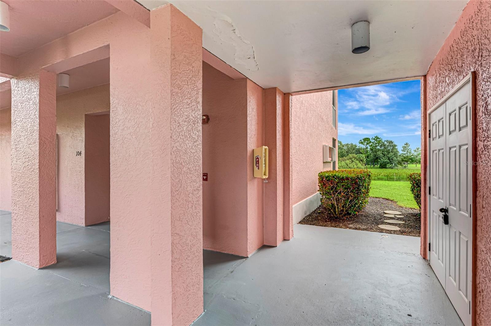 Exterior: Lighting, Rain Gutters, Sidewalk, Sliding Doors