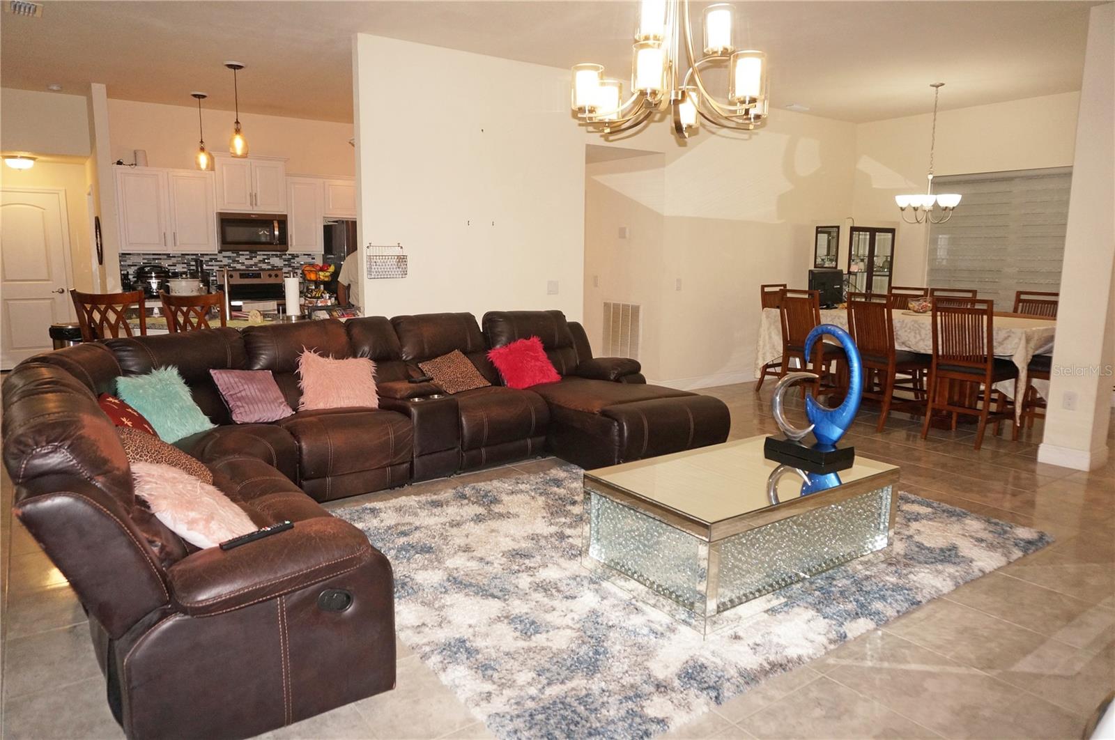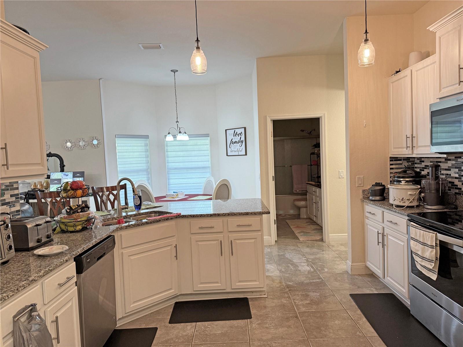 Impressive 4 Bedroom, 3 Bathroom home with attached 3 Car Garage located in desirable deed restricted DEEP CREEK. This spacious light and bright home offers an open and split bedroom floor plan with Great Room, separate Dining Room, large Den, well appointed Kitchen, Inside Laundry Room and 23x9 screened covered lanai. The Great Room features French doors to the screened lanai, plant shelves, tile flooring and access to the separate dining room. The Kitchen offers white cabinetry, tile backsplash, granite counters, breakfast bar, pantry closet, dining area and stainless appliances. Appliances include: French door refrigerator, oven/range, built in microwave, dishwasher. There is also a disposal and a double sink. The Inside Laundry has a washer, dryer and chest freezer. The spacious Master bedroom suite features lanai access, two walk in closets and private bathroom with garden tub, his and hers sinks and walk in shower, There are 3 additional bedrooms with double closets and two additional full bathrooms- one with access to the screened lanai. Enjoy your morning coffee on the screened covered lanai with greenbelt view. Other features include: hurricane shutters, transom window over the front door, irrigation system, NEW ROOF 2023. NOT in a flood zone. This home is minutes from golf, shopping, dining, I-75, entertainment, medical care, waterfront parks. This is perfect for a family or those expecting lots of winter visitors.
