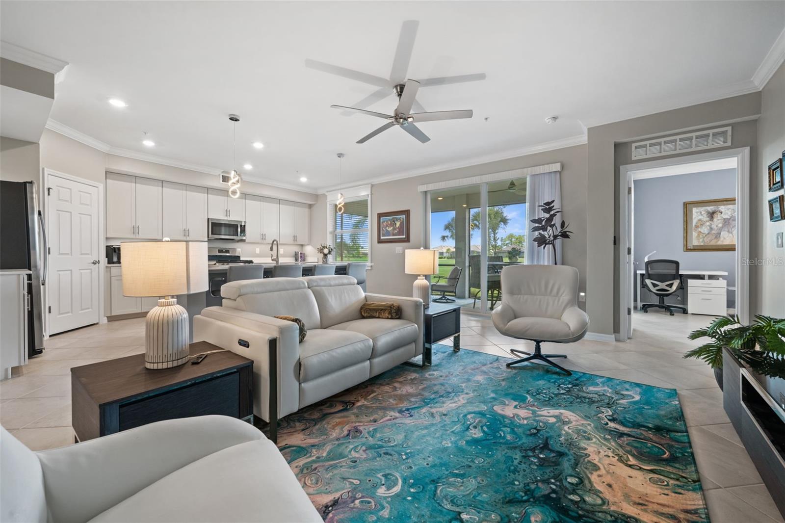 Experience resort-style luxury living in this first-floor Arrowhead model by Lennar at Babcock National. Offering 1,741 sq. ft. of thoughtfully designed space, this 3-bedroom, 2-bathroom coach home blends comfort and style with elegant trim details, fresh designer paint, tile flooring throughout, built with impact-resistant windows and doors, and smart home appliances (locks, doorbell, garage door) for peace of mind. This home also features an open-concept layout that flows seamlessly into the spacious great room and out to the screened lanai, where sweeping views of the 16th green, situated between two ponds, and stunning sunsets create the perfect backdrop for both entertaining and everyday relaxation. A 2-car garage adds convenience, while turnkey furnishings including a brand new murphy bed, make moving in effortless. An additional perk - this property is 30 ft above sea level and in located in Babcock Ranch, which has proven to sustain tropical storms. Ownership includes a social membership with access to premier amenities: a resort-style pool with tiki bar, hot tub, lap lanes, state-of-the-art fitness center, full-service spa, pickleball, tennis, bocce courts, the new clubhouse, and the Enclave restaurant. HOA fees cover high-speed internet, water, building maintenance, and common area care, allowing for a truly low-maintenance lifestyle. Just minutes from Founder's Square in Babcock Ranch and Babcock Neighborhood Schools, you'll enjoy dining, shopping, live music, and year-round community events that make this town unlike anywhere else. Whether you're seeking a seasonal retreat or a year-round residence, this home offers the very best of Southwest Florida living.