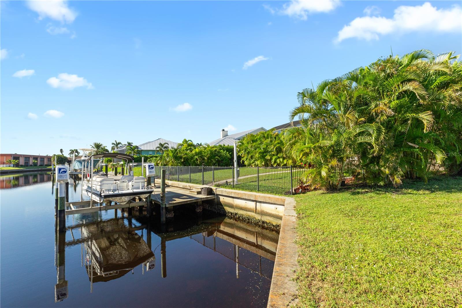 Opulent Waterfront Luxury in Punta Gorda Isles -- This 2015 D.M. Dean custom-built home offers 3 bedrooms, 3 bathrooms, plus office/den and a 2-car garage, perfectly situated on a private cul-de-sac street with circular driveway and direct access to Charlotte Harbor. With 59' of waterfront and a 34' concrete dock with a 10,000-lb boat lift, this home is a boater's paradise and a haven for water enthusiasts. Inside, elegance meets function with soaring ceilings, oversized diagonal tile, and an open floor plan ideal for entertaining. The gourmet kitchen, remodeled in 2022, features Cambria quartz countertops, a farmhouse sink with wave-activated faucet, smart oven, and a chic bar with wine fridge and floating walnut shelves. The living and dining areas are enhanced by a 14' custom tray ceiling, creating a refined yet inviting atmosphere. The master suite is a serene retreat with lanai access, custom tray ceiling, and a spa-inspired bathroom featuring dual sink vanity, oversized Roman shower with spa jets, jetted soaking tub, and private water closet. Guest bedrooms enjoy a split floor plan for privacy, while the third bedroom doubles as a state-of-the-art movie room with projector, Dolby 7.1 sound system, murphy bed, and ensuite bath. A versatile den/office with built-in bookshelves and custom barn doors offers endless possibilities--it can serve as a private home office, creative studio, library, formal study, or even a quiet retreat for reading or meditation, adapting seamlessly to your lifestyle needs. The fully equipped laundry room has quartz countertops and a second refrigerator adding further convenience. Step outside to your resort-style backyard: heated pool with waterfall, six-person spa, custom summer kitchen with double BBQ, sink, hood, TV, motorized storm screen, and a private outdoor shower--all surrounded by lush landscaping for ultimate privacy. This home embodies timeless elegance, high-end finishes, and the quintessential Florida waterfront lifestyle, perfect for entertaining, boating, or enjoying serene, luxurious everyday living. Enjoy all the amenities that Punta Gorda has to offer such as biking, fishing, boating, dining, live entertainment, and much more! Close to Fisherman's Village, Ponce De Leon Park, Gilcrest Park, and Historic Downtown Punta Gorda. Schedule your showing TODAY!