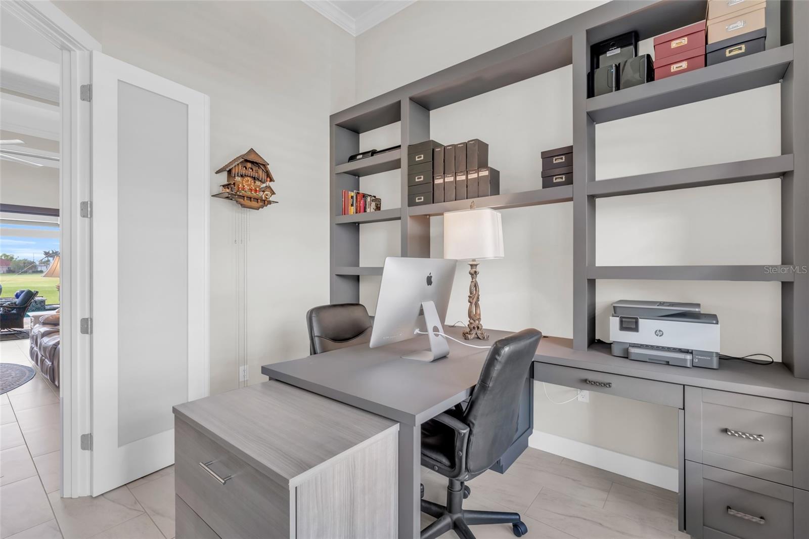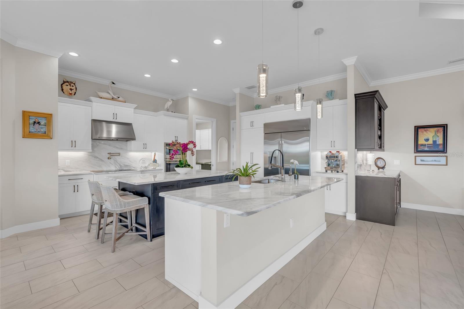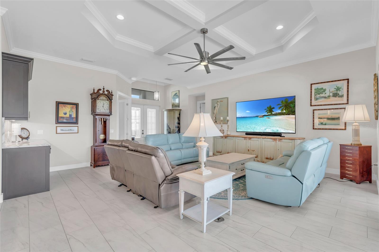 This exceptional residence, situated on the 13th hole of Twin Isles Golf Course, offers a captivating blend of contemporary design, high-end finishes, and picturesque southwestern views for unforgettable sunsets. From the moment you arrive, the expansive paver driveway and walkway, lush landscaping, elegant glass double doors, and Bahamian style accent shutters create a captivating first impression. Boasting a large open floor plan, this 2020-built three bedroom plus den home features impact glass windows and doors, and soaring coffered ceilings with elegant crown molding. A zero-corner slider seamlessly connects the living room to the outdoor oasis, where you will no doubt spend countless evenings unwinding as the sun sets over the large picture window screen enclosure. The expansive outdoor entertaining area features a handsome heated saltwater pool with spillover, Pebble Tec finish, inviting in-pool lounges, plus Pentair controls, all overlooking the expansive golf course. You will love to relax with friends or dine al fresco under the ample covered lanai with convenient pool bath access. The chef's kitchen is a culinary dream, with abundant work/entertaining surfaces and storage. High end stone counters and backsplash add pizzazz to this killer kitchen, while GE Profile appliances, including a 48" wide refrigerator, cooktop, and built-in double oven support all of your culinary needs. Entertaining is a breeze with a dedicated bar with wine chiller, dual islands with breakfast bar seating, and a hidden oversized walk-in pantry. Throughout the home, you'll find a rich neutral color scheme, light colored plank tile flooring, custom lighting, crown molding, plantation shutters, and solid-core doors. The dedicated office, accessed via French doors, includes an impressive custom built-in office system. Prepare to be blown away by the oversized 22x40 air-conditioned 4 car garage, with epoxy floor and plenty of room for tinkering and storage! The luxurious master suite is a serene retreat featuring tray ceilings, motorized shades, private lanai access, dual walk-in closets, and bonus built in storage. The enticing spa-like bath offers split vanities, large soaking tub, and a custom walk-through shower. The split-bedroom layout ensures privacy for guests, with two generously sized suites...one with direct lanai access and ensuite bath and a second featuring ensuite with a walk-in closet. An impressive utility room completes this incredible home with tremendous storage to keep you organized. Impact windows plus a motorized roll down lanai shutter, installed in 2023, allows you to vacation with peace of mind. Burnt Store Isles is a deed-restricted golf and boating community, offering great proximity to downtown Punta Gorda, Fishermen's Village, world-class fishing and boating, and beautiful parks.