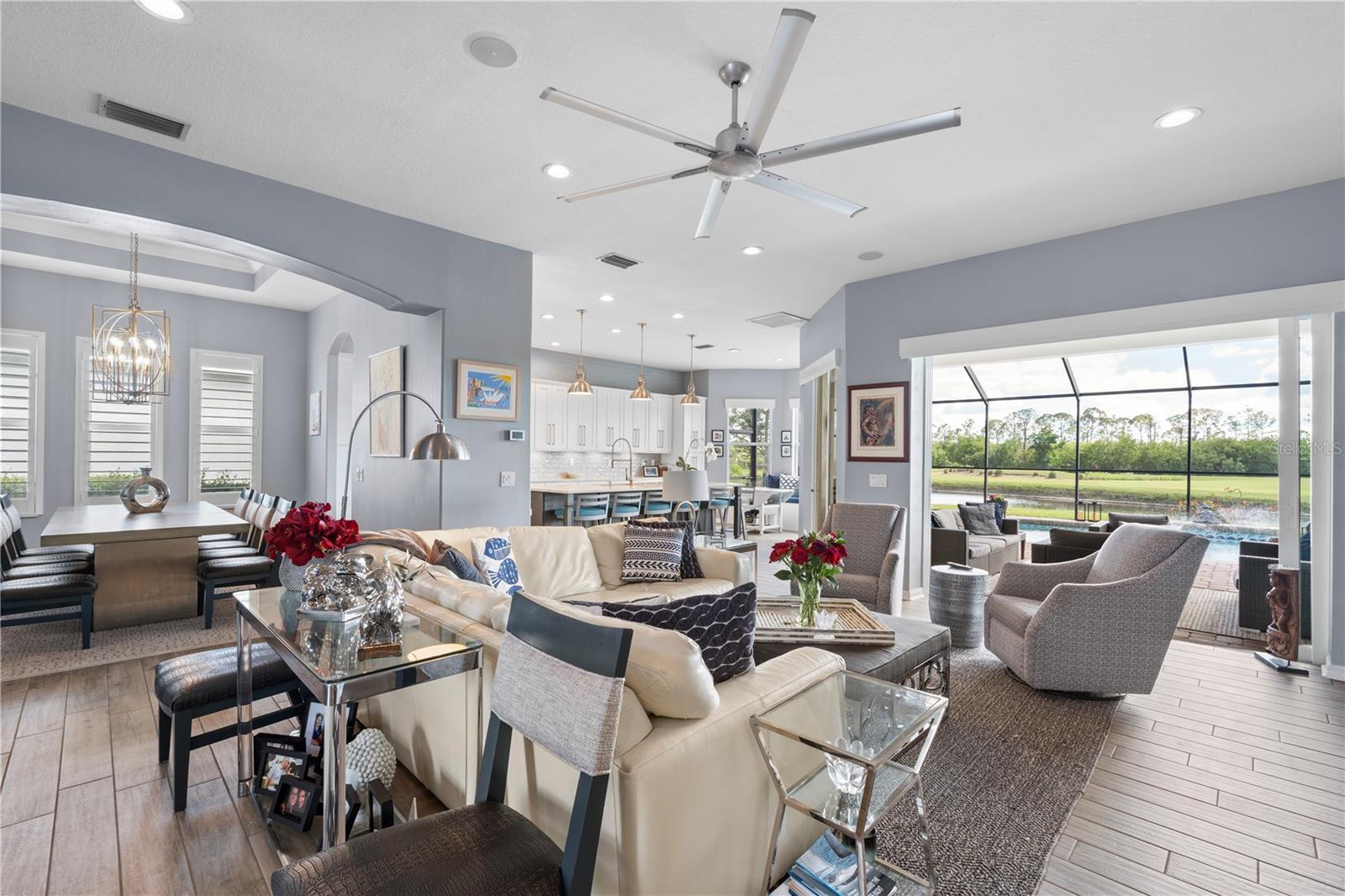 Come and enjoy luxury living at 5241 Grand Palmetto Way! This well-appointed POOL HOME is located on a premium lot in Heron Creek's Quail Run. Positioned perfectly on the 8th hole of the Creek 9, the backyard offers over 70 FEET OF SERENE WATERFRONTAGE and an unobstructed 180 panorama of the nearly 2-acre POND and peaceful NATURAL MARSH PRESERVE. This spacious home features 4 bedrooms (including a lower-level master suite), an office, and 3 bathrooms, providing over 3,100 sq.ft. of living space--ideal for those needing the extra room! The expansive 1,200+ sq.ft. caged pool area, along with TWO SEPERATE GARAGES adjacent to the private front entrance courtyard and terrace, offers ample space for outdoor enjoyment. Recent upgrades include a NEWER STONE COATED METAL ROOF with a barrel tile appearance (installed in February 2024) and a FULLY REMODELED KITCHEN with SOLID WOOD CABINETRY, 42" uppers, frosted glass SUBWAY TILE backsplash, and QUARTZ countertops. The kitchen also boasts NEWER APPLIANCES including a stainless-steel hood vent, a 6-top commercial-grade gas range, and an oversized side-by-side refrigerator/freezer. A window seat with storage and beadboard accents beneath the back bay window provides a cozy spot for morning coffee and casual conversations. Additional enhancements include PLANTATION SHUTTERS, custom-built wall shelving, NEW PLANK TILE FLOORING throughout the ground floor, and freshly painted interiors. The hurricane-grade/impact slider to the pool area "pockets" out of sight. The smaller garage includes a PRX gym system, while the larger garage houses whole-home surge protection and overhead hanging storage. Both garages have been updated with hurricane-grade doors, and recent installations include a gas hot water heater along with three newer A/C systems. The rear patio has been remodeled with a BRICK PAVED overlay, and the SPARKELING POOL has been converted to a SALT-BASED SYSTEM. The newer POOL HEATER and a reinforced, repainted, and rescreened enclosure complete the outdoor upgrades. Heron Creek is a 676-acre, 27-hole country club community with over 430 acres dedicated to golf courses and permanent nature preserves. Designed by renowned golf course architect Arthur Hills, the community offers residents a natural habitat for a variety of birds and wildlife. The 21,000 sq.ft. main clubhouse features the formal Top of the Green Main Dining Room, the casual Heron's Roost Grille Room, the Golf Pro Shop, meeting rooms, and administrative offices. The clubhouse complex also includes a state-of-the-art fitness center with saunas and locker rooms, five lighted Har-Tru tennis courts, the Tennis Pro Shop, and a resort-style swimming pool with a sun deck and spa.