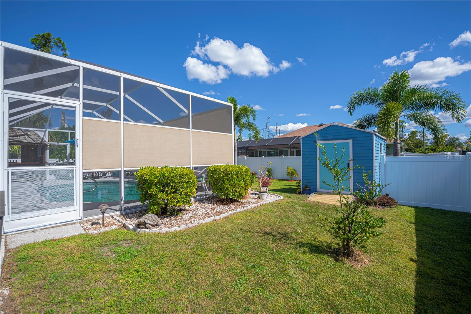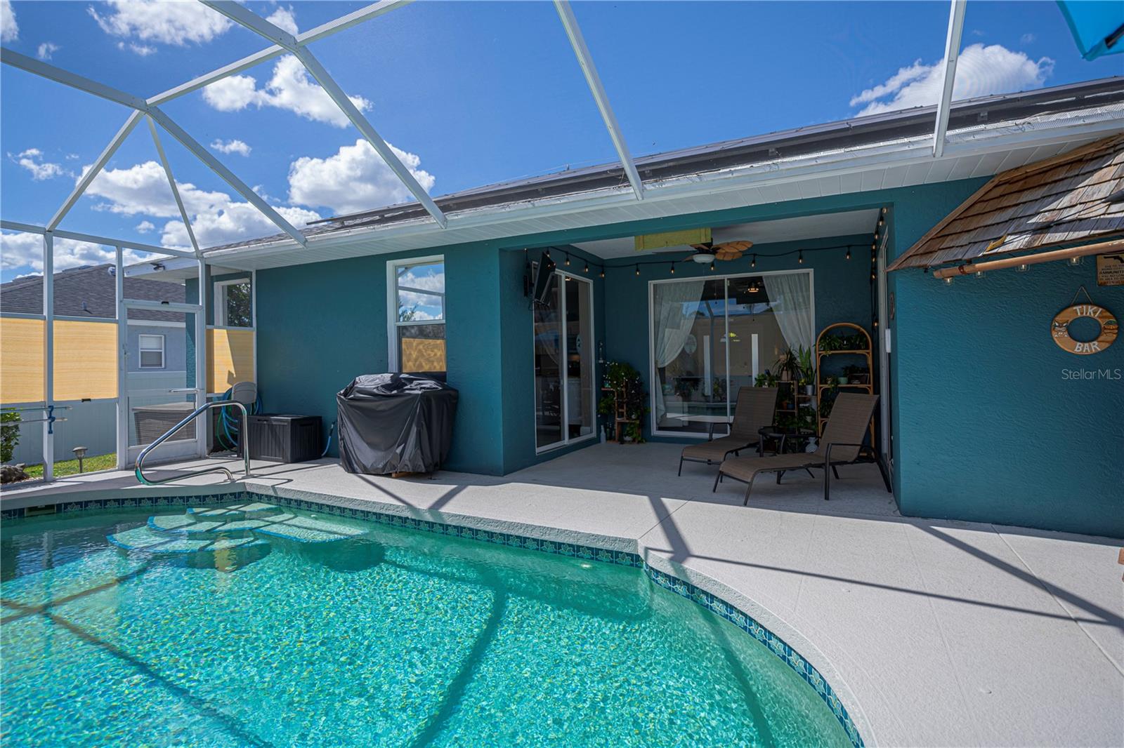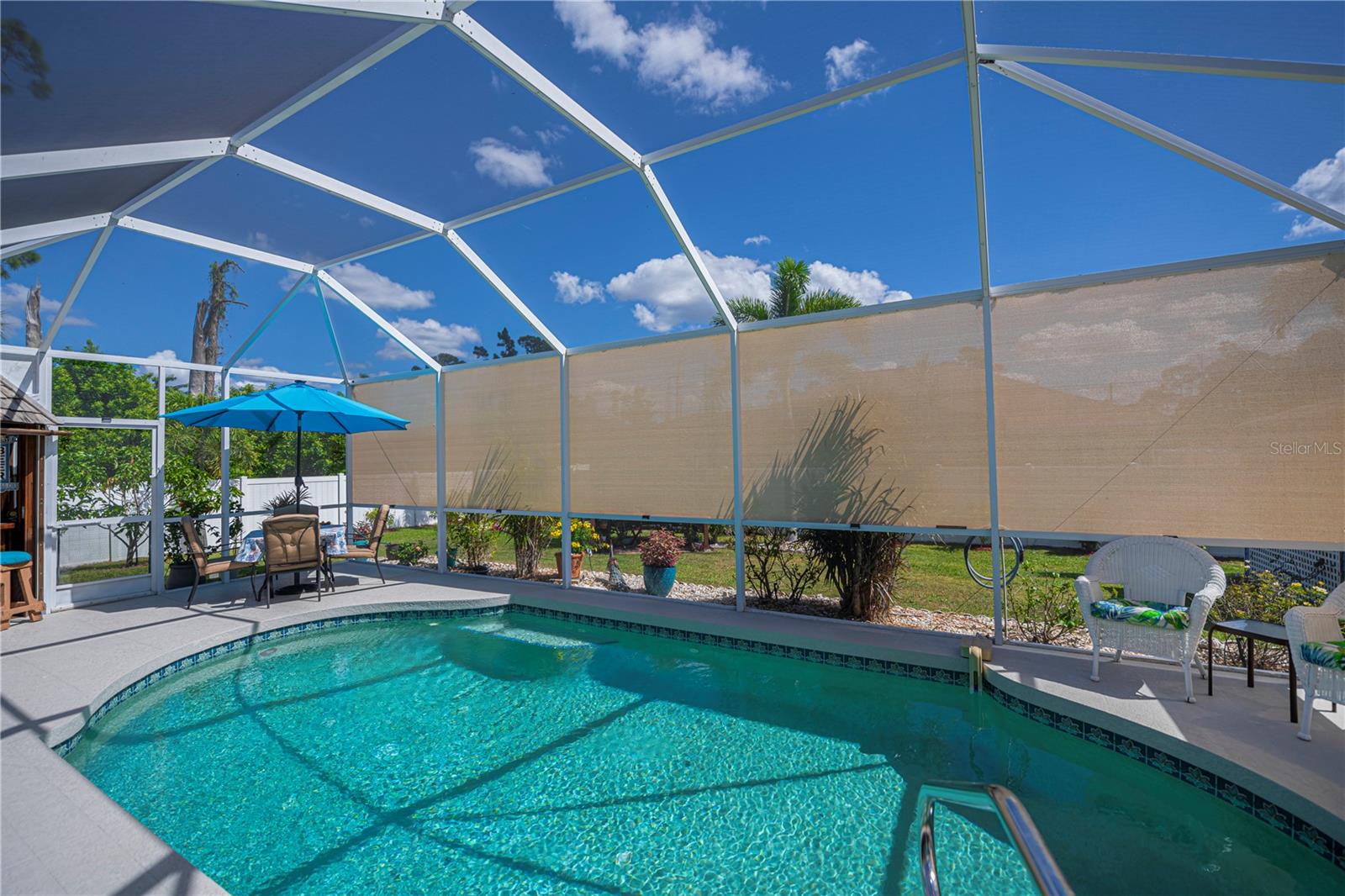 ABSOLUTELY STUNNING 3-bedroom, 2-bathroom, 2-car garage POOL HOME in North Port featuring the ULTIMATE BACKYARD SHOWSTOPPER--a one-of-a-kind POOLSIDE TIKI BAR perfect for unforgettable gatherings and fun-filled weekends! This beautifully updated residence offers incredible SOLAR SAVINGS and custom decorator touches throughout that make it truly unique. $$ PRICE IMPROVEMENT ALERT $$Step inside through a welcoming entry to elegant ceramic plank tile flooring, rounded corners, and sunburst windows that bathe the home in natural light, all within a private, fully fenced yard.The chef's dream kitchen boasts pristine white shaker cabinetry with soft-close doors and drawers, a subway tile backsplash, granite countertops, a spacious pantry, and a convenient breakfast island with high-quality appliances. Gather in the expansive living room and separate dining area, enhanced with stylish custom accents--ideal for entertaining family and friends.Retreat to the luxurious master suite featuring private patio access, pool entry, a large walk-in closet, and a beautifully updated ensuite with dual sinks, granite vanities, and a private commode. Guest bedrooms offer ample space and share a modern, updated bathroom.Step outside to your oversized private pool with a generous sundeck perfect for lounging, a large covered patio, and the show-stopping custom tiki-style outdoor wet bar--a backyard entertainer's dream! Garden lovers will adore the pergola misting system designed to nurture orchids and create a serene outdoor oasis.Additional highlights include:*New 2023 pool cage and 2025 A/C system*Recent property survey*Public water & septic (2013)*Smart 8-zone sprinkler system with Bluetooth tech (2020)*Inside laundry with extra storage cabinetry*Miami-Dade Kevlar hurricane protection for peace of mind*29 solar panels (half already paid off by seller) delivering instant solar equity and an average power bill of only $279/month*Garage with sliding screened doors for airflow and privacy*8x10 outdoor shed with electricity and water--perfect for hobbies or storage*No HOA fees or flood insurance requiredLocated near Myakka State Park and Myakkahatchee Creek Environmental Center with miles of trails, horseback riding, hiking, birdwatching, water access, plus close to Punta Gorda airport, shopping, dining, beaches, Warm Mineral Springs, and the aquatic center.This SOLAR-POWERED PARADISE blends luxury, comfort, and exceptional savings--your private resort awaits in North Port. DON'T MISS OUT--schedule your visit today before this spectacular home is gone!