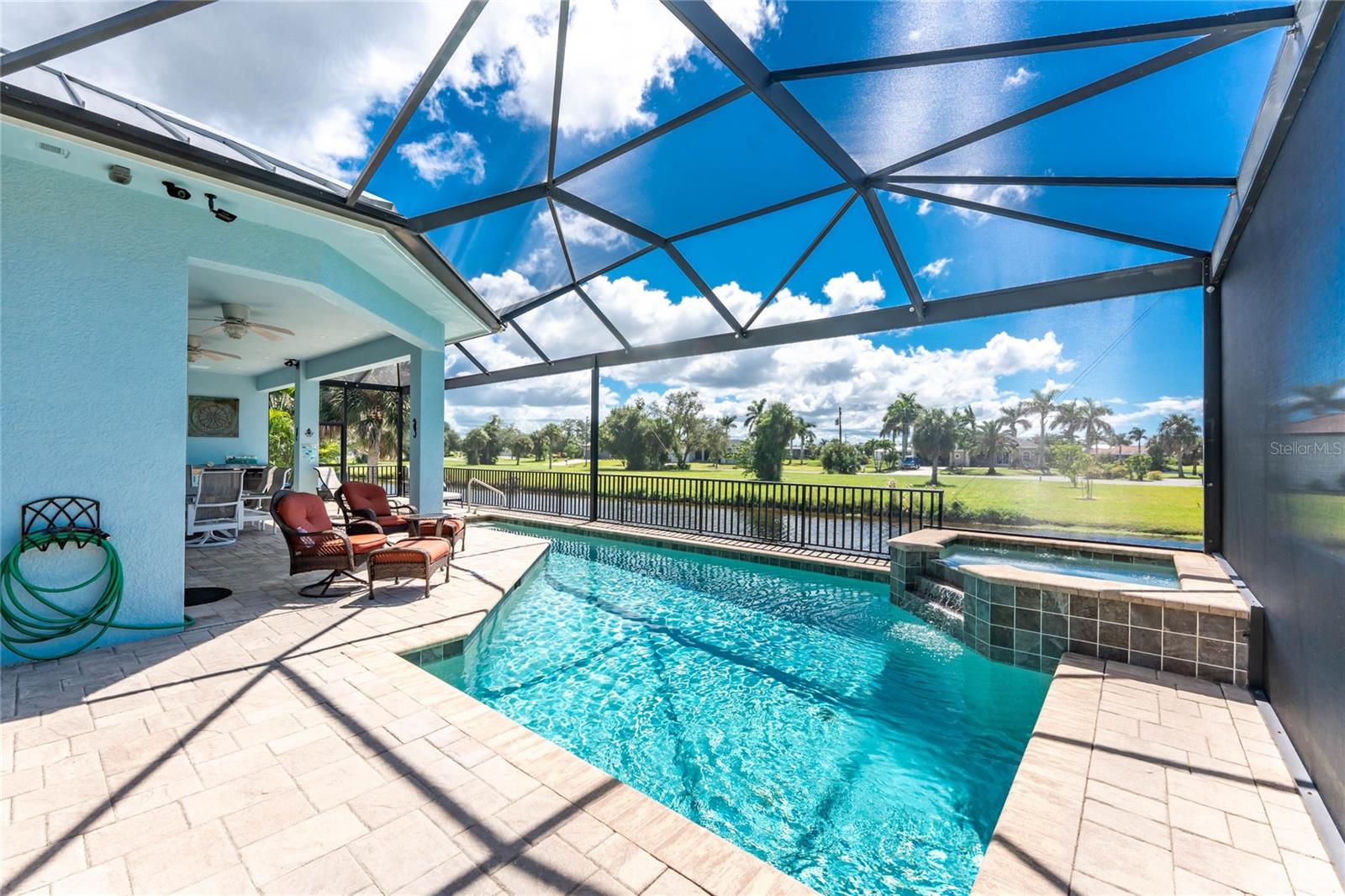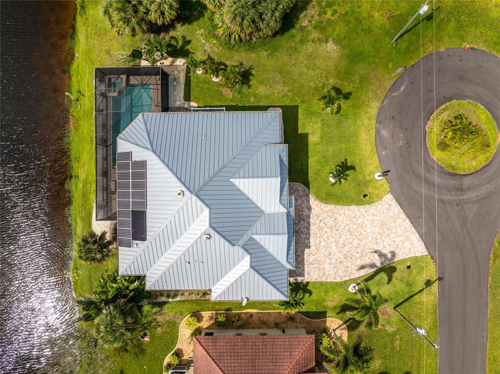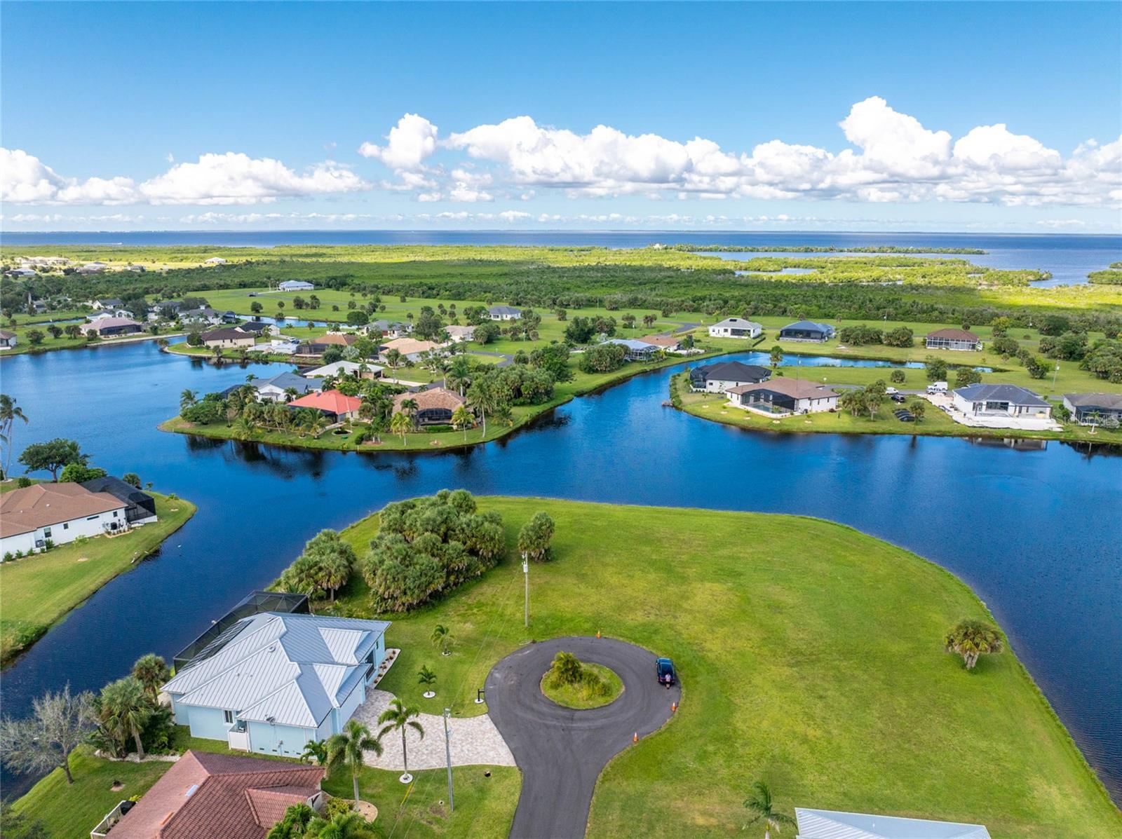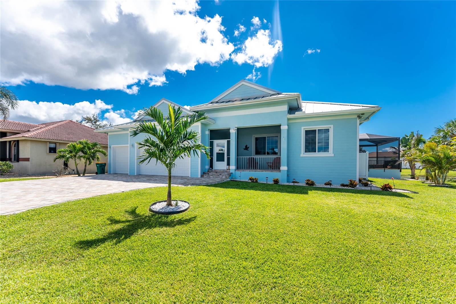 Stunning 2016 Key West-style 4BR home in Burnt Store Lakes with breathtaking Eagle Lake views. ENERGY SMART DESIGN featuring 18 solar panels, Snap Lock metal roof, and low power bills. Outdoor living shines with 105' of waterfront, heated saltwater pool, 3-tier waterfall spa, and panoramic screening. Inside boasts 10' ceilings, split floor plan, chef's kitchen with Samsung appliances, custom cabinetry, double oven, and surround sound. Primary suite offers spa-inspired bath and custom walk-in closet. Hurricane impact windows/doors and Tesla-compatible energy tracking system add peace of mind. Community amenities include park, kayak launch, and close access to Burnt Store Marina and downtown Punta Gorda.