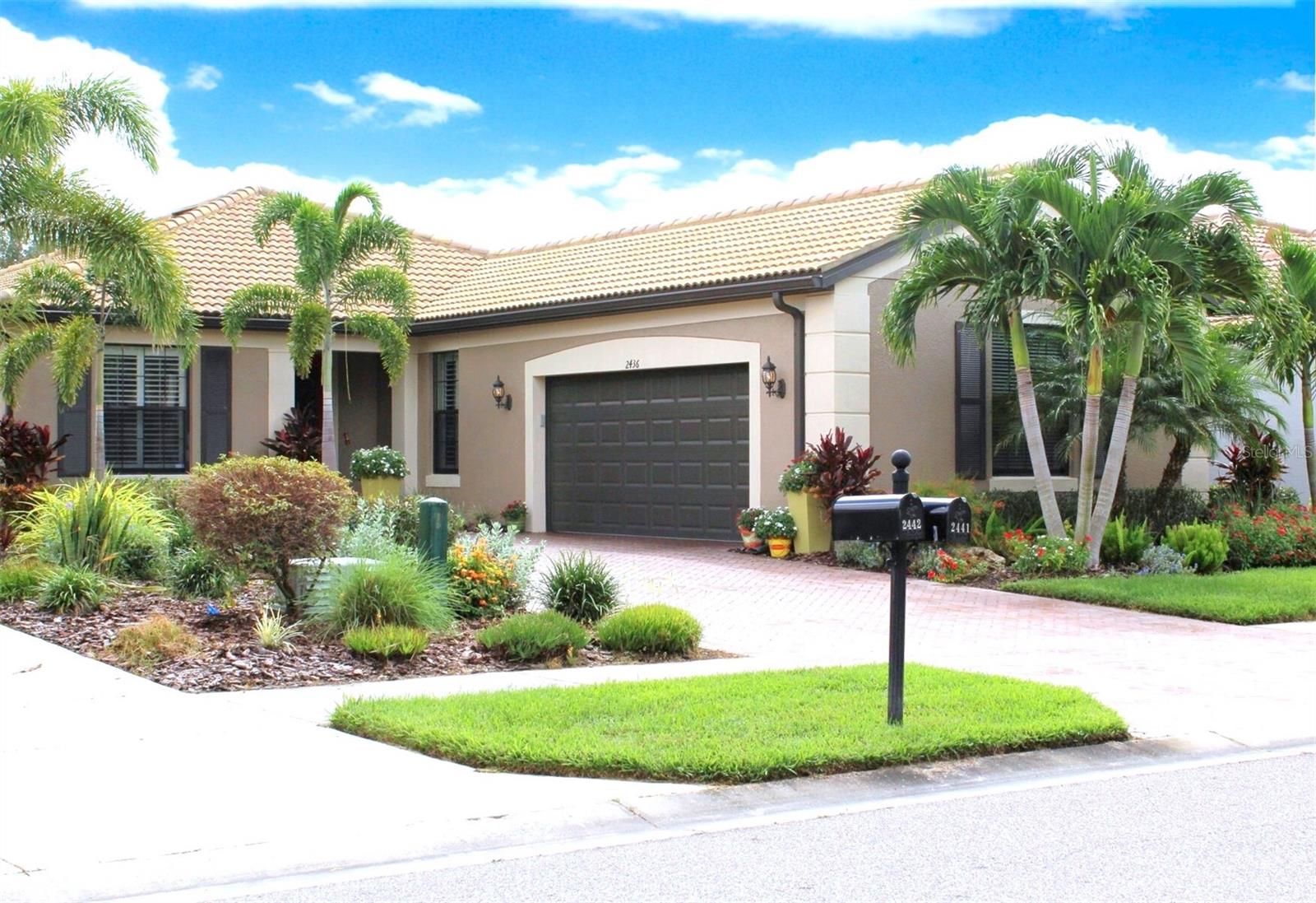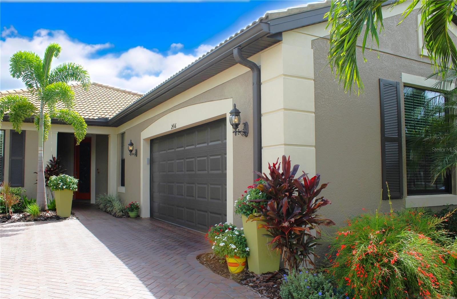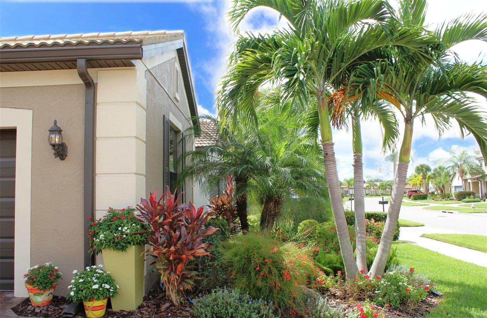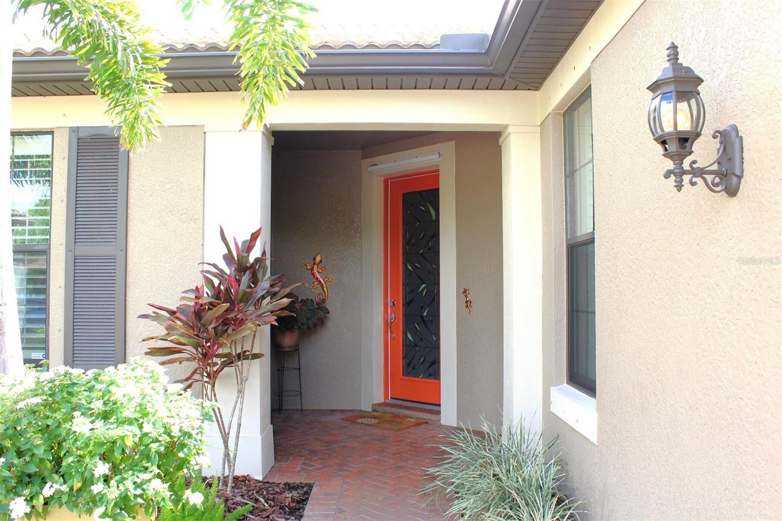 Exterior: Hurricane Shutters, Lighting, Private Mailbox, Rain Gutters, Sidewalk, Sliding Doors