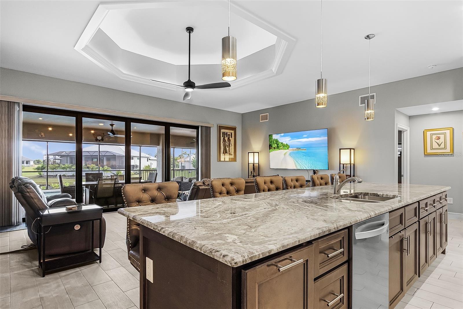 Come experience this beautifully designed heated pool home with an outdoor kitchen overlooking a tranquil lake--perfect for enjoying peaceful sunsets and effortless entertaining. This waterfront property features desirable southern exposure, a raised structural elevation, paver driveway, walkway, and front porch, all complemented by a durable metal roof and full-impact windows and sliders throughout. The welcoming foyer opens to a spacious great room highlighted by a 14' tray ceiling with ambient lighting, creating an inviting space for family gatherings. The chef's kitchen is both elegant and functional, showcasing Level 4 granite countertops, custom soft-close cabinetry, an oversized island that seats six or more, and premium smart appliances, including a propane range with convection, air-fry, roast, and broil settings. The expansive owner's suite features a tray ceiling, soundproofed walls for privacy, and impact French doors leading directly to the pool. Dual closets, including a walk-in and custom double-hung closet, provide abundant storage. The spa-inspired primary bath offers dual vanities, a custom tile-framed jacuzzi tub, a frameless glass walk-in shower with built-in bench, and a private water closet. Two additional guest bedrooms share a stylish full bath with an oversized tub/shower combo, while a separate half bath conveniently serves as a pool bath. Each bathroom is appointed with a bidet for added luxury. Additional highlights include custom ceiling fans, solid-wood closet systems, a private temperature-controlled storage room with coded entry, Generac GP2200i standby generator, 500-gallon buried propane tank, Ethernet hookups throughout, washer/dryer connections, and low monthly HOA fees. Living in Burnt Store Lakes offers access to 11 scenic, fish-stocked lakes, a large community park, canoe and kayak launch, and a fishing pier--ideal for those who love Florida's natural beauty. This exceptional home seamlessly blends modern elegance, smart-home convenience, and the best of Florida outdoor living.