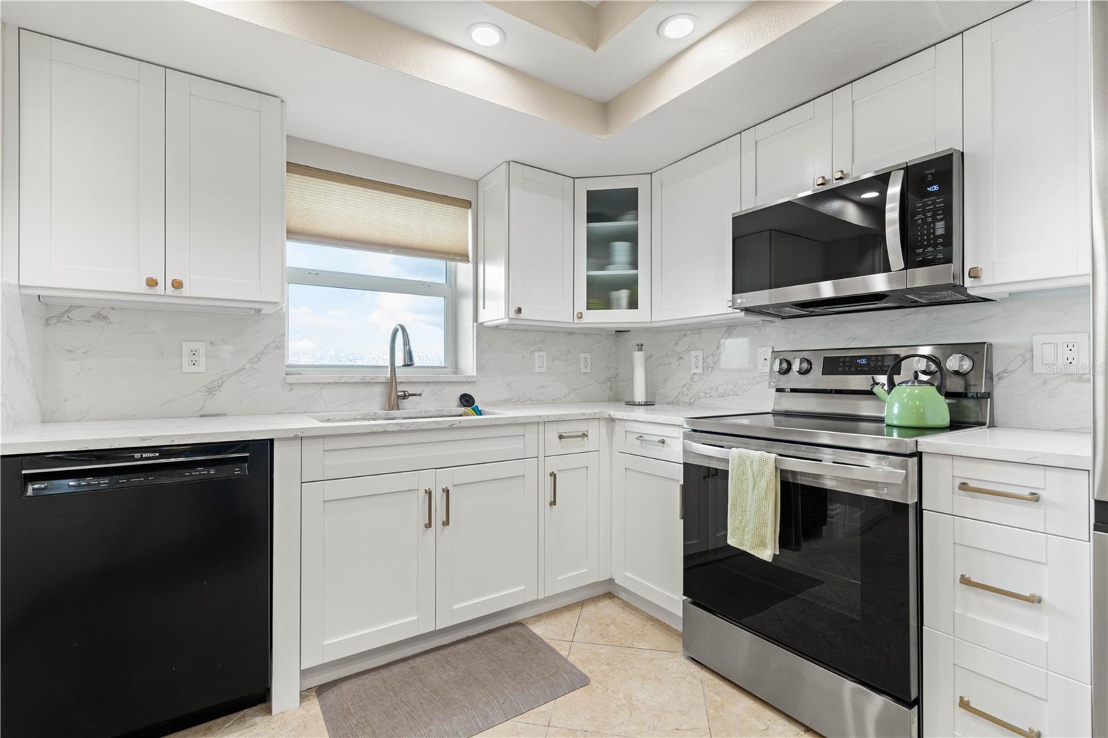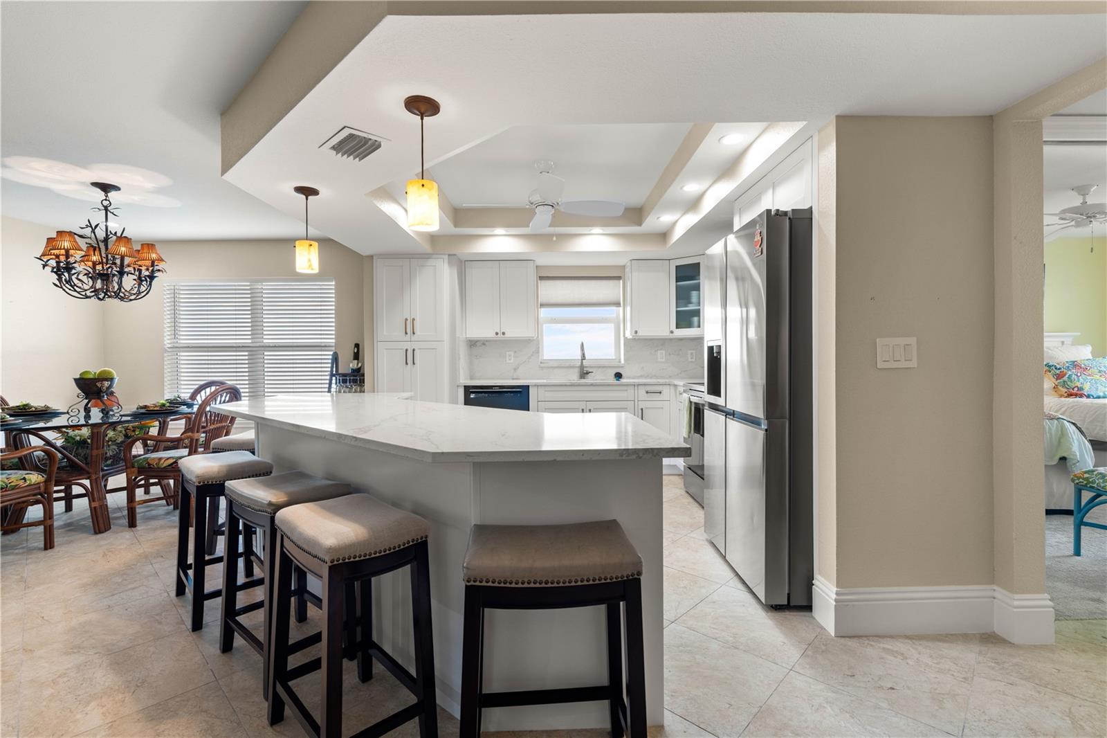 TOP-FLOOR END UNIT IN POINTS WEST W/FULL HARBOR VIEW, PRIVATE GARAGE & STUNNING SUNSETS - Enjoy front-row seats to vibrant sunsets, boating activity, and wildlife from this updated, 3 bed/2 bath, top-floor end-unit condo in Points West. With panoramic views stretching across Charlotte Harbor, this waterfront residence offers nearly 1,600 sq ft of open-concept living space designed for effortless indoor/outdoor living. Inside, large windows and sliding glass doors frame the spectacular water views from nearly every room while also allowing in tons of natural light. The enclosed balcony extends your living space outdoors -- perfect for sipping evening cocktails while watching boats pass or dolphins and manatees play just below. Western rear exposure ensures dramatic sunset skies year-round. The centrally located kitchen is beautifully updated with gorgeous quartz counters, stainless steel appliances, soft-close cabinetry, and an angled breakfast bar ideal for casual dining. The great room flows easily into the dining area and out to the lanai, creating a seamless entertaining space. Tile flooring runs throughout the main living areas, lanai, and baths while all three bedrooms feature new carpet. The spacious master suite boasts a large California-style walk-in closet and an en-suite bath w/dual sinks and a tiled corner shower. Two guest bedrooms offer versatility for hosting visitors or working from home. The interior laundry room includes a full-size washer/dryer for added convenience. Points West is a tight-knit, predominantly owner-occupied community with outstanding amenities including a heated in-ground pool, tennis court, clubhouse, and kayak launch. Set off directly from the backyard or enjoy a peaceful walk along the miles of scenic sidewalks connecting you to the rest of Punta Gorda Isles. The condo includes a PRIVATE GARAGE in the under-building parking area -- a rare perk for condo living. Located just minutes from the Isles Yacht Club, Fishermen's Village, and historic downtown Punta Gorda, this is your opportunity to embrace the best of the Florida waterfront lifestyle. Schedule your showing today. This view is even better in person!