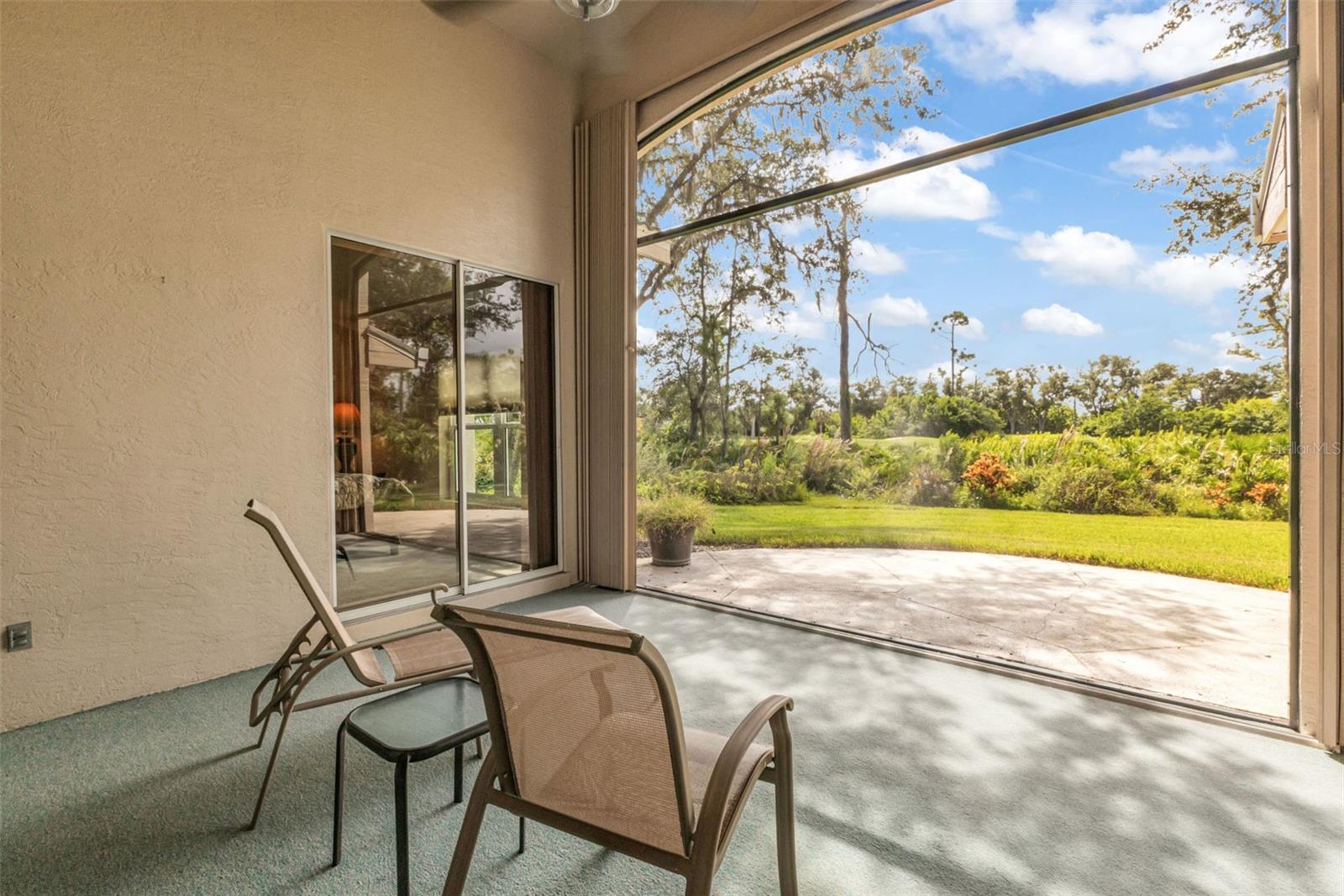 Located in the beautiful gated community of Riverwood, this charming 2-bedroom, 2-bath home with a den or office is perfectly positioned at the end of a quiet cul-de-sac on the 9th hole, offering both privacy and lovely golf course views. Just a short stroll from the community center, you'll have easy access to the many amenities that make this neighborhood so special. With an open and split floor plan, this home blends comfort and functionality while creating a bright and welcoming atmosphere from the moment you step inside. The main living area greets you with soaring ceilings, soft natural light, and an easy flow that makes the home feel both spacious and warm. The living room features sliders to the lanai topped with transom windows, creating a light-filled and airy setting. The family room flows into the kitchen, creating an inviting gathering space. Expansive picture windows line the back wall, framing peaceful views of the golf course and garden. The kitchen features solid maple wood cabinets, stainless steel appliances, a breakfast bar, and a cozy breakfast nook accented by an aquarium window that overlooks the lush landscaping. Off the living area is a laundry room with built-in storage. The lanai is generously sized and features a clear view screen, allowing you to enjoy the scenery without visual barriers. Just beyond, a spacious brick paver patio extends the living space outdoors, creating a perfect place to relax, grill, or gather with friends. There is also room to add a pool if desired. A separate office or den at the front of the home offers flexibility and charm with its lovely bay window, making it an ideal space for working or reading. The primary suite is tucked away for privacy and comfort, featuring sliders to the lanai, a walk in closet, dual sinks, a spa tub, and a tiled walk in shower. The guest bedroom and bath can be closed off with a pocket door to create a private suite for visitors. Additional features include a newer roof installed in 2017, impact resistant windows, an impact resistant garage door 2024, and an HVAC system and hot water heater that were both replaced in 2021. The hot water heater also comes with a 12-year transferable warranty for added peace of mind. The lanai was rescreened in 2022, making this home move-in ready with valuable updates already in place. As part of the vibrant Riverwood community, residents enjoy a par-72 championship golf course, a state-of-the-art fitness center, a resort-style pool, pickleball courts, and Har-Tru tennis courts. Beyond the gates, you will find easy access to world-class fishing, boating, waterfront dining, shopping, and the beautiful sandy beaches of the Gulf. Conveniently located between Sarasota and Fort Myers on Florida's West Coast, this home offers a wonderful blend of comfort, convenience, and resort-style living. Schedule your private showing today!