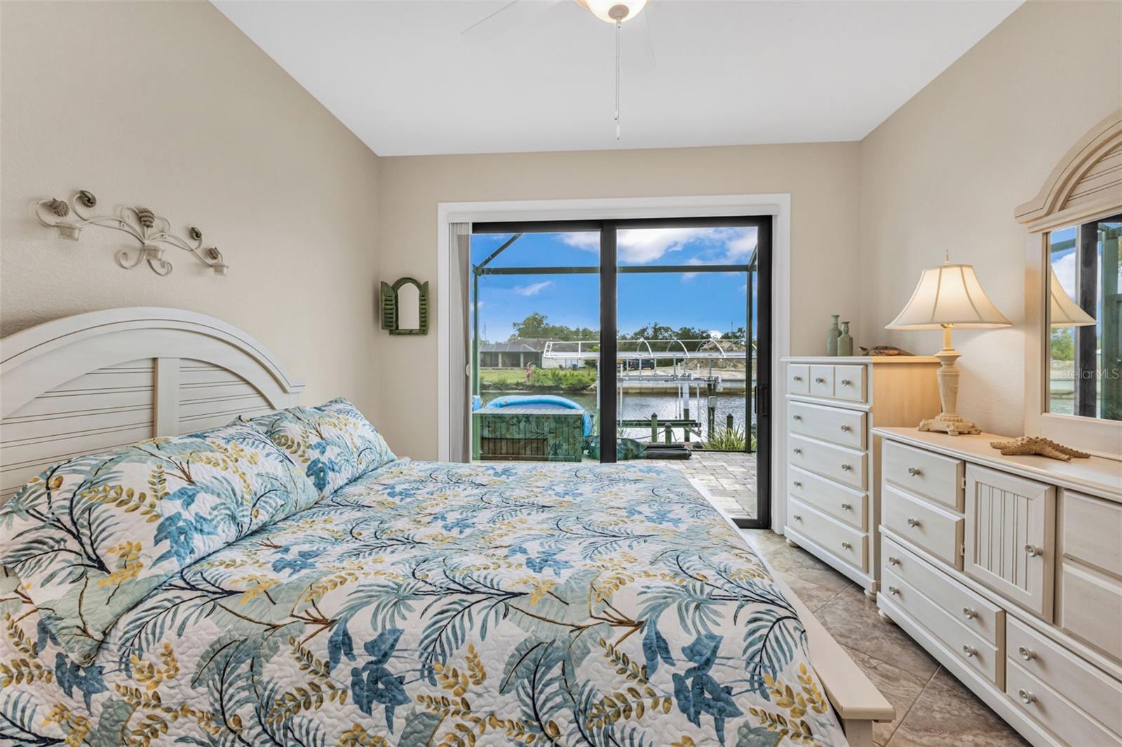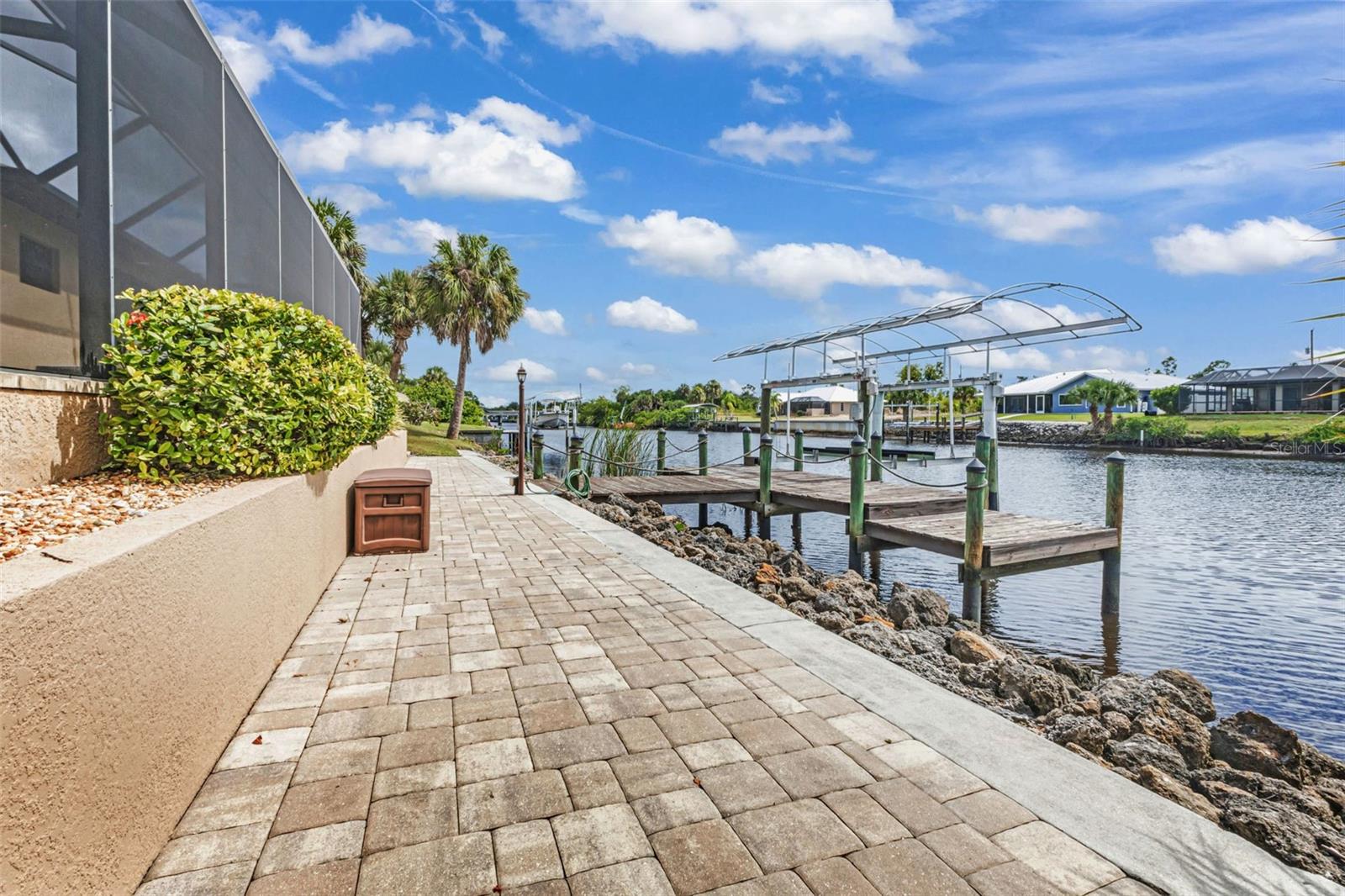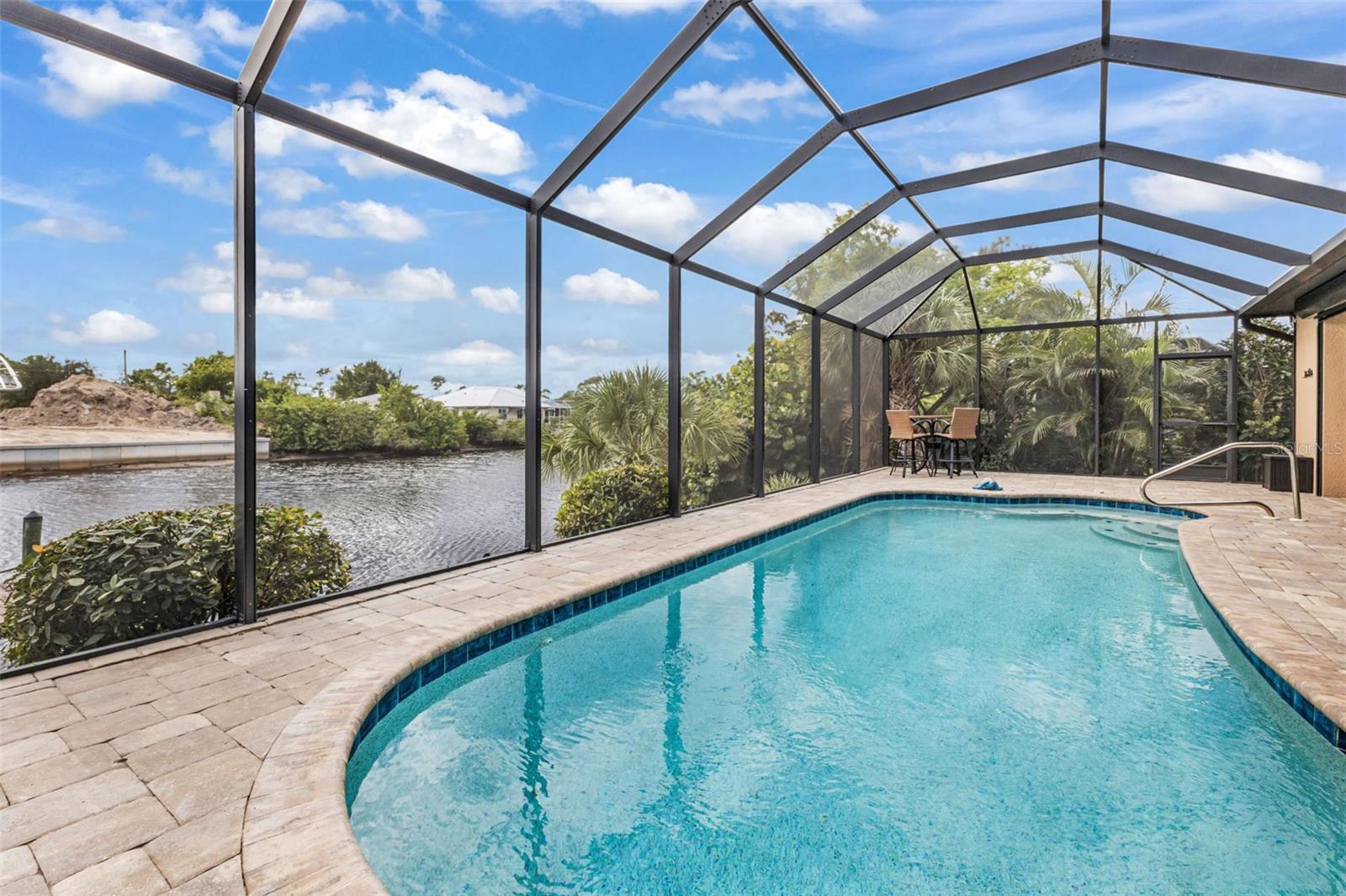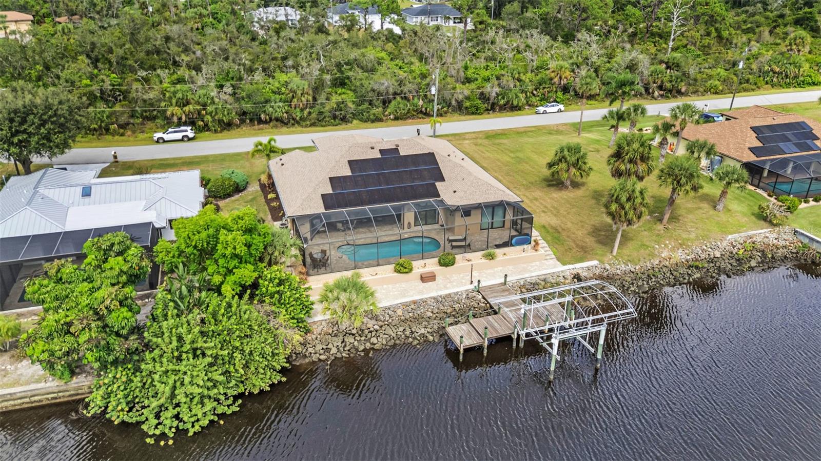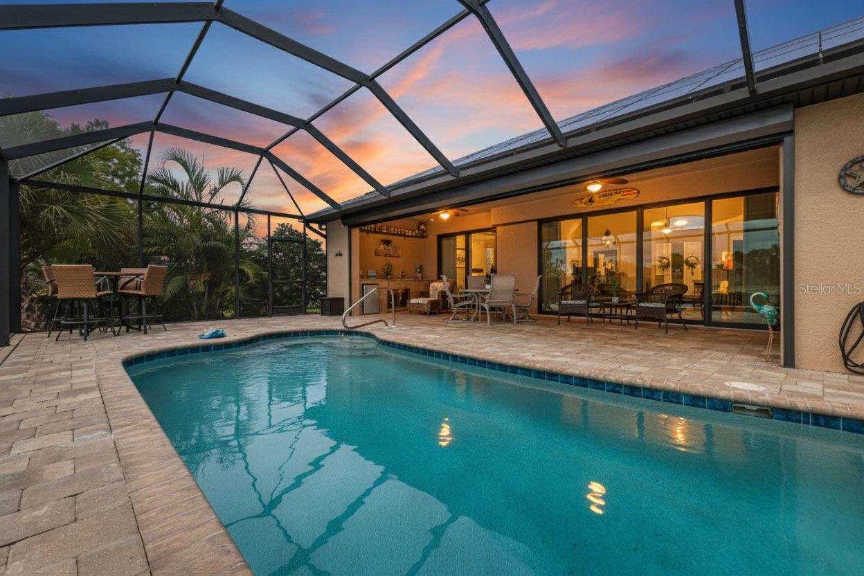Elegance meets waterfront living in this stunning 3-bed, 2-bath, + office/den, 3-car garage pool home, beautifully situated on a .34-acre canal front lot with 120 feet of frontage and a 10,000 lb boat lift. A brick paver driveway and lush professional landscaping set the tone as you approach the elegant double door entry. Inside, you will find an open split floor plan with dramatic 12 foot tray ceilings, arched 9 foot doorways, and 24 inch ceramic tile laid on the diagonal. One of the most impressive features of this home is the expansive 90 degree sliding glass doors that fully open to the lanai, creating an extraordinary indoor outdoor living experience. These sliders fill the home with natural light, make entertaining effortless, and beautifully frame the water views. The chef's kitchen is complete with granite countertops, a stone tile backsplash, a breakfast bar, and a cozy nook. Rich wood cabinetry offers an abundance of storage with pull-out shelves and soft-close drawers, complemented by stainless steel appliances, a double oven, and a wine fridge. The primary suite is a relaxing retreat with two walk-in closets, dual sinks, a spa tub, and a Roman-style walk-through shower with a built-in bench and rain shower head. Two guest bedrooms provide comfortable accommodations, and one opens directly to the lanai for easy pool access. The guest bath is thoughtfully positioned to also serve as a convenient pool bath. Step outside to a spacious screened lanai designed for true Florida living. Enjoy a 6-foot deep heated saltwater pool, comfortable seating areas, and a wet bar with granite counter, mini fridge, and TV hook up. Lush tropical landscaping surrounds the lanai, creating a natural privacy screen and a tranquil resort-like setting. A Kevlar screen system provides peace of mind and makes storm preparation simple. A full paver walkway leads to the private dock with boat lift, offering quick access to the Myakka River in just 10 minutes and then out to the Gulf for endless boating and fishing adventures.This home includes impact windows throughout, a solar power system with two Tesla battery packs, and a new roof in 2023 for exceptional energy efficiency and storm protection. A security system with five exterior cameras provides added peace of mind. The 3-car garage offers space for vehicles, storage, or a workshop, adding everyday convenience and value. Additional features include a full-home reverse osmosis system and a newer HVAC system and hot water heater (2017). A large laundry room with built-in storage completes the thoughtful design. Furnishings available under a separate agreement. This property blends elegant design, modern upgrades, and an unbeatable waterfront lifestyle. All of this is just minutes from shopping, dining, medical facilities, Highway 41, Interstate 75, and the beautiful Gulf beaches. A perfect combination of comfort, convenience, and coastal beauty. Don't wait to make it yours!