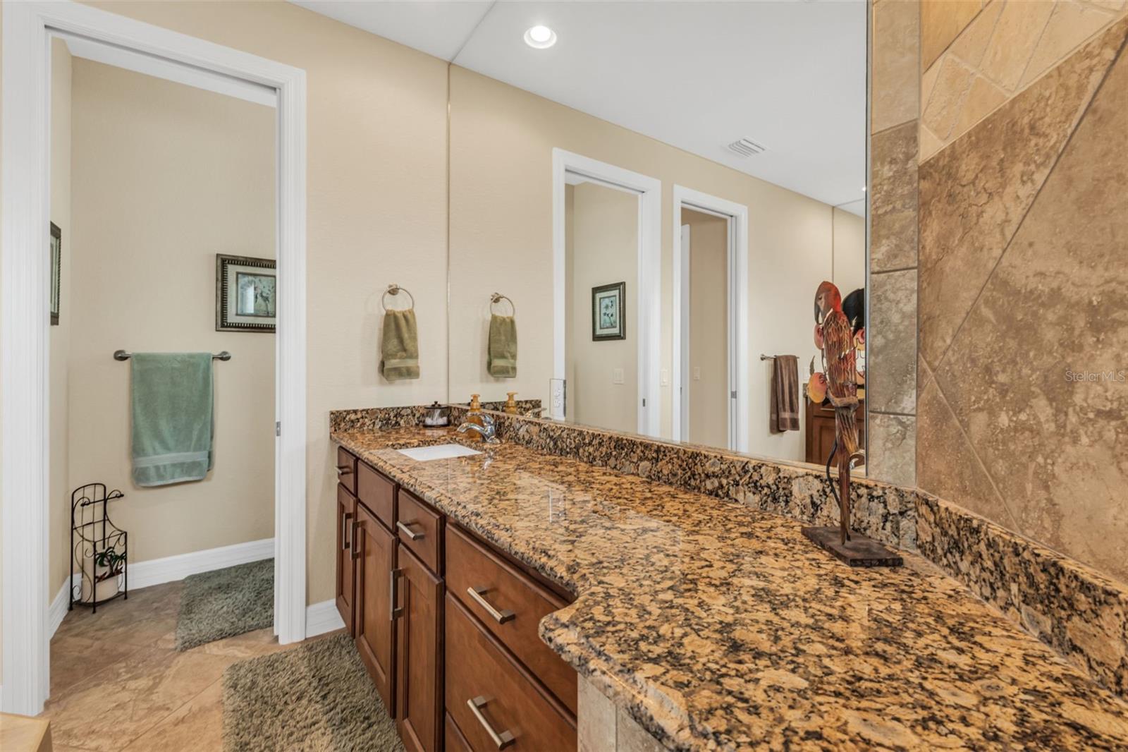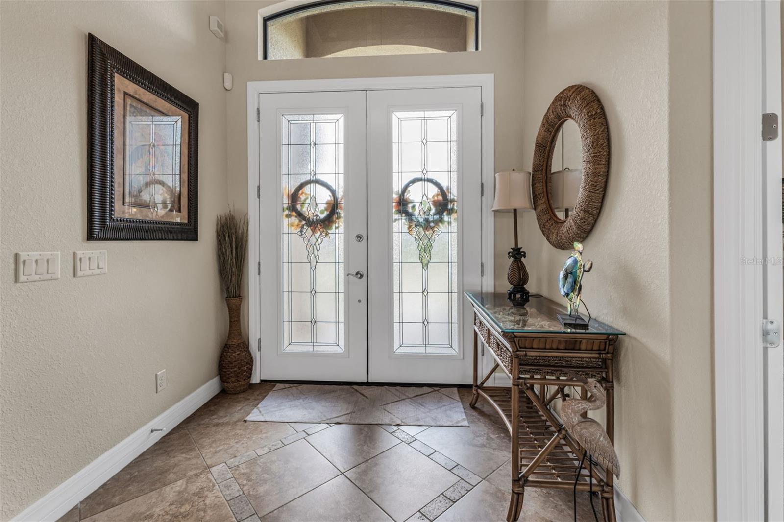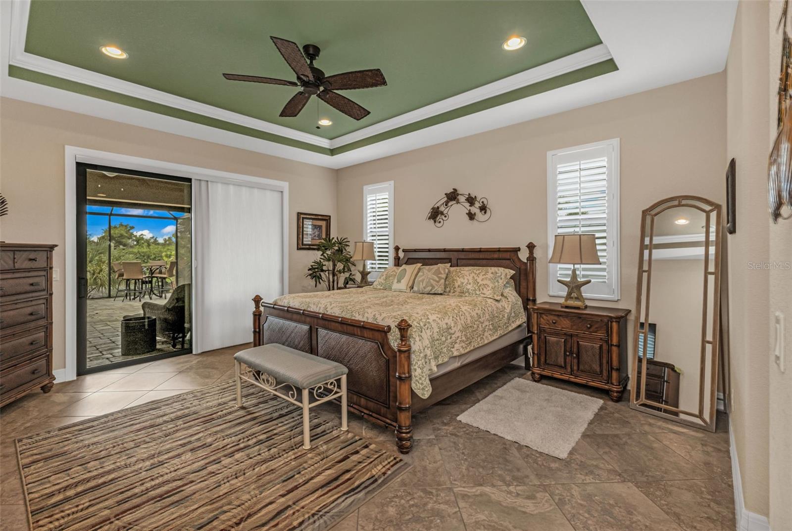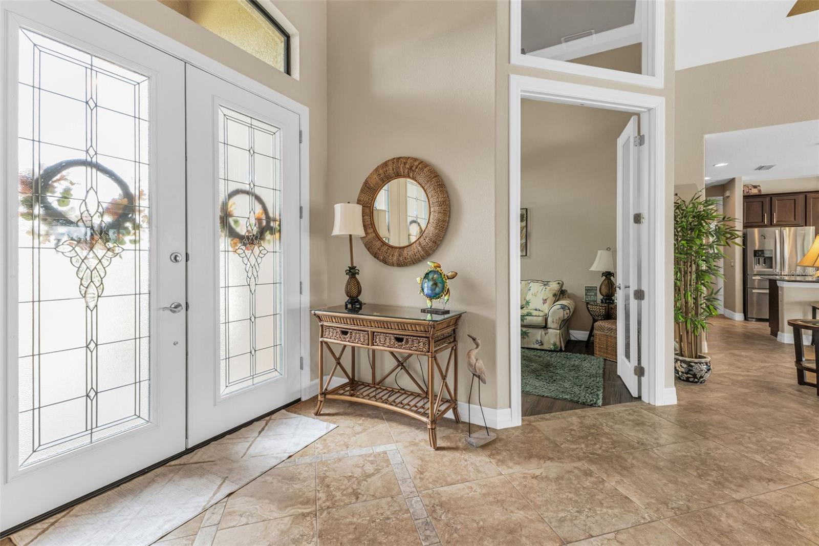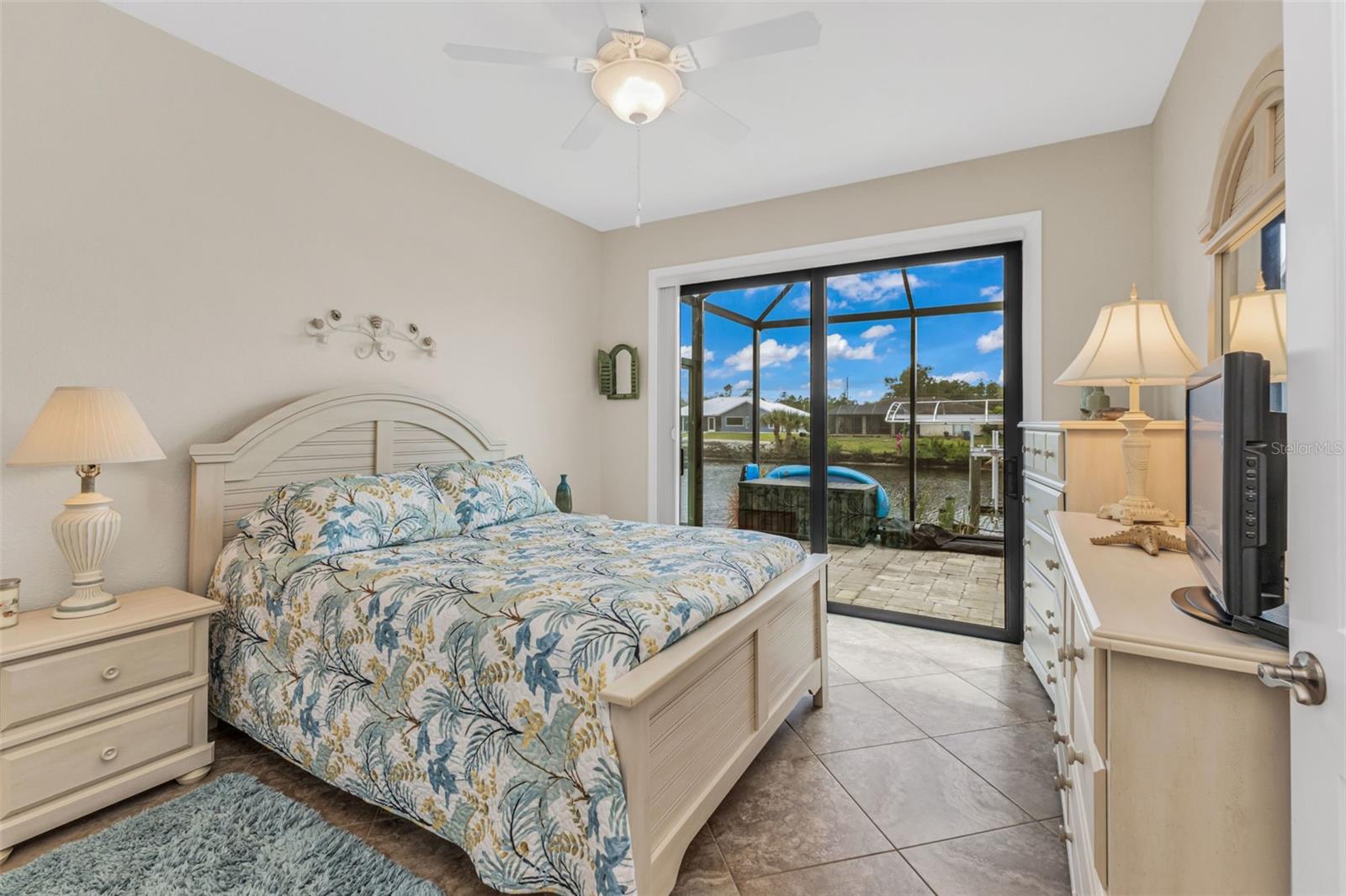 Elegance meets waterfront living in this stunning 3-bed, 2-bath, + office/den, 3-car garage pool home, beautifully situated on a .34-acre canal front lot with 120 feet of frontage and a 10,000 lb boat lift. A brick paver driveway and lush professional landscaping set the tone as you approach the elegant double door entry. Inside, you will find an open split floor plan with dramatic 12 foot tray ceilings, arched 9 foot doorways, and 24 inch ceramic tile laid on the diagonal. One of the most impressive features of this home is the expansive 90 degree sliding glass doors that fully open to the lanai, creating an extraordinary indoor outdoor living experience. These sliders fill the home with natural light, make entertaining effortless, and beautifully frame the water views. The chef's kitchen is complete with granite countertops, a stone tile backsplash, a breakfast bar, and a cozy nook. Rich wood cabinetry offers an abundance of storage with pull-out shelves and soft-close drawers, complemented by stainless steel appliances, a double oven, and a wine fridge. The primary suite is a relaxing retreat with two walk-in closets, dual sinks, a spa tub, and a Roman-style walk-through shower with a built-in bench and rain shower head. Two guest bedrooms provide comfortable accommodations, and one opens directly to the lanai for easy pool access. The guest bath is thoughtfully positioned to also serve as a convenient pool bath. Step outside to a spacious screened lanai designed for true Florida living. Enjoy a 6-foot deep heated saltwater pool, comfortable seating areas, and a wet bar with granite counter, mini fridge, and TV hook up. Lush tropical landscaping surrounds the lanai, creating a natural privacy screen and a tranquil resort-like setting. A Kevlar screen system provides peace of mind and makes storm preparation simple. A full paver walkway leads to the private dock with boat lift, offering quick access to the Myakka River in just 10 minutes and then out to the Gulf for endless boating and fishing adventures.This home includes impact windows throughout, a solar power system with two Tesla battery packs, and a new roof in 2023 for exceptional energy efficiency and storm protection. A security system with five exterior cameras provides added peace of mind. The 3-car garage offers space for vehicles, storage, or a workshop, adding everyday convenience and value. Additional features include a full-home reverse osmosis system and a newer HVAC system and hot water heater (2017). A large laundry room with built-in storage completes the thoughtful design. Furnishings available under a separate agreement. This property blends elegant design, modern upgrades, and an unbeatable waterfront lifestyle. All of this is just minutes from shopping, dining, medical facilities, Highway 41, Interstate 75, and the beautiful Gulf beaches. A perfect combination of comfort, convenience, and coastal beauty. Don't wait to make it yours!