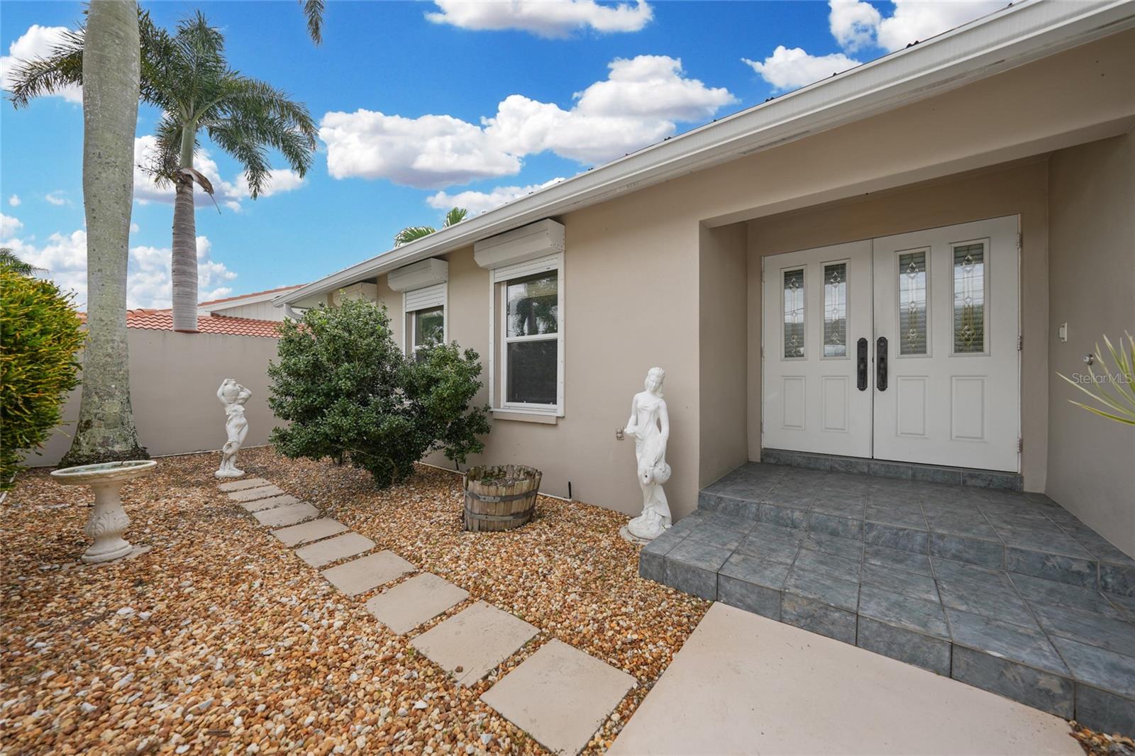 Exterior: French Doors, Hurricane Shutters, Private Mailbox, Rain Gutters, Sidewalk, Sliding Doors