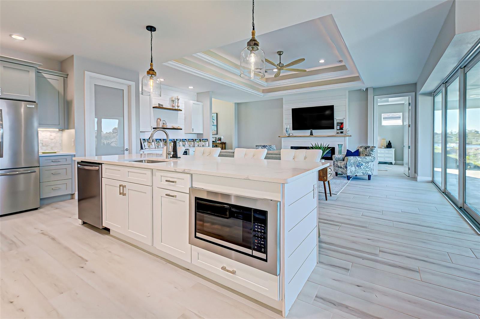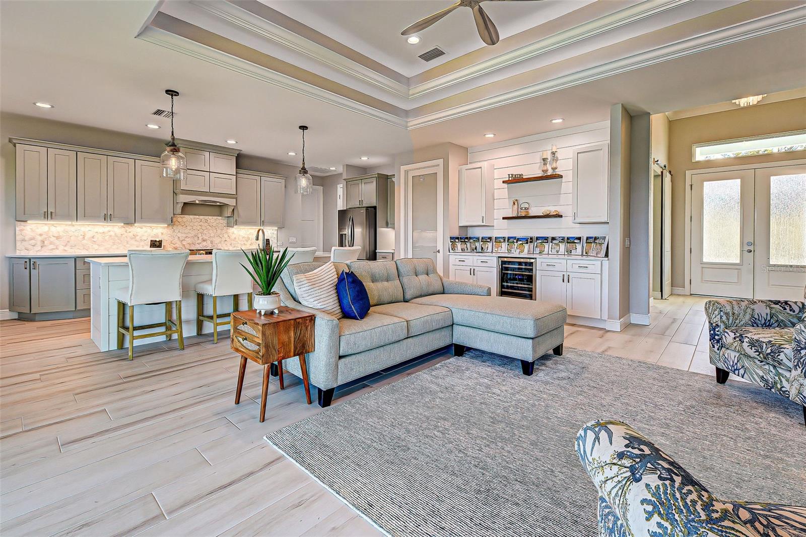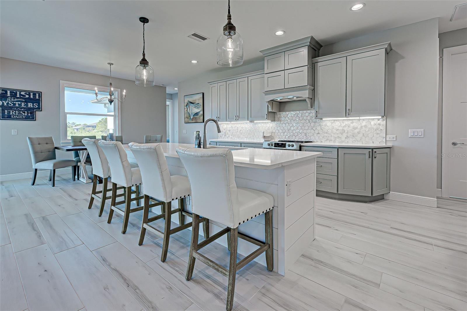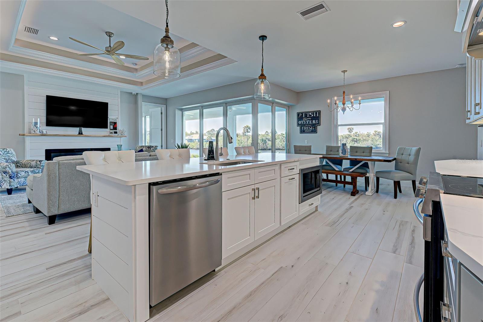 This award-winning model home is truly a gem! Hurricane tested and high and dry! As you step through the front door, the breathtaking waterfront view immediately captivates your attention, setting the tone for a home filled with elegance and charm. The seamless flow of the open floor plan, accentuated by the corner impact slider, creates a welcoming space that is perfect for hosting gatherings both indoors and outdoors. The inclusion of a separate office or flex space adds versatility to the layout, while the abundance of closets and the oversized walk-in pantry ensure that storage is never an issue in this thoughtfully designed home. The primary bedroom, with ample room for a king-size bed and dressers, offers a peaceful retreat complete with not one, but two walk-in closets. The en suite primary bathroom promises a spa-like experience, adding a touch of luxury to your everyday routine. Guests will feel right at home in the second bedroom, which boasts a queen-size bed accommodation, generous closet space, and its very own en suite bathroom for added convenience and privacy. The third bedroom continues the theme of comfort and functionality, providing another queen-size bed option along with plenty of closet space to keep belongings organized. To top it off, the oversized garage ensures that parking is never a hassle, accommodating even a full-size truck with ease. This home truly offers a blend of beauty, functionality, and comfort, making it a rare find that is not to be missed. If you're interested in experiencing the magic of this model home firsthand, don't hesitate to schedule a tour today. Seeing the property in person will allow you to fully appreciate all its features and envision the possibility of calling this stunning waterfront retreat your own.