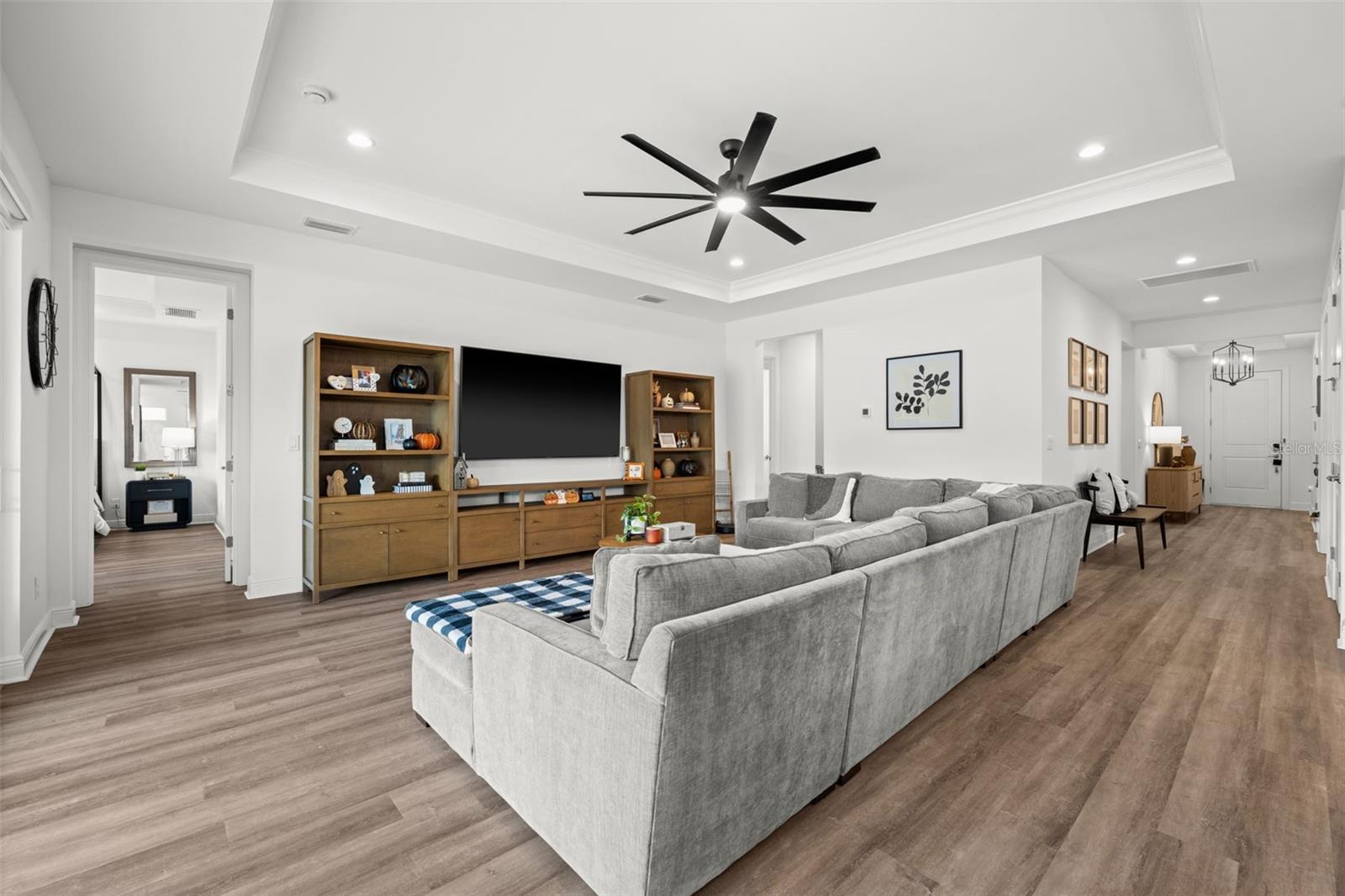 Exquisite design meets everyday functionality in this stunning 4-bedroom + den, 4-bath home with a spacious loft--crafted to impress from every angle. Step inside and you'll immediately notice the luxury vinyl plank flooring that flows seamlessly throughout, including the upstairs loft, setting a tone of refined continuity.The gourmet kitchen is a chef's dream, featuring built-in upgraded GE Profile appliances, gas cooktop, built in oven, and morning kitchen that adds both convenience and style. Throughout the home you'll find upgraded light fixtures and ceiling fans, as well as craftsman touches including custom trim work, crown molding in the tray ceilings, and automatic roll-down window treatments that add sophistication and comfort.Retreat to the owner's suite with its spa-like walk-in shower, while guests enjoy ample space and privacy with well-appointed secondary bedrooms and baths. The laundry room offers built-in cabinetry and a utility sink, while the garage offers epoxy flooring, built in storage closet, husky garage cabinets, and a pull down ladder with access to oversized storage in the attic.Outside, an extended paver lanai and impact windows provide peace of mind and plenty of room to entertain or unwind. The lanai comes prepped with outdoor kitchen gas and water hookups, as well as wiring for outdoor tv and speakers. Every element of this home was thoughtfully designed--inside and out--to deliver comfort, luxury, and timeless appeal in one perfect package.
