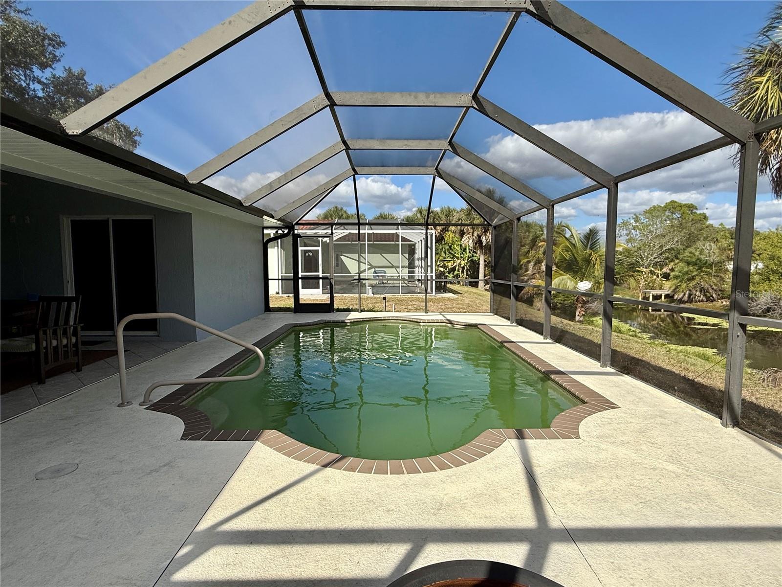 Enjoy waterfront living in this three-bedroom, two-bath, two-car garage pool home, located on the Blue Ridge freshwater canal in North Port. This split floor plan features ceramic tile throughout and includes a den with French doors that can be used as a fourth bedroom, home office, or flex space.The kitchen features granite countertops and opens to a bright breakfast nook with a large picture window overlooking the heated saltwater pool. There is also a formal dining area.Step outside to the pool area, ideal for entertaining or simply unwinding while taking in peaceful canal views. The private dock makes it easy to fish from your backyard or enjoy quiet moments by the water. Conveniently located just minutes from dining, shopping, and easy access to the interstate. New HVAC installed September 2025.
