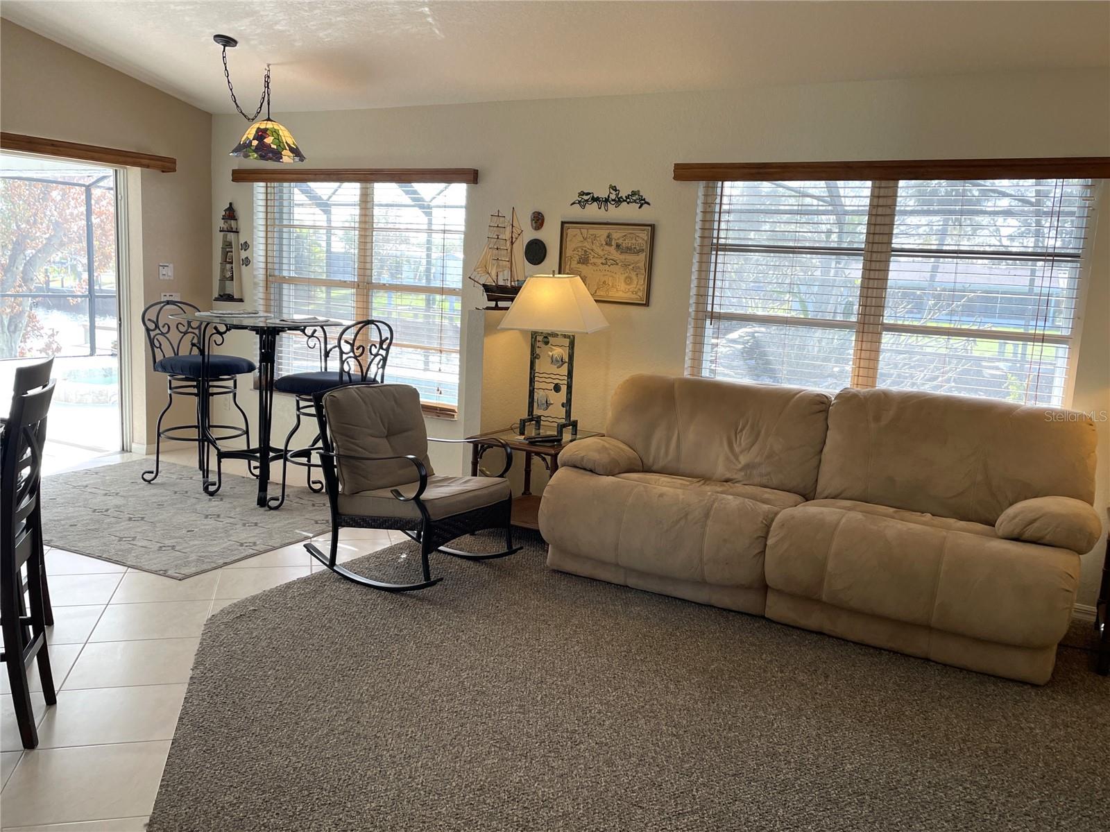 Waterfront, NEVER FLOODED, pool home in quiet Port Charlotte on the Spring Lake Waterway. One bridge out, approx. 10-15 min. to Charlotte Harbor that takes you to the Peace and Myakka Rivers and the Gulf of Mexico. This 1889sf under air, 3/2/2, split floor plan pool/spa home is connected to county water and sewer. This pool home is well maintained and has many updates. This home boasts high ceilings, the front window in the Living Room is hurricane impact with electronic blinds. The 82" wall mounted TV conveys with the home. The Dining Room has a plant shelf with up lighting, and sliders to the outdoor living space. The Master Bedroom is off off the Dining Room. It has 2 walk-in closets and an updated bathroom with 2 sinks and a walk-in shower and a window to allow in natural light. There are sliders out to the lanai and pool. The Guest bedrooms, 2nd bathroom, and Laundry room are on the opposite side of the home. The Guest Bathroom is located between the 2 bedrooms. It has a tub/shower and large vanity for additional storage. The 2nd and 3rd bedrooms are spacious and private. The Laundry Room has a very large closet, cabinets, shelves, and a wash tub. The washer and dryer convey with the home. There is a screen door out to the oversized garage (478sqft). The Kitchen, Dinette and Family room share a space in the back of the home. The dishwasher was replaced 2024 and microwave 2022, The Kitchen has white cabinets and Corian counter tops. There is a large breakfast bar with plenty of seating. The Dinette area overlooks the pool and canal. There are sliders out to the huge under roof/ screened outdoor living space. The Family Room also has a great view of the water. Most of the rooms have ceiling fans. Additional seating in the backyard near the canal makes a great place to hang out. There is a seawall along the canal with access to water and electric near the dock. the seawall was re-enforced (pumped behind the seawall) with Polyurethane in 2024. The 8x40 composite dock was replaced in 2017. There is a lift that has framing for a cover. The owner thinks the lift size is 10K. The large pool/spa has a pretty waterfall feature that also offers some privacy on the Lanai, a pool heater, and expansive cool deck finish. there is a sidewalk to the backyard. The security system is owned. There are accordion shutters across the back of the home. Come see this beautiful home and fall in love! Some furnishings can convey at the right price. Roof was replaced 2022, A/C 2021, Hot Water heater 2021, Front Window 2020, Garage door 2004.