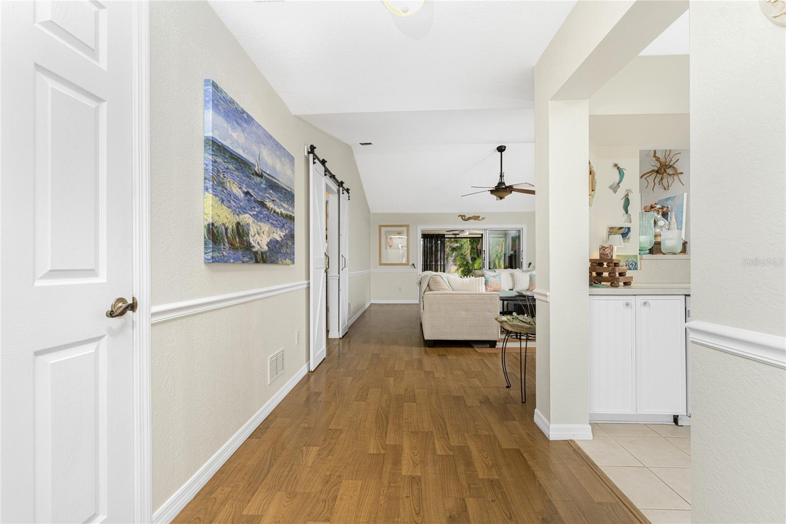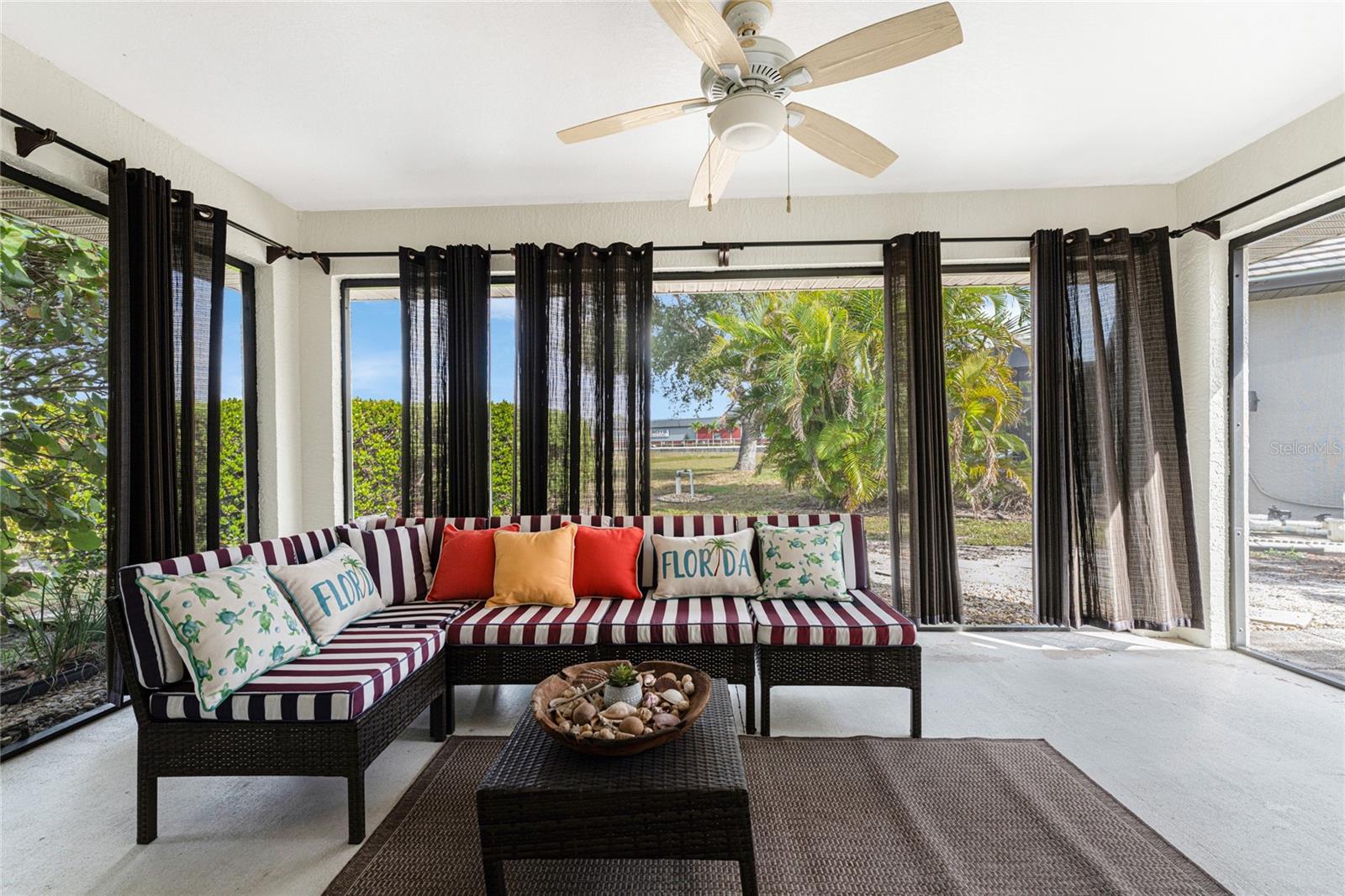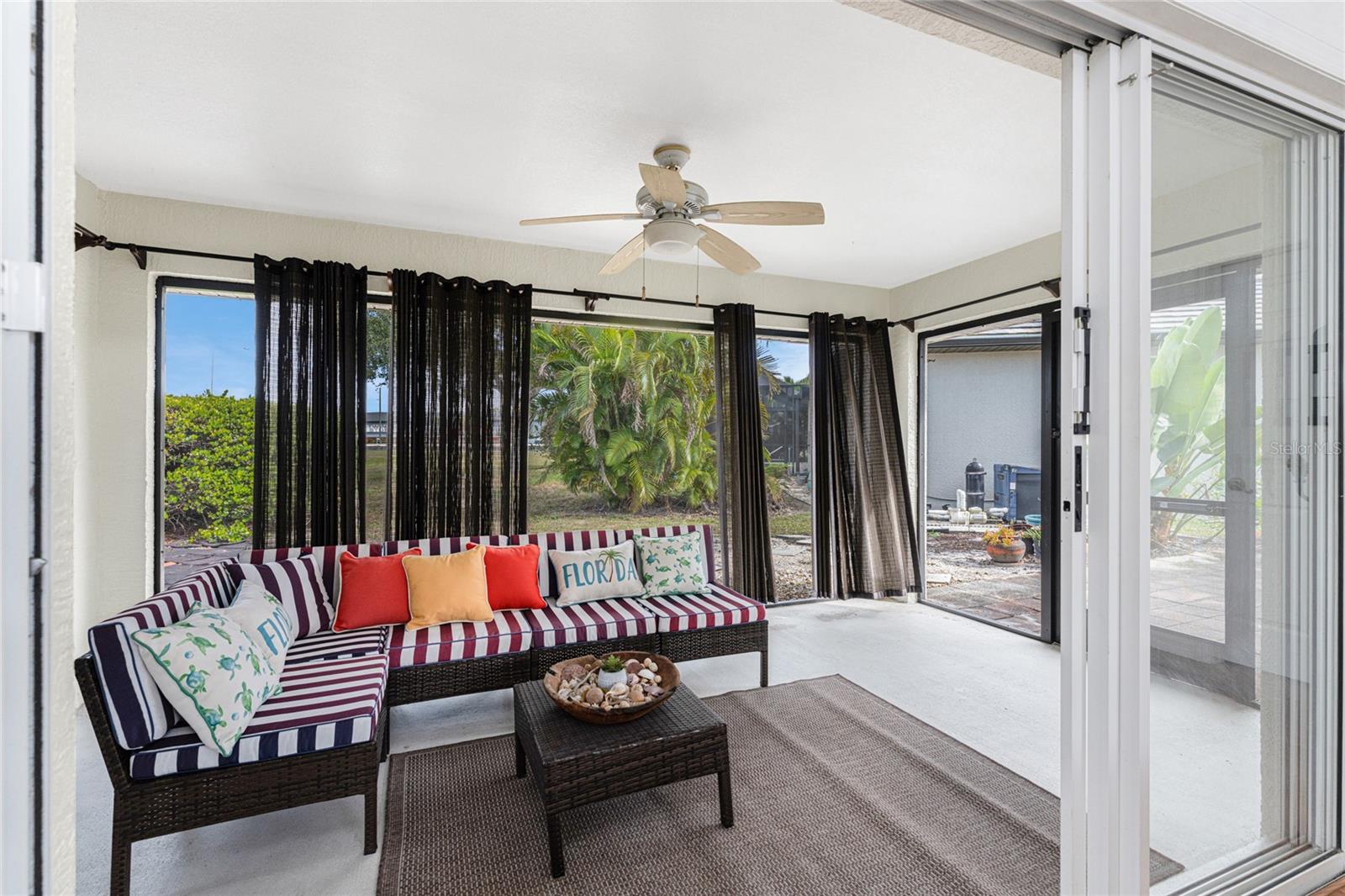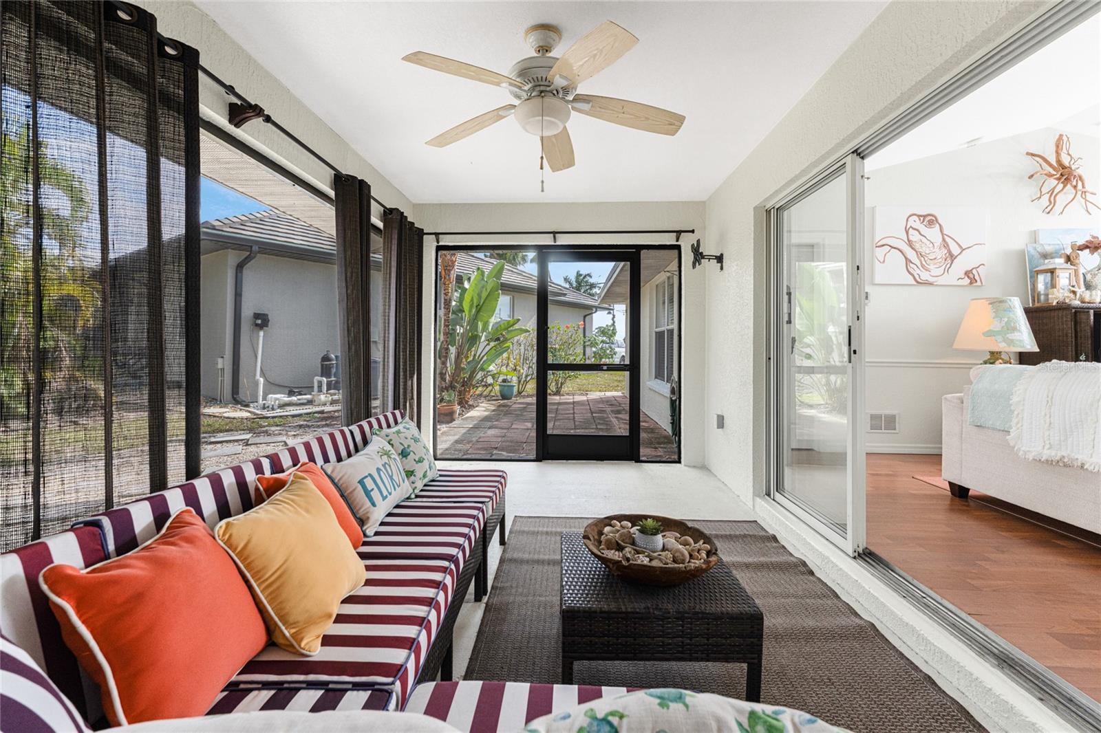 Welcome to 16474 Trading Post Road, a charming, well-maintained home that captures the essence of Florida living! Perfectly positioned on a corner lot in picturesque Burnt Store Lakes. This 3-bedroom, 2-bathroom home offers both privacy and a bright, inviting atmosphere from the moment you arrive. A circular driveway framed by mature tropical landscaping sets the stage for this attractive residence. Step inside through the screened and tiled entry to discover an open, airy split-bedroom floor plan featuring laminate flooring throughout the main living areas and bedrooms and tile floors in the kitchen and baths. The spacious Great Room impresses with cathedral ceilings, chair rail, and 3-panel sliding glass doors that open wide to the screened and covered lanai, seamlessly blending indoor and outdoor living. Enjoy peaceful mornings on your east-facing lanai, where you can savor Florida's brilliant sunrises, or entertain on the adjoining paver patio surrounded by tropical greenery including mango, palms, hibiscus, and bougainvillea. The kitchen is light and bright with attractive beadboard-faced cabinets, a stainless double-basin sink, a breakfast bar with recessed lighting, pantry closet, and a cozy dining alcove highlighted by a beadboard accent wall and three arched windows overlooking the front yard. The primary suite is a relaxing retreat featuring laminate flooring, chair rail, a large window that fills the space with natural light, and a huge walk-in closet. The ensuite bath is accessed via a pocket door and includes a high single-sink vanity, walk-in shower with door, and linen closet. The barn door separating the guest suite area offers privacy for family and visitors. The second guest bedroom is extra-large, and all guest bedrooms feature roomy closets with bifold doors. The guest bath includes a combination tub/shower and highboy toilet. Practical updates include fresh exterior paint, a new roof in May 2024, and a new garage door opener. The 2-car garage features vinyl flooring over concrete, utility sink, washer and dryer, and a manabloc plumbing system. The swale on the left side of the property enhances privacy and open space around the home. This property combines thoughtful updates, comfortable design, and timeless Florida charm--ready for you to move in and start enjoying your next chapter! Burnt Store Lakes residents enjoy public water/sewer, a community park with covered picnic areas, playground, and restrooms, plus a kayak ramp accessing Charlotte Harbor and its incredible wildlife--manatees, porpoises, sea turtles, and abundant game fish. Adjacent Burnt Store Marina offers a full-service deep-water marina, restaurants open to the public, golf, and optional dockage. Just a short drive to Downtown Punta Gorda or Cape Coral, this location provides the best of Southwest Florida living. Experience the perfect blend of luxury, comfort, and natural beauty--this is Florida living at its finest.