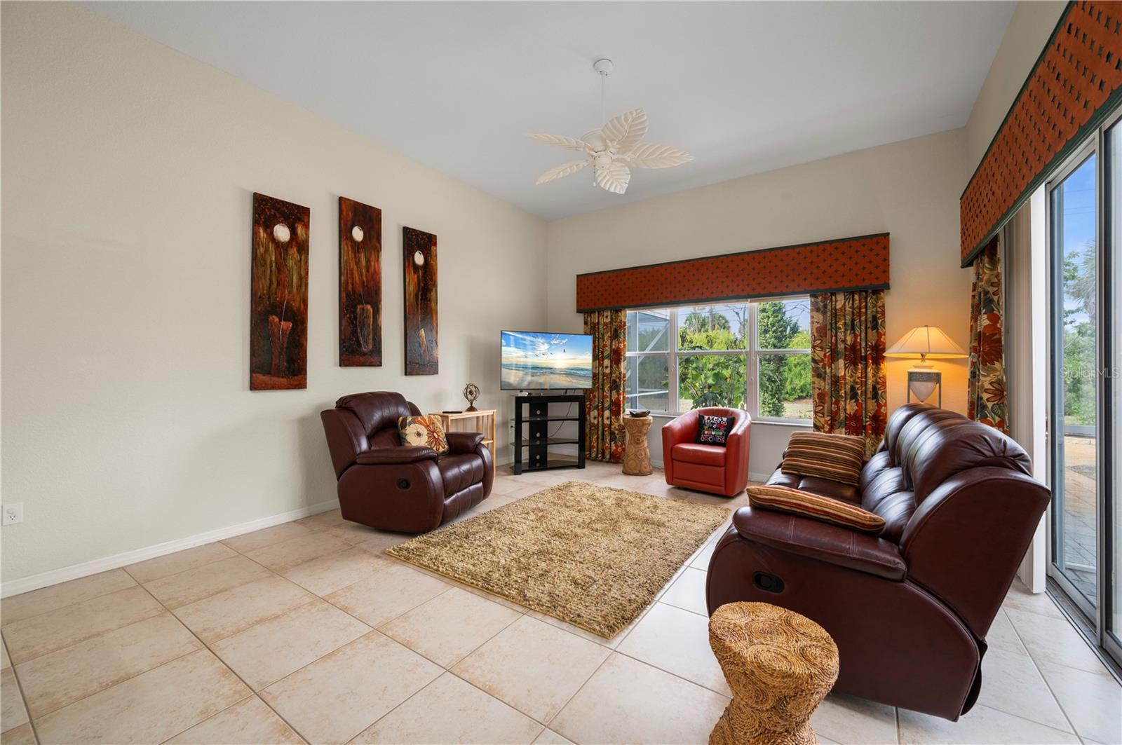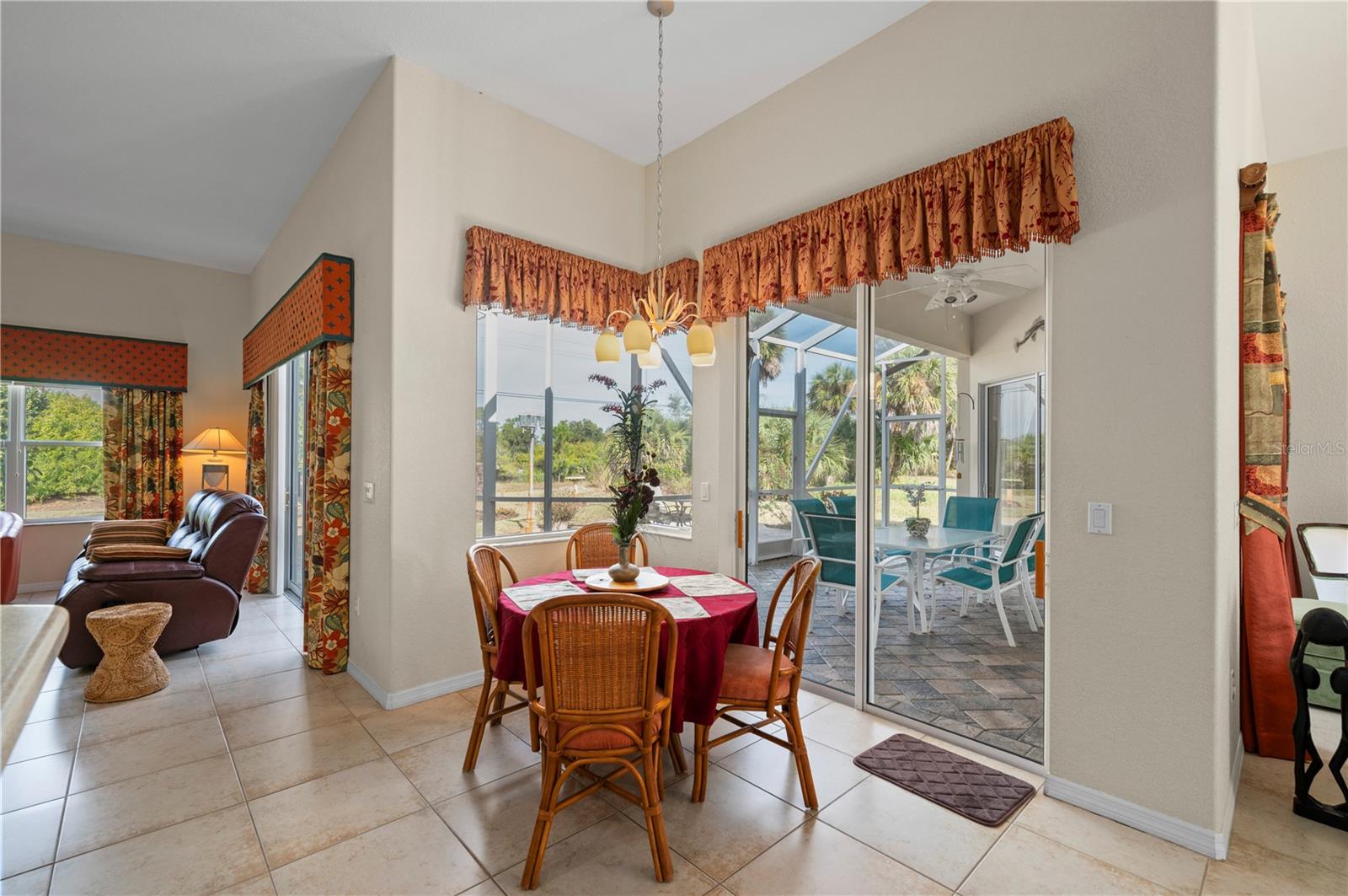 There is a certain ease to this 3 bedroom 2 bath home, a feeling that every room was planned to make everyday living more peaceful, more open, and more connected. Morning light drifts through every corner of this 2,292 square foot home, rising along 12 foot ceilings and tray accents as though the space was designed to greet the day. Rooms open naturally to one another, creating an easy rhythm throughout the home, and triple sliding glass doors gently blur the line between indoor comfort and outdoor living. Inside, the kitchen feels like the heart of the home, warm with natural tone cabinetry, generous counter space, stainless steel appliances, and a ten foot breakfast bar that is perfect for sharing meals or catching up with friends while cooking. A subtle plant shelf accent and pocketing doors add character and practicality without interrupting the home's inviting flow. The primary bedroom provides a peaceful retreat, spacious enough for a cozy reading corner, and connects to an upgraded bath with dual granite vanities, a garden tub, and a walk around shower framed with glass block and dual showerheads. Two additional guest rooms share a bath that also opens to the outdoors, ideal for relaxed Florida living. Step outside the screened porch becomes a quiet pause before giving way to the open air paver lanai, where a curved pathway leads toward a fire pit area that becomes a favorite gathering place as the sky softens over the lake and distant vistas glow in the evening light. The oversized lot is framed by mature landscaping and supported by a private irrigation well with plenty of room to add a pool of your design. With Rotonda's well kept neighborhoods, nearby golf courses, scenic pathways, parks, and easy access to some of the area's finest beaches, the setting adds a natural sense of lifestyle to a home that already offers warmth, comfort, and space to enjoy it all.