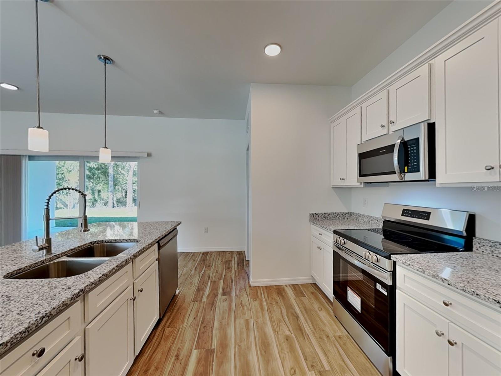 This spacious 3-bedroom, 2-bath residence offers 1,548 square feet of thoughtfully designed living space with an attached 2-car garage and high-end finishes throughout. Step inside to a bright, open-concept floor plan with 9'4" ceilings and abundant natural light. LVP flooring runs throughout the home, creating a modern and cohesive feel. The expansive great room flows seamlessly into the kitchen--perfect for both everyday living and entertaining. The chef-inspired kitchen features brand-new stainless steel appliances, granite countertops, a large center island, and ample cabinet space. Sliding glass doors open to a spacious covered lanai, extending your living space outdoors. The private primary suite offers two walk-in closets and a spa-like en-suite bathroom with dual vanities, a soaking tub, and a fully tiled walk-in shower. Two additional generously sized bedrooms provide flexibility for family, guests, or a home office. Additional highlights include impact windows, central A/C and heating, washer and dryer hookups, and a large backyard ready for outdoor enjoyment.Ideally located in Port Charlotte, you'll enjoy easy access to world-class beaches like Siesta Key and Englewood, along with golf courses, shopping, dining, boating, fishing, and spring training baseball.