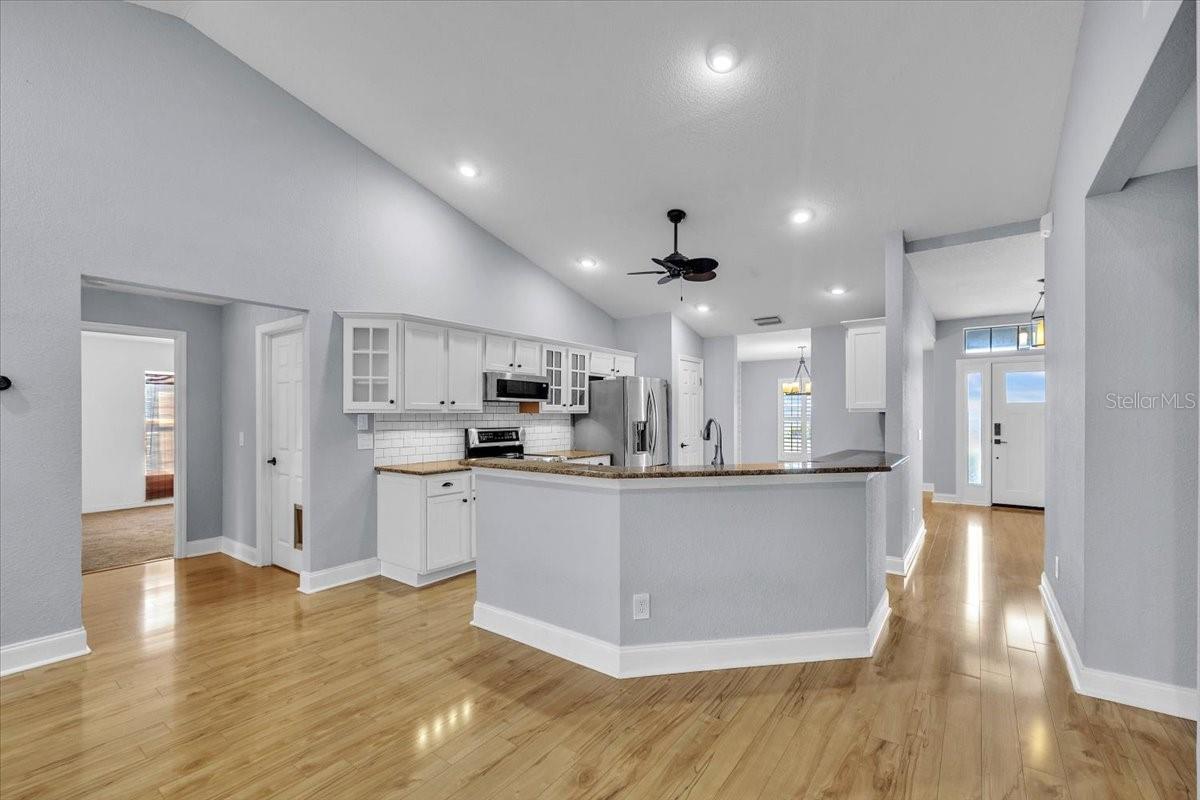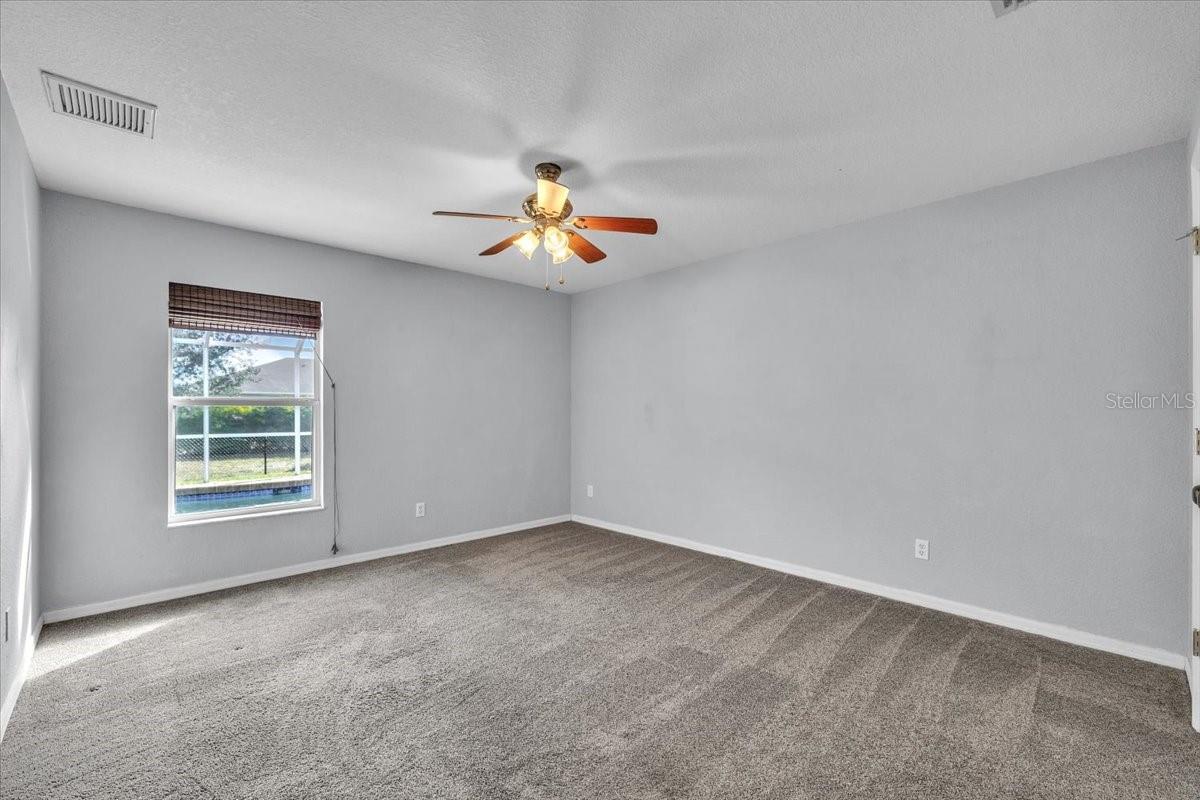 Beautifully maintained 4-bedroom, 3-bathroom pool home with 2,455 square feet of living space, ideally located on a quiet cul-de-sac in the highly sought-after, deed-restricted Deep Creek community. This single-story residence offers excellent curb appeal with a modern exterior, fresh neutral paint, and a welcoming covered entry with paver flooring. Mature landscaping, including palm trees and manicured shrubs, enhances the home's contemporary aesthetic, and a wide driveway leads to a two-car garage for ample parking and storage. Step inside to a bright, open-concept entryway filled with natural light and elegant fixtures. The decorative glass front door opens into living and dining areas with rich wood-look flooring. The formal dining room is highlighted by a modern chandelier and large windows with plantation shutters, while the spacious living room features custom built-in cabinetry, a stylish ceiling fan, and clean architectural lines. This central space flows seamlessly into the kitchen and family room, creating an ideal layout for everyday living and entertaining. The kitchen combines style and functionality with stainless steel appliances, resurfaced white cabinetry with glass-front accents, pantry closet, a sleek subway tile backsplash, and granite countertops. A raised bar overlooks the family room, making it perfect for conversation while entertaining. The open layout ensures the kitchen connects naturally to the main living areas. The primary bedroom is a serene retreat featuring a custom accent wall, warm wood-look flooring, and a modern ceiling fan. A custom walk-through dressing closet connects two primary bathrooms, one with a walk-in shower and the other with a soaking tub, offering both convenience and privacy. Two guest bedrooms feature closets with custom shelving and plush carpeting, while a fourth bedroom with French doors provides a versatile space for a bedroom, office, or sitting room. These rooms share an updated full guest bathroom. Outdoor living shines with a screened lanai and heated pool. A large, covered area offers shade and comfort, while the expansive paver pool deck provides space for sunbathing, relaxing, and entertaining, all within a fenced backyard for privacy and security. Additional features include plantation shutters, recessed lighting, a large laundry room with storage, city water and sewer, A/C (2017), water heater (2022), new roof (2023), closet organizers in all closets, shiplap walls, and more. Located just minutes from golf, shopping, dining, entertainment, I-75, medical facilities, and waterfront parks, this home perfectly combines comfort, style, and convenience--ready for family living or seasonal guests. **PLEASE ENJOY THE 3D INTERACTIVE VIRTUAL TOUR ASSOCIATED WITH THIS LISTING**