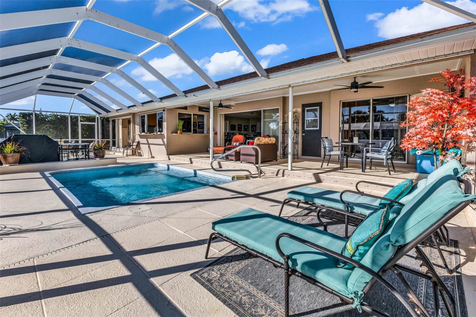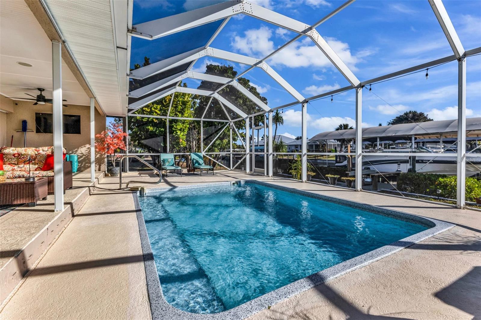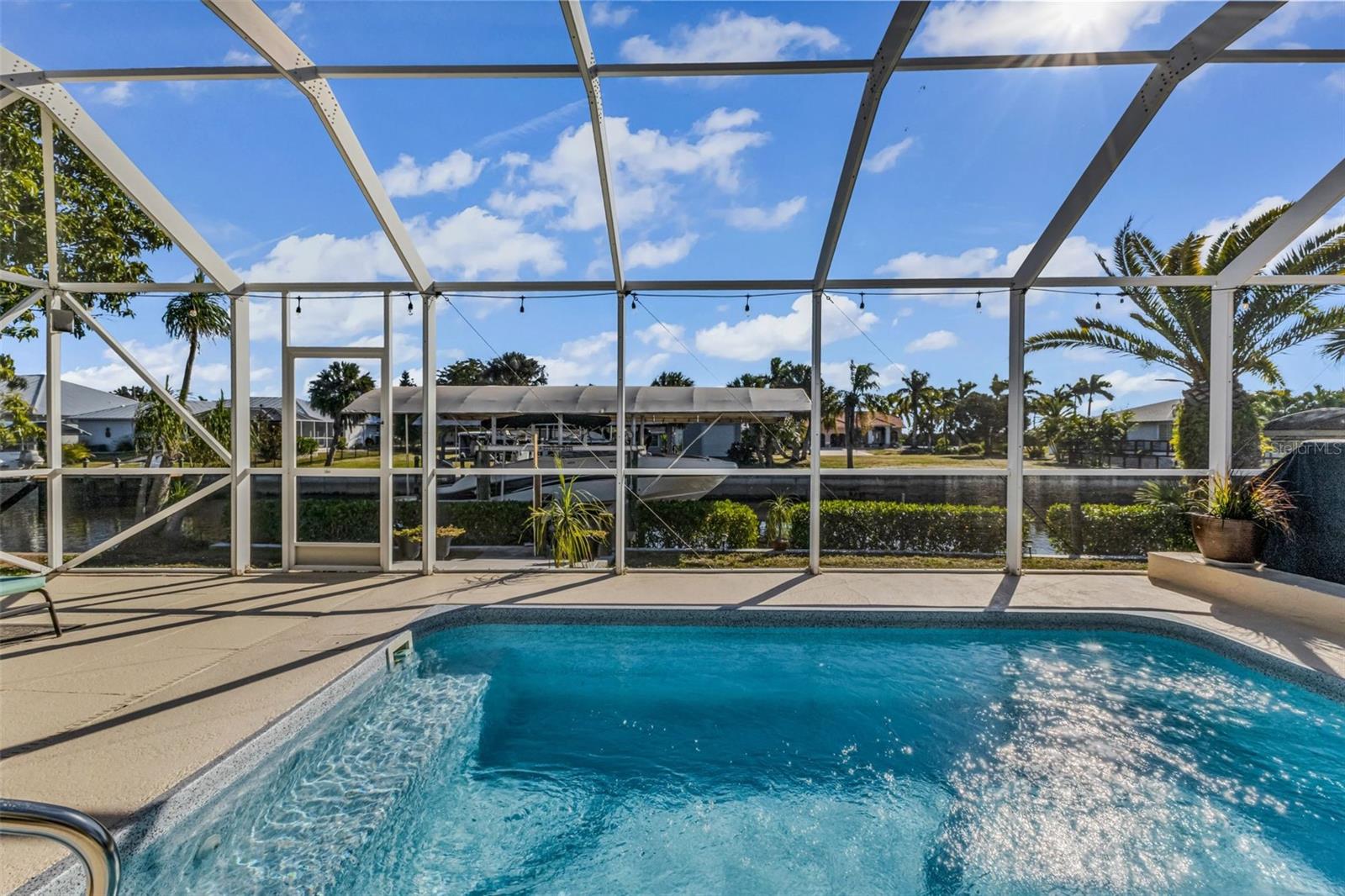 Welcome to your Florida dream home in desirable Harbor Heights, where boating, fishing, and waterfront living come together effortlessly. This beautifully remodeled 2-bedroom, 2-bath residence is perfectly situated on a saltwater canal with no bridges and quick Gulf access, allowing you to jump on your boat and be out to the Peace River and the Charlotte Harbor In in just minutes.Designed for both comfort and entertaining, the home features an open and split floor plan with stunning water views from the main living areas. The gourmet kitchen overlooks the pool and canal and offers granite countertops, updated cabinetry, and a layout ideal for everyday living or hosting guests. The spacious living room is enhanced by a custom electric fireplace, creating a warm and inviting atmosphere.Step outside to a large screened lanai that showcases tranquil canal views, perfect for relaxing after a day on the water. The heated pool invites year-round enjoyment, while the covered boat lift with electric makes boating simple and convenient. Cast a line from your own backyard or enjoy the peaceful waterfront setting--this is true Florida living with views of Peace River from Backyard.The primary suite is generously sized with tile flooring, a walk-in closet, and a well-appointed en-suite bath featuring dual sinks, a walk-in shower, and abundant storage. The second bathroom doubles as a pool bath and includes a jetted tub with shower, ideal for guests or post-pool convenience.This property has been meticulously maintained and upgraded throughout, offering peace of mind and pride of ownership. Located in a no HOA community, you'll enjoy flexibility and freedom with quick access to boating, fishing, and the open waters of Charlotte Harbor. Flood insurance is currently approximately $2,400 and assumable, adding additional value.Whether you're seeking a full-time residence, winter retreat, or waterfront getaway, this exceptional Harbor Heights home delivers lifestyle, location, and lasting value--all in one remarkable package.