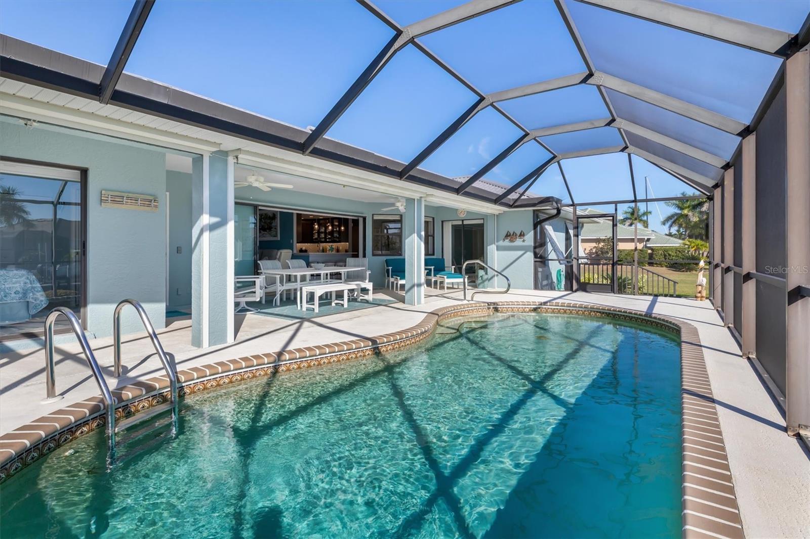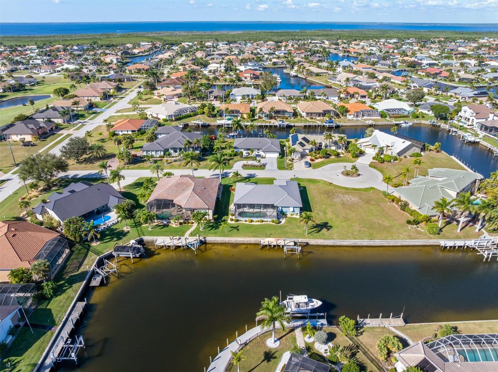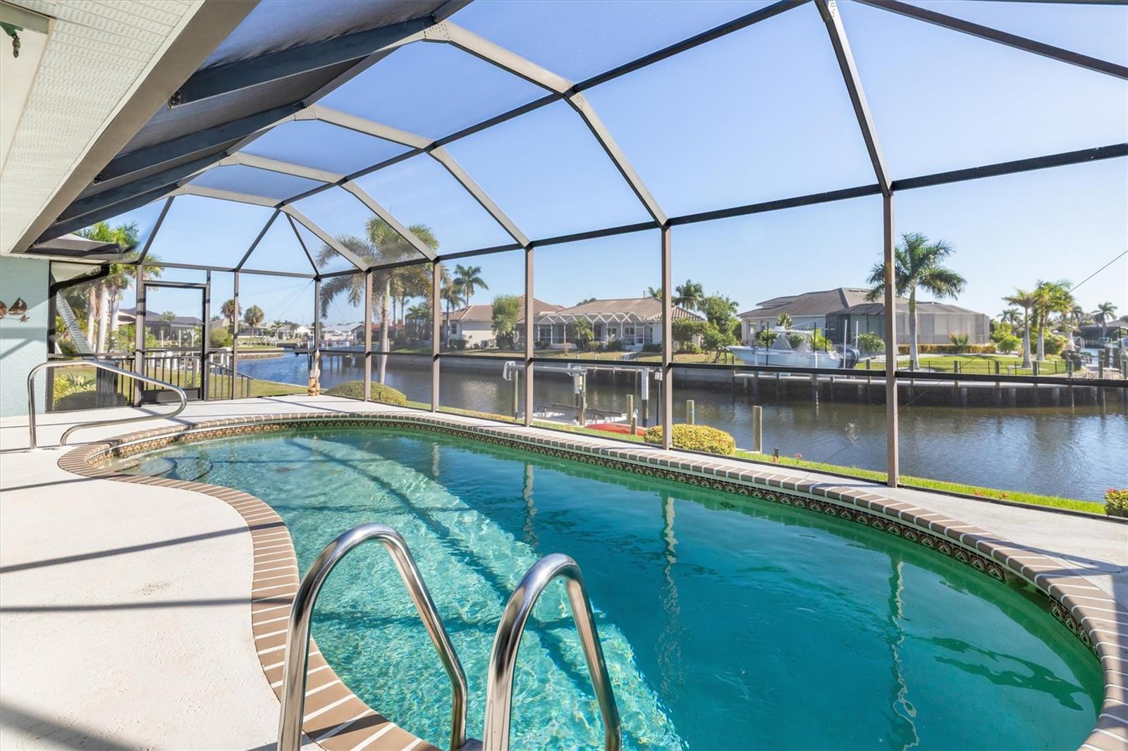 WELCOME TO YOUR PRIVATE COASTAL OASIS--where luxury, lifestyle, and peace of mind come together. Nestled on a quiet cul-de-sac street, this stunning waterfront pool home has been impeccably renovated to the caliber of a model luxury residence, offering refined finishes and thoughtful upgrades throughout. Enjoy complete confidence knowing this home did not flood, features a new roof (2023), and underwent a full interior renovation in 2024--from flooring to finishes and everything in between. A whole-house water filtration and conditioning system enhances everyday living, while dual water heaters serve each side of the home for added comfort and efficiency. The show-stopping kitchen boasts high-end appliances, elegant cabinetry, and a large custom pantry cabinet, making it as functional as it is beautiful. Vaulted ceilings create an open, airy feel, ideal for entertaining and effortless indoor-to-outdoor living. All bedrooms provide spacious closets, and the primary suite is a true retreat featuring two walk-in closets and a beautifully updated ensuite bathroom. A versatile bonus room provides endless possibilities - additional sleeping quarters, home office, den, or creative space as it has a sink and cabinets. Step outside to your gorgeous lanai and resort-style pool with a new heater and pump (2024), overlooking long canal water views on sailboat-access water with no bridges and quick access to open water. Boaters will appreciate the concrete dock and boat lift (2020), while mature, meticulously maintained tropical landscaping (2024) surrounds the home, creating a serene and private escape. Additional highlights include full-house hurricane protection and a prime location close to shopping, Fisherman's Village, and beautiful downtown Punta Gorda, offering dining, events, and waterfront charm just minutes away. This exceptional waterfront home will not last. Schedule your private showing TODAY and begin living your best coastal dream.