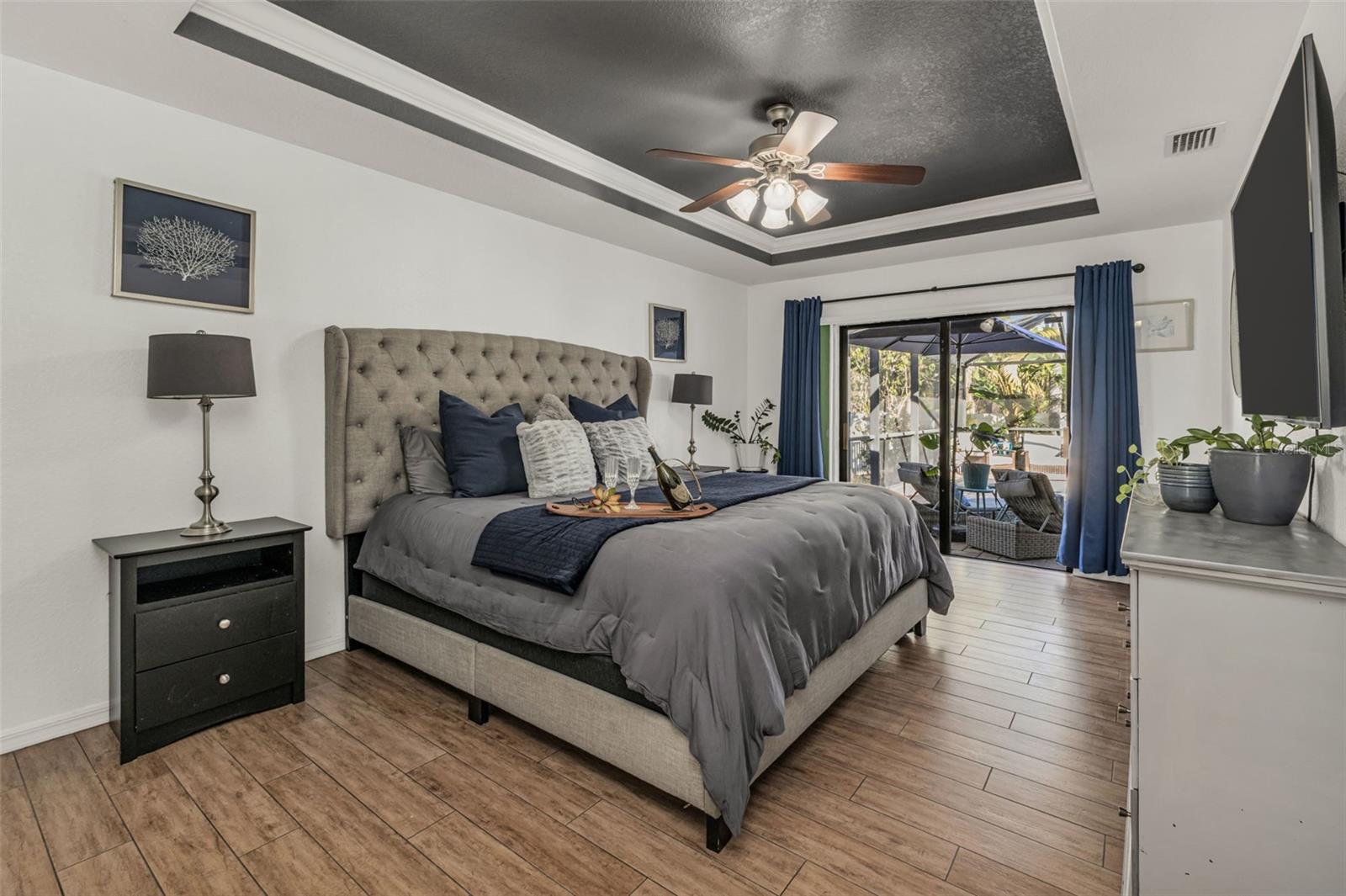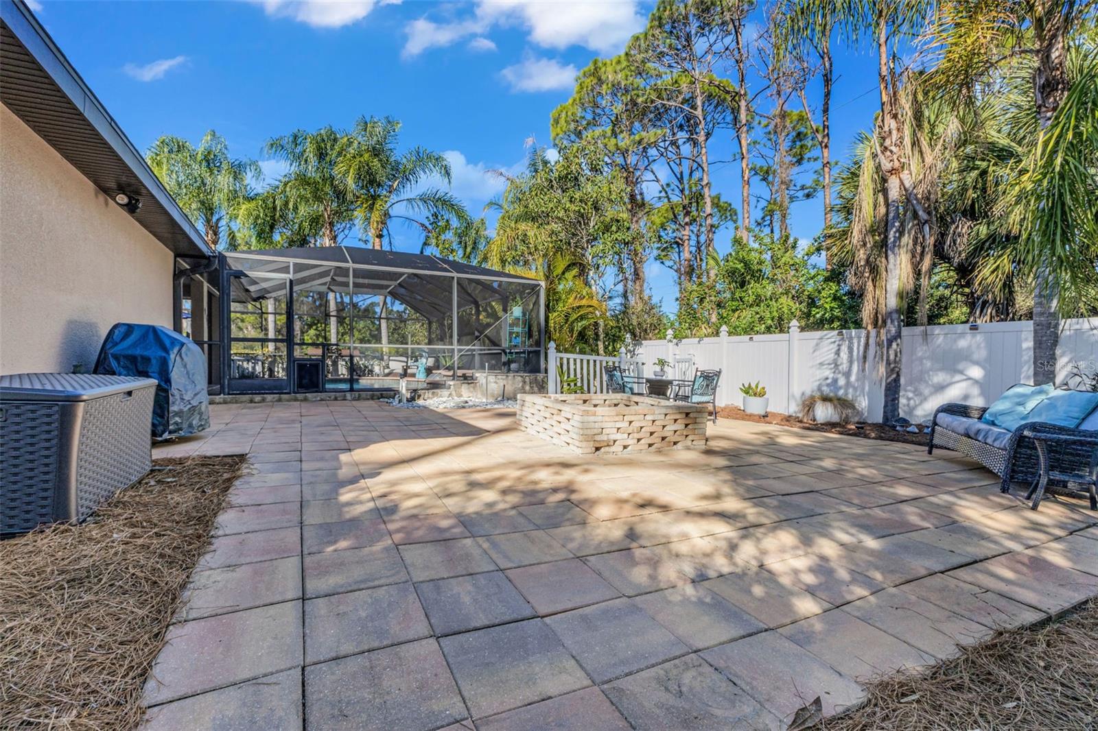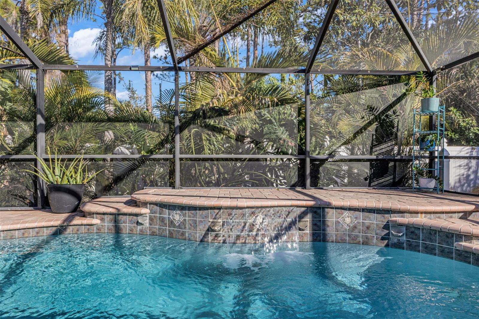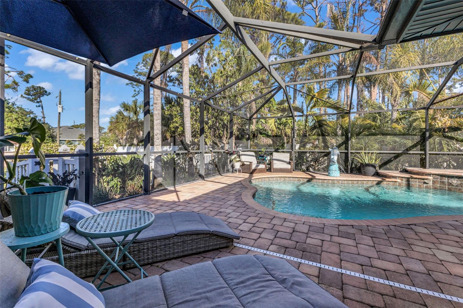 Welcome to Your Private Tropical Oasis! Perfectly situated on a rare double lot, this beautifully maintained 3-bedroom, 2-bath, 2-car garage HEATED pool home is surrounded by lush, mature landscaping that offers exceptional privacy and curb appeal. From the moment you arrive, you'll be impressed by the stamped concrete driveway and walkway and the inviting screened entryway. Inside, the home opens to soaring cathedral ceilings, porcelain and ceramic tile flooring throughout, plantation shutters, and tasteful architectural details including decorative planter shelves. With 2,276 sq ft under air, the layout offers both elegance and functionality, featuring a formal living and dining room plus a spacious family room with Bluetooth surround sound and French doors that seamlessly connect indoor and outdoor living. The kitchen is designed to impress, offering granite countertops, stylish backsplash, stainless steel appliances, a breakfast bar, pantry closet, and an abundance of cabinetry and counter space--perfect for entertaining or everyday living. The laundry room is thoughtfully designed with a washer and dryer, and cabinetry for everyday convenience. The primary suite is a true retreat with tray ceilings, a walk-in closet, and sliding glass doors leading to the lanai. The en-suite bathroom features dual sinks, a walk-in shower, jetted garden tub, and a linen closet. A desirable split-floor plan provides privacy for guests and includes two guest bedrooms, a bonus room perfect for an office/or den, and a guest bath with pool access. Step outside to your resort-style backyard featuring a sparkling heated pool with a tranquil waterfall and a screened brick-paver lanai--ideal for both relaxing and entertaining. An additional brick-paver patio beyond the lanai is ideal for grilling or gathering around a fire pit. The fully fenced backyard and tropical landscaping complete this serene outdoor oasis. Bonus SHED for extra storage. Updates include: Hot Water Heater & Pool Filter 2025, Roof 2024, Pool Heater & Leach Field replaced 2022, Shed 2019, and AC 2017. NO HOA or DEED RESTRICTIONS! This home is conveniently located in a nice neighborhood but close to restaurants, shopping, beaches and much more, this home is a must-see! Schedule your appointment today and make it yours!
