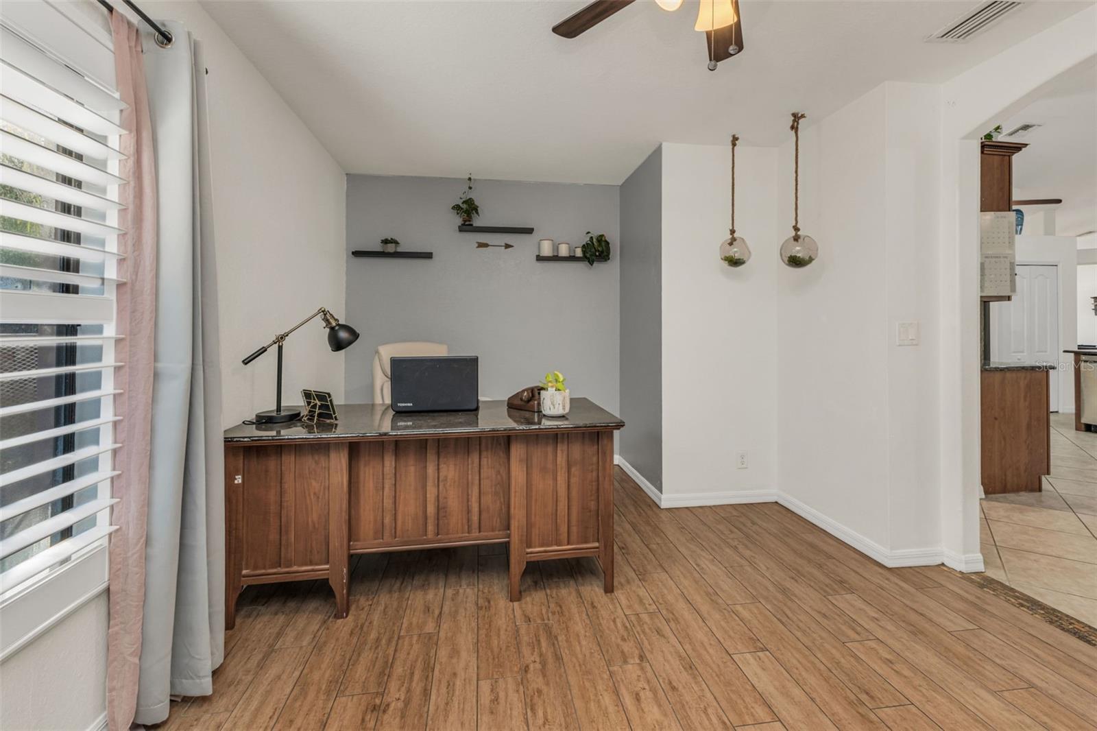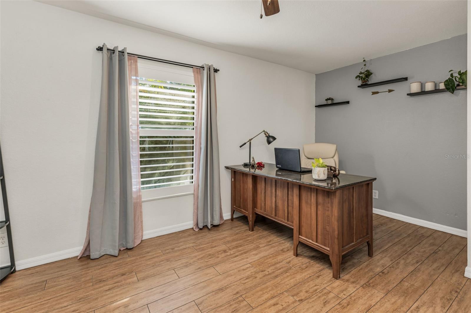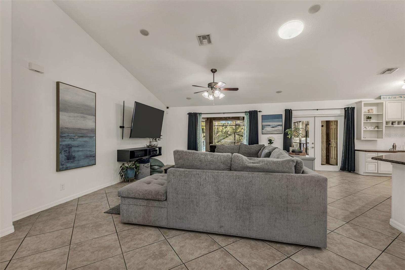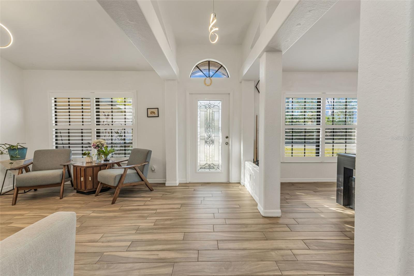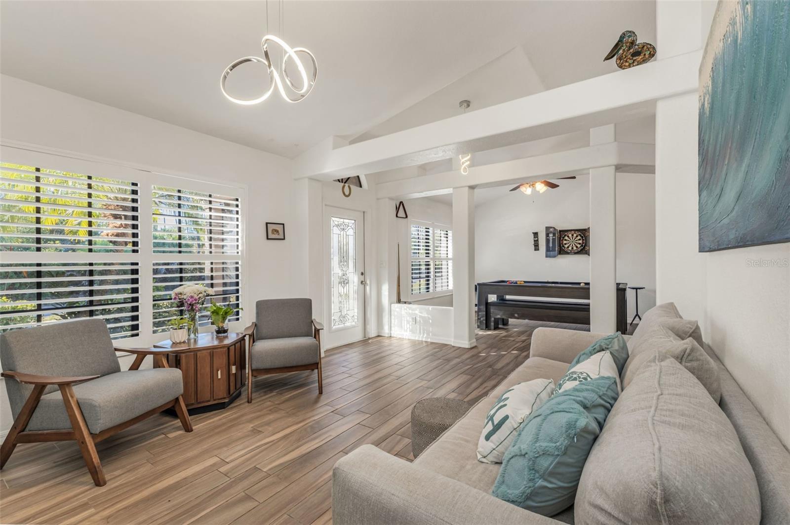 Welcome to Your Private Tropical Oasis! Perfectly situated on a rare double lot, this beautifully maintained 3-bedroom, 2-bath, 2-car garage HEATED pool home is surrounded by lush, mature landscaping that offers exceptional privacy and curb appeal. From the moment you arrive, you'll be impressed by the stamped concrete driveway and walkway and the inviting screened entryway. Inside, the home opens to soaring cathedral ceilings, porcelain and ceramic tile flooring throughout, plantation shutters, and tasteful architectural details including decorative planter shelves. With 2,276 sq ft under air, the layout offers both elegance and functionality, featuring a formal living and dining room plus a spacious family room with Bluetooth surround sound and French doors that seamlessly connect indoor and outdoor living. The kitchen is designed to impress, offering granite countertops, stylish backsplash, stainless steel appliances, a breakfast bar, pantry closet, and an abundance of cabinetry and counter space--perfect for entertaining or everyday living. The laundry room is thoughtfully designed with a washer and dryer, and cabinetry for everyday convenience. The primary suite is a true retreat with tray ceilings, a walk-in closet, and sliding glass doors leading to the lanai. The en-suite bathroom features dual sinks, a walk-in shower, jetted garden tub, and a linen closet. A desirable split-floor plan provides privacy for guests and includes two guest bedrooms, a bonus room perfect for an office/or den, and a guest bath with pool access. Step outside to your resort-style backyard featuring a sparkling heated pool with a tranquil waterfall and a screened brick-paver lanai--ideal for both relaxing and entertaining. An additional brick-paver patio beyond the lanai is ideal for grilling or gathering around a fire pit. The fully fenced backyard and tropical landscaping complete this serene outdoor oasis. Bonus SHED for extra storage. Updates include: Hot Water Heater & Pool Filter 2025, Roof 2024, Pool Heater & Leach Field replaced 2022, Shed 2019, and AC 2017. NO HOA or DEED RESTRICTIONS! This home is conveniently located in a nice neighborhood but close to restaurants, shopping, beaches and much more, this home is a must-see! Schedule your appointment today and make it yours!