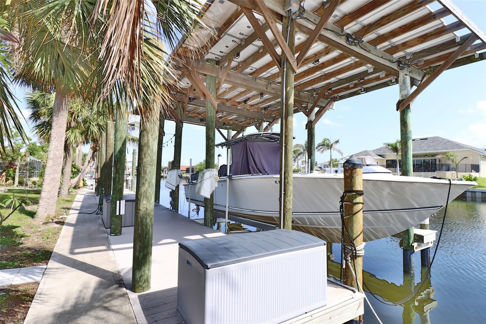 One or more photo(s) has been virtually staged. Sailboat Access & owned Solar System - Fully Remodeled Waterfront Saltwater Pool Home. This stunning 3-bedroom, 3-bath Gulf-access pool home is located in the highly desirable Beach Complex area on the southeast side of town, just a few minutes' ride to Charlotte Harbor. With deep-water sailboat access, a 13,000 lb boat lift, and additional exterior pier and pilings, it's truly a boater's dream. Outdoor Features & Boating Amenities Include: 100 feet of newer PVC sheet pile seawall Large AZEK dock with water, electric, and solar Covered boat lift (13,000 lbs), additional outer pier, and pilings for a large yacht Room for floating docks (WaveRunners or jet boats) The pilings have been left high at the dock intentionally for a possible future two-story Tiki hut. RV parking with 30-amp hookup. Newer 10' x 20' shed with metal roof. Accordion hurricane shutters for easy storm protection. Heated saltwater Pebble Tec pool with wet deck. Newer Hayward variable-speed pool pump, Shell Lock paver pool deck with LED lighting and full-view screen enclosure, Outdoor shower, and beautifully landscaped koi pond. Full gutters, privacy landscaping, banana plants, avocado trees, fig trees, and mango trees. Screened front entry. Interior Highlights & Upgrades: Completely remodeled open floor plan. Fresh interior and exterior paint three updated bathrooms New interior doors, trim, and lighting Shiplap plank detail throughout Solid maple cabinetry with quartz countertops Dual cooktops (induction + range) with outside-venting hood Bar with sink, fridge, and dishwasher Porcelain and slate tile in main areas; luxury vinyl in bedrooms Wall of thermal-pane sliding doors New LG French door fridge with dual freezer drawers and two ice makers New Bosch dishwasher and LG large-capacity washer/dryer LED indirect lighting, wood-burning stove Mini-split A/C & heat system for custom temperature control in each room. Updated electrical panel, Energy & Structural Improvements: Standing seam metal roof (2023), 36-panel, 11KW owned solar system (not leased), seven new permitted windows. Full plumbing re-pipe with new overhead PEX lines. Oversized two-car garage with ample storage. This home offers comfort, efficiency, and high-end upgrades throughout. Purchased in August 2023 for $825,000, the property has since seen over $100,000 in additional improvements. This is the home you've been waiting for. Brimming with character and overflowing with storage, it offers something most homes don't- room for everything you love. The thoughtful design and long list of amenities make this home as practical as it is inviting. You won't have to worry about a failing concrete bulkhead or costly repairs; everything has already been done. Just bring your boats/yachts, water toys, and love for waterfront living. Homes like this are rare, and they don't last long. Schedule your showing today!