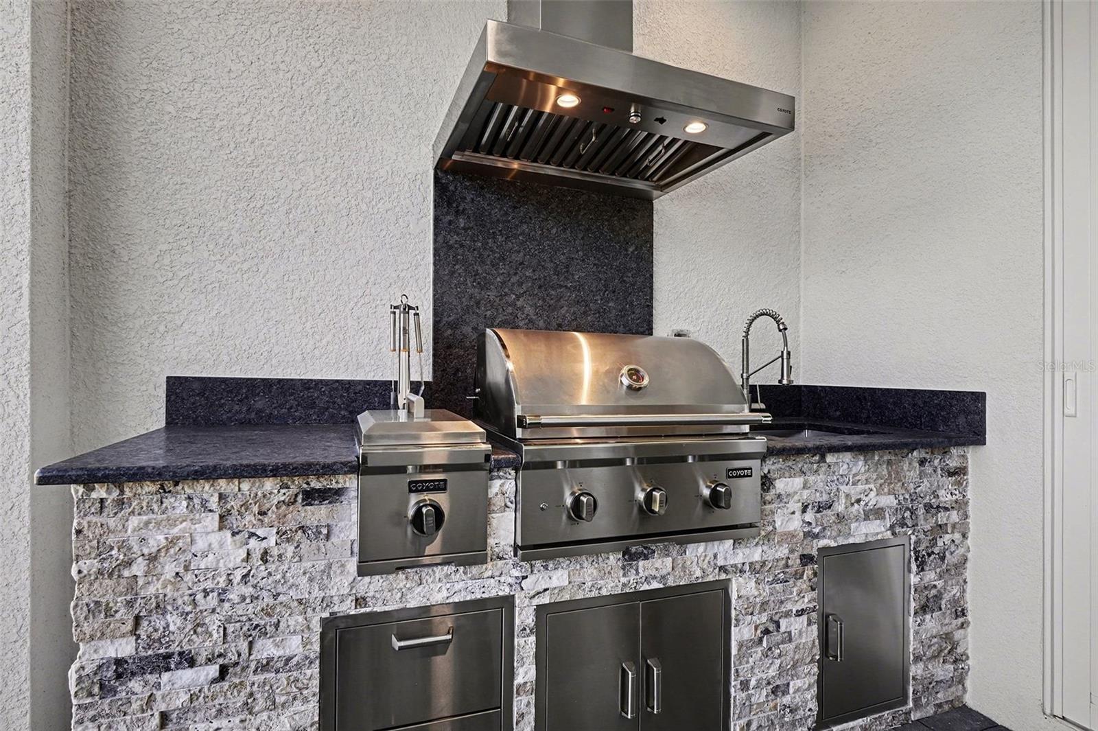 Exterior: Lighting, Outdoor Kitchen, Rain Gutters, Sidewalk, Sliding Doors