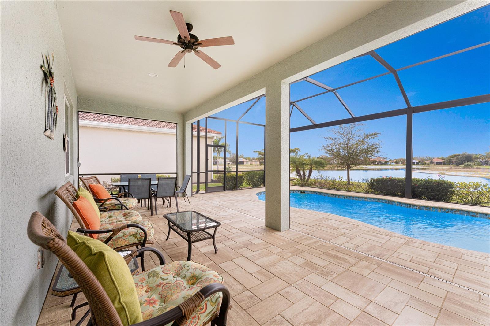 IMPRESSIVE and charming 1 story home located in the RIVER CLUB in lovely gated community in Port Charlotte. Location is 1 mile off 75 South. This home offers western exposure with breathaking sunsets overlooking lake with beautiful tropical birds. The refreshing heated saltwater pool , surrounded with beautiful pavers with a high Clearview screened pool cage becomes your most popular area. This is one of the few private pools in River Club. The home offers an open and split bedroom floor plan with grand foyer and tray ceiling in living , and high ceilings in all rooms. Recessed lighting in living room and kitchen. , Primary bath has 2 granite top vanities with cabinets in primary bath walk in shower. There is a granite counter top sink in second bath with tub. Linen closet in primary bath and another in hallway by 2nd bathroom. Coat closet in front hallway. Guest bedrooms are off front hallway, with 1 of them set up as an office with sofa bed. All windows in bedrooms, dining area, have plantation shutters. Heavy storm door was installed at front door lanai. Hurricane remotes at front lanai and 3 in pool lanai. Tile roof and exterior of home professionally cleaned. The spacious two car garage includes overhead storage & remote. A Hurricane garage door as well as a pull down garage door screen. Pavers on driveway. Overhead fans throughout home and in lanai. Huge pantry and storage room off Kitchen .Custom VERTIGLIDE accordian blinds in LIVING ROOM AND DINING to block sun when desired. Bedrooms carpeted tile floors throughout rest of the home. Alliant HOA professionally manages River Club. HOA dues include TV, Internet, and pruning shrubbery, sprinkler system. Best neighbors. Community pool, gym and meeting room in section 2. Located 2 miles to Peace River bridge. Punta Gorda airport 10 minute drive . Fort Myers Airport 45 minutes. Super location conveniently located. Never rented.