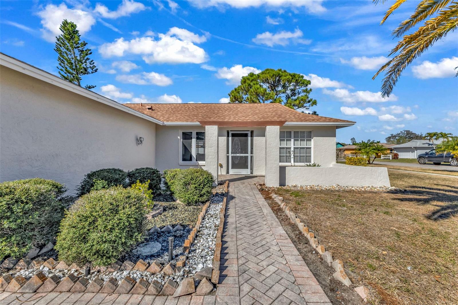 Welcome to 4318 Eastwood Dr, a lovely three bedroom plus BONUS ROOM, two bathroom, two car garage, POOL HOME, located in the quaint and popular community of Tamaron! This home features just under 1600 square feet of living space, a split floorplan, and sits on an OVERSIZED CORNER LOT. You will also find a spacious front porch for you to enjoy the Florida sunshine, and a screen enclosure in back for pool parties or relaxing nights with family and friends. Several updates have been made so you can simply move in and enjoy your new home, including a NEWER SHINGLE ROOF (2018), NEWER POOL PUMP (2024), and FRESHLY PAINTED INTERIOR AND EXTERIOR!Don't forget to check out the INCLUDED FLOORPLAN and 3D VIRTUAL TOUR to get a great idea of this home's layout before calling your favorite real estate agent to see the home in person! The community of Tamaron offers low HOA fees, sidewalks, lake views, and opportunities to meet friendly neighbors, and is conveniently located near Bahia Vista St and McIntosh Rd for easy access to all the great shops, dining, and entertainment Sarasota has to offer. Stop by today to see this wonderful home, it's just what you've been looking for!
