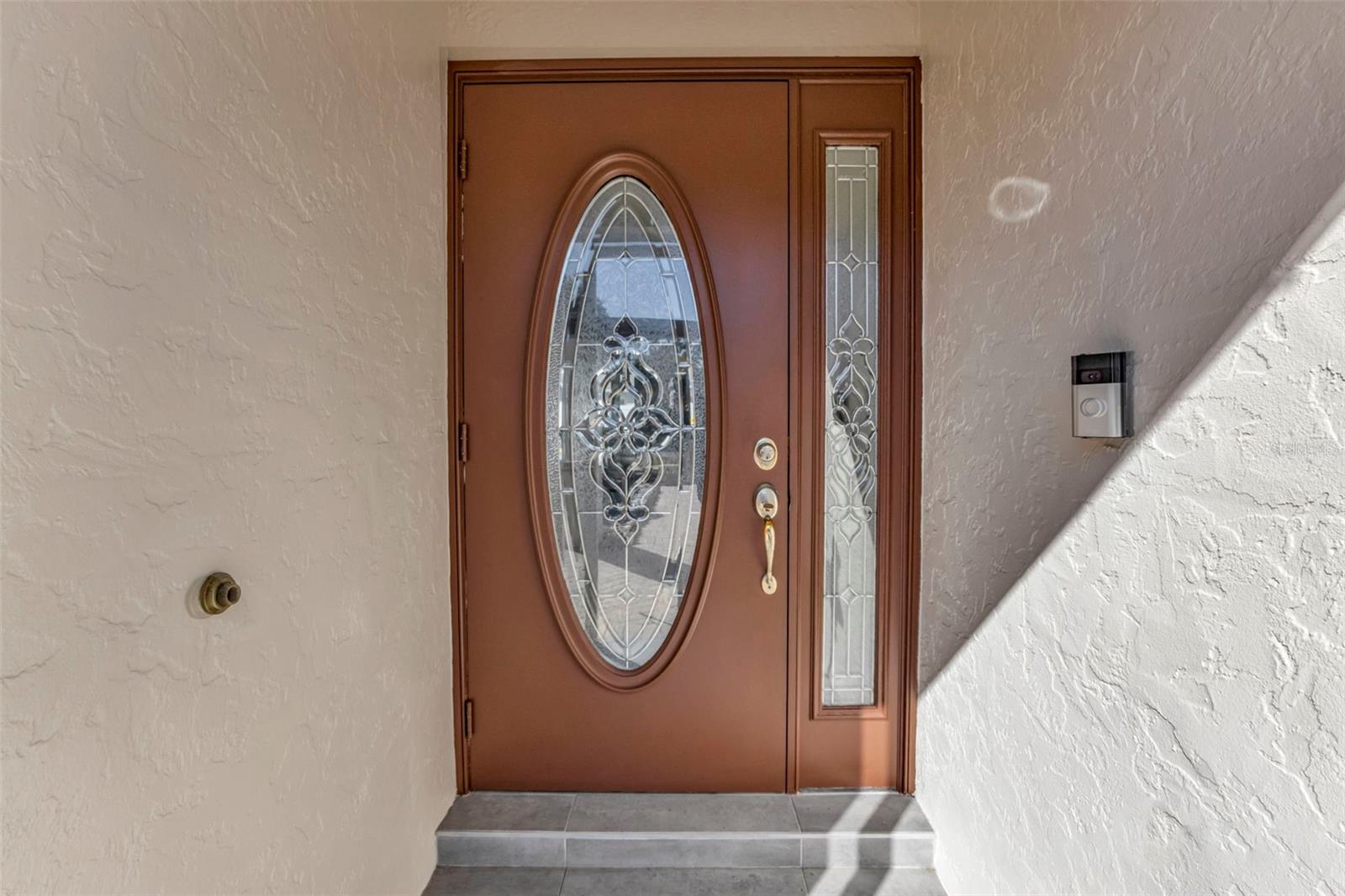 Exterior: Lighting, Rain Gutters, Sidewalk, Sliding Doors