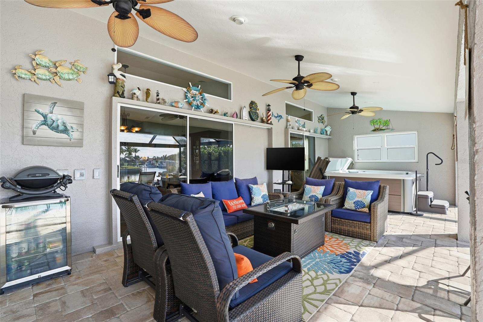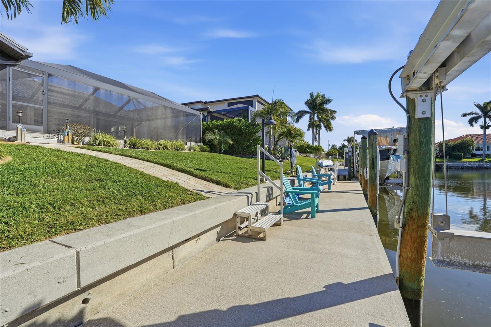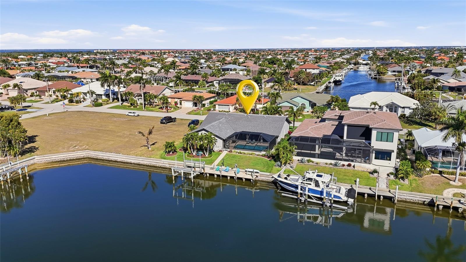 Experience luxury waterfront living in this stunning 4 bedroom, 2 bathroom, 2-car oversized garage pool home boasting 80 feet of water frontage and a private concrete dock with a 20,000-lb boat lift--perfect for boating enthusiasts and waterfront lifestyle lovers - JUST MINUTES TO CHARLOTTE HARBOR. Extra wide canal and turning basin that can accommodate a deep draft sailboat or large boat. This home remained high and dry through the last 3 hurricanes! NO HOA FEES! CLICK ON THE VIRTUAL TOUR LINK 1 FOR THE VIDEO AND VIRTUAL LINK 2 FOR THE 3D TOUR. Designed with a bright and airy floor plan, this home features tile throughout, high vaulted ceilings, and an inviting layout ideal for both everyday living and entertaining. The eat-in kitchen is a chef's dream, showcasing stainless steel KitchenAid appliances, a gas range, built-in oven & microwave, granite countertops, and abundant cabinetry. A center island with a high-top breakfast bar, along with a deep dual-basin sink with instant hot water dispenser, kitchen reverse osmosis system and a built-in under-counter icemaker completes the space. Just off the kitchen, the spacious living and dining areas offer plenty of room to gather with family and friends while enjoying seamless indoor-outdoor flow. The primary suite is a true retreat, featuring a glass slider to the lanai, dual closets with custom shelving, and a spa-inspired en-suite bathroom with split vanities and a large walk-in shower equipped with an overhead rain showerhead, wall jets, and a built-in sitting bench. One guest bedroom is conveniently located near the front of the home, making it ideal as a home office, media room, home gym, or guest space. The additional 2 guest bedrooms are situated on a split-bedroom floor plan, each offering walk-in closets with custom shelving and access to a nearby guest bathroom with a walk-in shower and lanai access. Step outside to your private waterfront oasis, where the expansive lanai features a 12-ft lanai roofline, ample space for entertaining, and a 2023 standalone 6-person hot tub. The heated pool (new heater in 2023) allows for year-round enjoyment and is enhanced by panoramic view screening and a convenient outdoor shower. Whether you're casting a line at sunset or setting sail for endless water adventures, this exceptional home offers the ultimate Florida waterfront lifestyle from your own private dock. The 2-car garage offers an additional 9x12 bonus space, perfect for extra storage or parking a longer vehicle. 2025 TILE ROOF - 2022 SPLIT ZONE AC UNITS - 2025 BUILT IN OVEN/MICROWAVE - 2025 REFRIGERATOR - 125 GAL OWNED PROPANE TANK - IMPACT WINDOWS - ACCORDIAN SHUTTER; BACK LANAI & FRONT DOOR - 2025 EXTERIOR PAINT - 2025 NEW CLEAR VIEW SCREEN CAGE - 2025 MOTOR & CABLES FOR BOAT LIFT - WHOLE HOME WATER SOFTENER - KITCHEN REVERSE OSMOSIS SYSTEM - GAS RANGE & HOTWATER HEATER - LUSH LANDSCAPING WITH FULL IRRIGATION SYSTEM. Enjoy all the amenities that Punta Gorda has to offer, such as biking, fishing, boating, dining, live entertainment, and much more! Within walking to Fisherman's Village, and a short ride to Ponce De Leon Park, Gilcrest Park, and Historical Downtown Punta Gorda. Also, minutes to award-winning beaches such as Englewood Beach, Manasota Key & Stump Pass, to name a few!! Schedule your private tour TODAY!