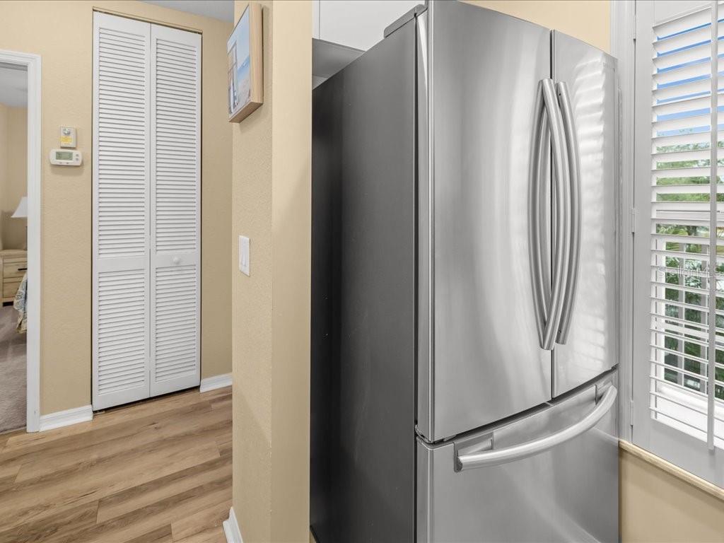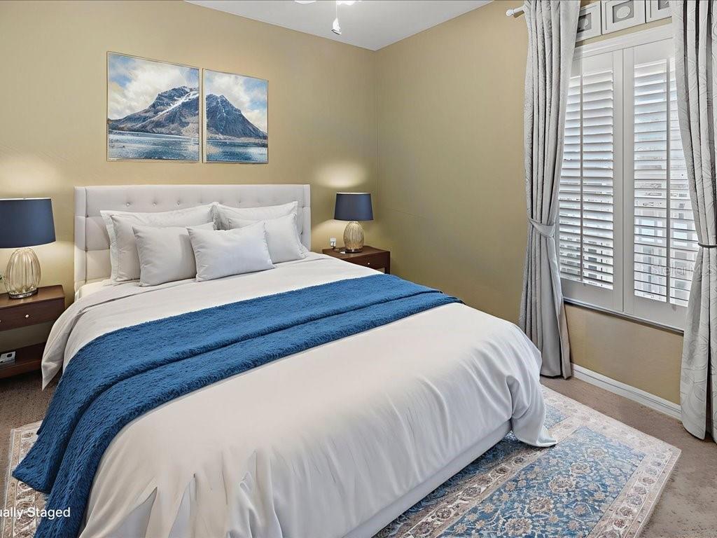 One or more photo(s) has been virtually staged. WELCOME to resort style living in the popular community of Heritage Lake Park! This lovely bright and sunny 2nd floor end unit features an open floorplan that offers views immediately upon entering the home. This home was meticulously maintained and is truly MOVE IN READY! A tastefully neutral pallet of colors throughout allows you to easily personalize your home. Laminate wood flooring in all common areas and bathrooms is as beautiful as it is durable. The kitchen boasts an extremely functional layout and features laminate cabinets and counters, stainless appliances and a breakfast counter all open to the great room with views to the lanai and beyond. Primary bedroom located at the rear of the unit is carpeted and has a large walk in closet, an en-suite primary bath (5x12), lots of counter space, laminate cabinets and countertop, a large shower and a linen closet. The split bedroom floor plan features the second bedroom at the front of the unit for guests' privacy and has views to the front of the building. The Guest bath, (5x12 ), features a tub/shower, laminate cabinets and countertop and a laundry closet with included stackable washer & dryer. Sunshine abounds in the spacious great room and dining area which are perfect for entertaining or just a quiet time at home enjoying the lovely views. Other features in the home are ceiling fans in the bedrooms, great room and lanai, wooden shutters on all windows, all appliances stay, designated space in NEW carport, and a new HW heater installed in Nov.25'. Enjoy a morning coffee on your private screened lanai before you head out on a leisurely stroll through the picturesque community or possibly go to the fitness center, tennis/pickle ball courts or a swim in the community pool. There's just so much to do! Large gatherings or events can be planned at the large community clubhouse. Community and Building features: New Roof, Building elevator, Gated entry, central mailboxes, Clubhouse, heated Pool, Exercise Room, and Tennis/Pickle ball Courts. THIS IS TRULY A MUST SEE!