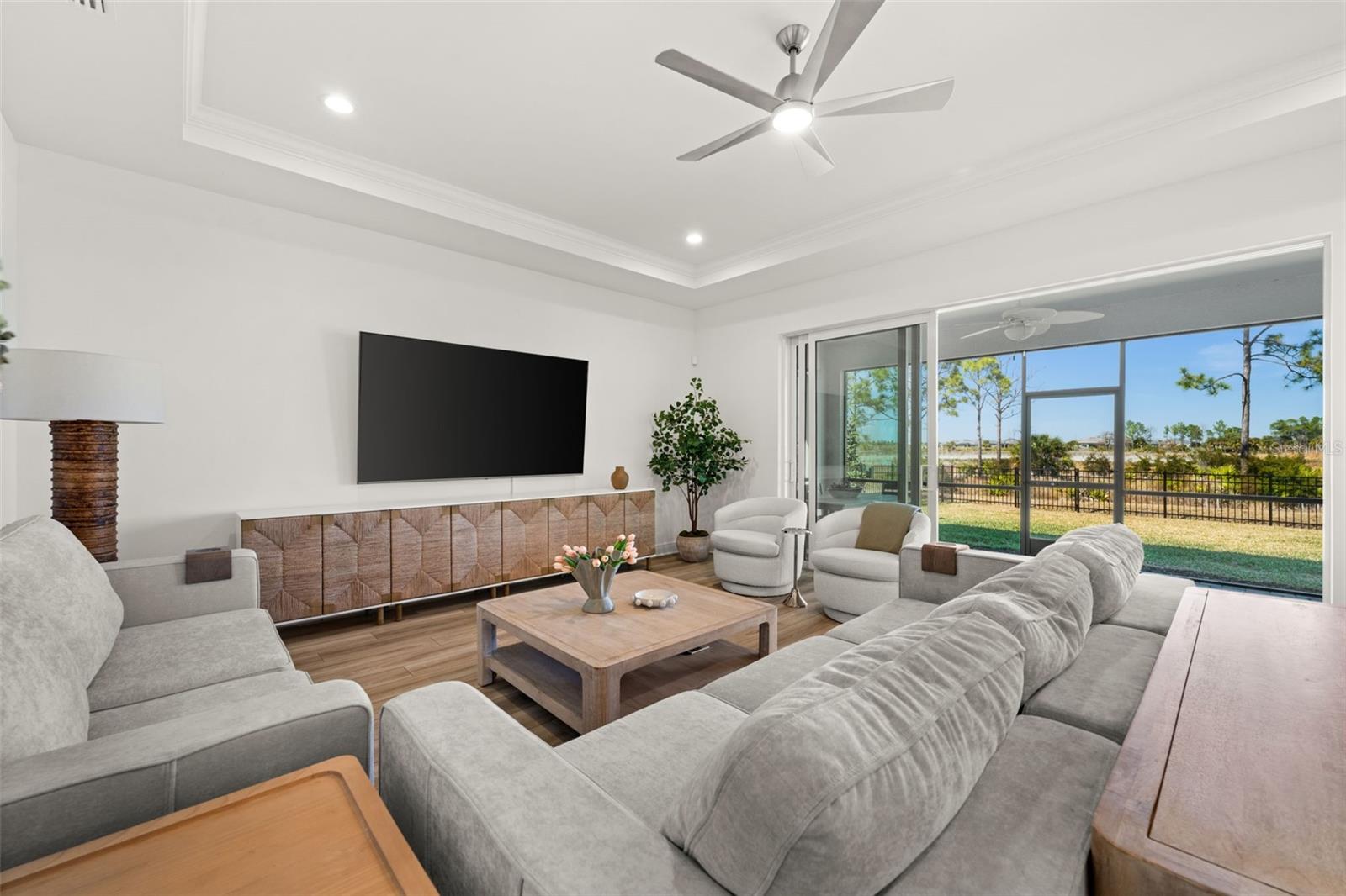 Welcome to this beautifully appointed home located in the sought after Sanctuary neighborhood of Babcock Ranch. This thoughtfully designed residence offers 3 bedrooms plus a den, 2.5 bathrooms, and a 3-car garage, blending upscale finishes with modern everyday comfort. Offered fully turnkey, the home showcases beautiful furnishings that elevate the space while remaining inviting and functional. The gourmet kitchen features quality finishes like quartz countertops and a wall oven. The open layout is perfect for both entertaining and daily living, and is complemented by upgrades throughout the home that reflect pride of ownership. Enjoy seamless indoor-outdoor living with 8' sliding glass doors, a screened lanai overlooking a large fenced yard, and tranquil preserve views, creating a private retreat ideal for relaxing or hosting guests. The primary suite is a tranquil oasis tucked away in the back of the house, while 2 additional bedrooms and a den at the front of the house offer nice separation of living space for guests and remote workers. Located in America's first solar-powered town, residents of Babcock Ranch enjoy access to resort-style amenities, miles of trails, lakes, dining, and vibrant community events--all while embracing a modern, sustainable lifestyle. The Sanctuary offers its own private pool, playgrounds, and pickleball courts (coming soon!). This is a rare opportunity to own a luxury-inspired turnkey home at an approachable price point in one of Babcock Ranch's most desirable gated communities.