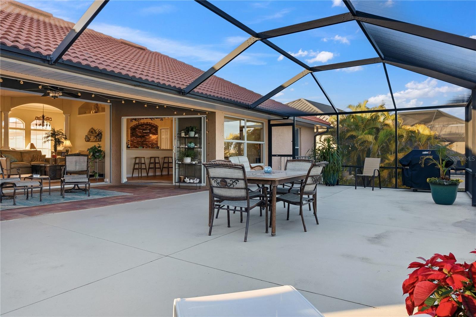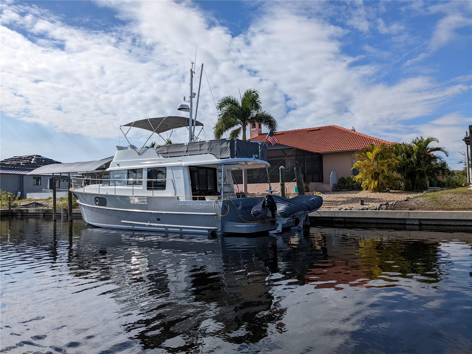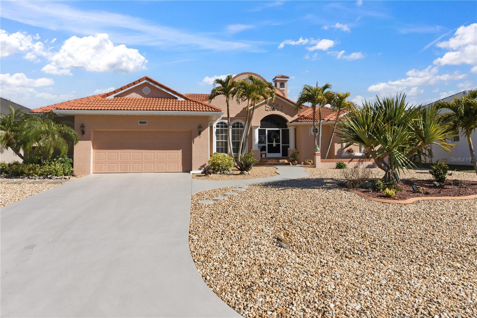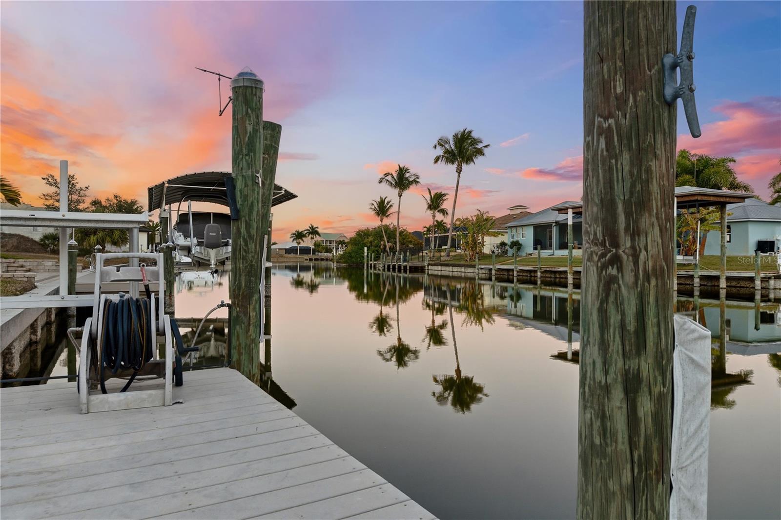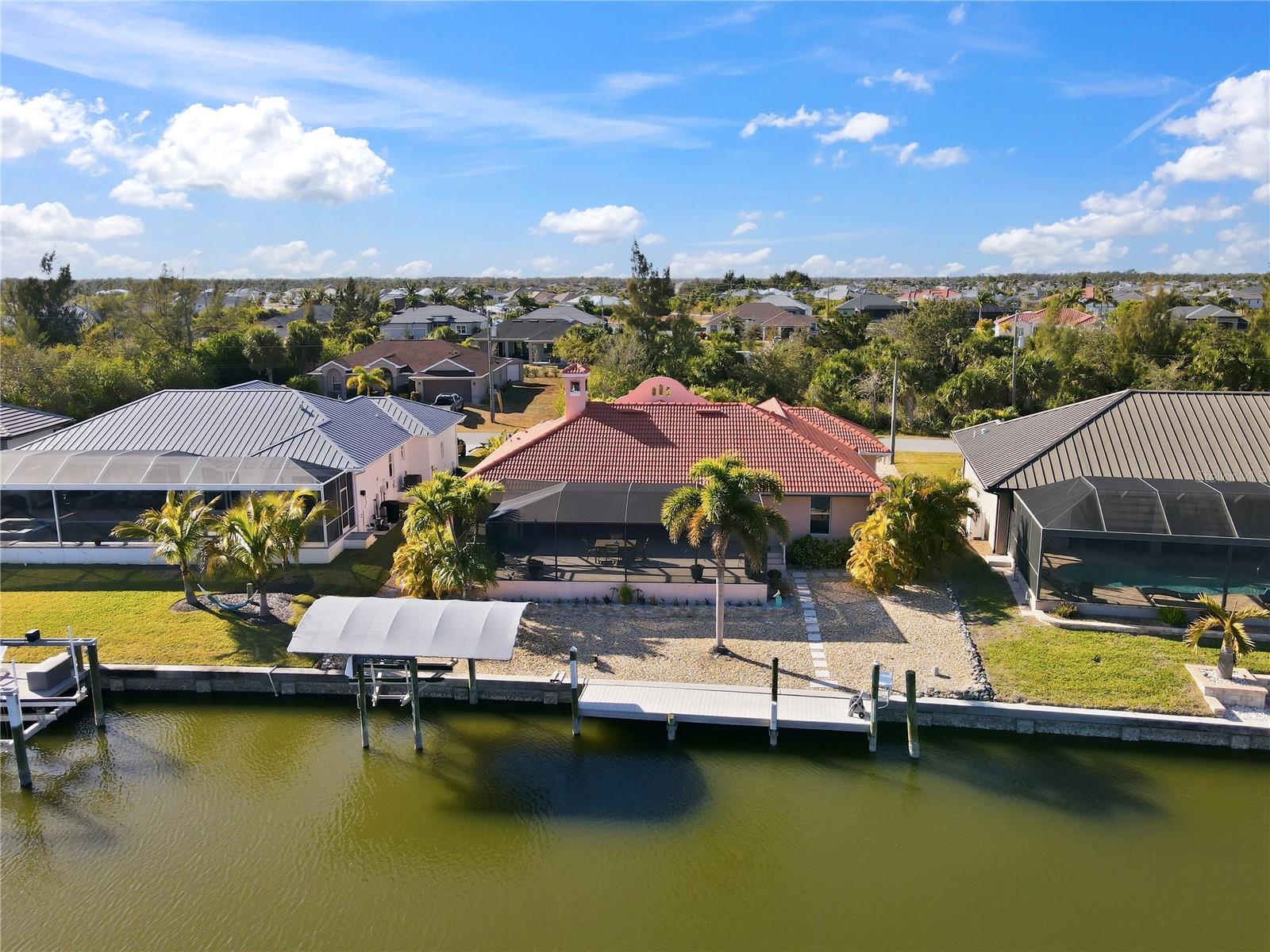Waterfront living--thoughtfully designed and ideally positioned.Located in the northern section of South Gulf Cove, this beautifully maintained three-bedroom, two-bath waterfront home offers no fixed bridges, quick access to the lock, and approximately ten minutes to Charlotte Harbor and the Gulf. With approximately seventy-five feet of concrete seawall, a 30-foot composite dock equipped with 50amp shore power + a regular 110 service and water capable of accommodating a 45ft yacht plus a 6,500-lb covered boat lift, this setup is designed for real-world boating.Inside, the home features a warm Southwest and Mediterranean-inspired aesthetic paired with a functional, open layout. Double entry doors lead into a vaulted great room where full-length sliders bring in natural light and create a seamless connection to the outdoors. A wood-burning fireplace adds character and comfort, while a flexible adjacent space works well as a home office or formal dining area.The kitchen is both practical and inviting, offering water views, a breakfast bar, and a bright dining area that opens directly to the lanai--ideal for everyday living or entertaining. The primary suite is spacious and well-appointed, featuring a tray ceiling, lanai access, a large walk-in closet, and an en suite bath with soaking tub and walk-in Roman shower.Outdoor living is where this home truly shines. The covered lanai with exposed beams provides an ideal space to relax or entertain, while the stand-alone hot tub offers a private place to unwind. The home was intentionally designed without a pool to keep maintenance low; however, a reinforced stem wall is already in place should a future owner choose to add one.Additional highlights include a new hot water heater (2024), 4-ton 17-SEER A/C system (2023), a recently cleaned tile roof, generous garage storage, attic space, and low-maintenance landscaping with no lawn to mow. An optional HOA, community boat ramp, miles of walking and biking paths, and seasonal neighborhood events further enhance the appeal.Conveniently located between Englewood and Port Charlotte, close to Boca Grande & Englewood beach, golf courses, dining, shopping, and world-class fishing, this home delivers the waterfront lifestyle you've always wanted.